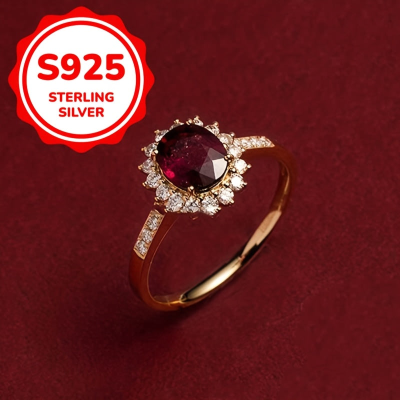 Ayollar uchun Oval Qizil Gul va To'rt Tishli O'rnatish bilan Nafis 925 Kumush Gul Halqa