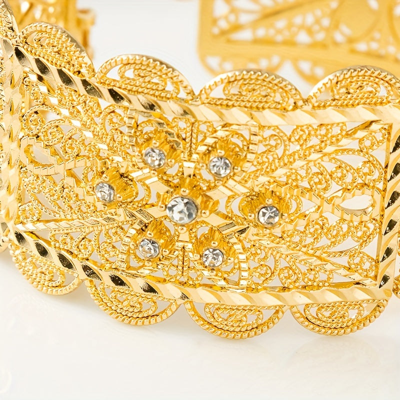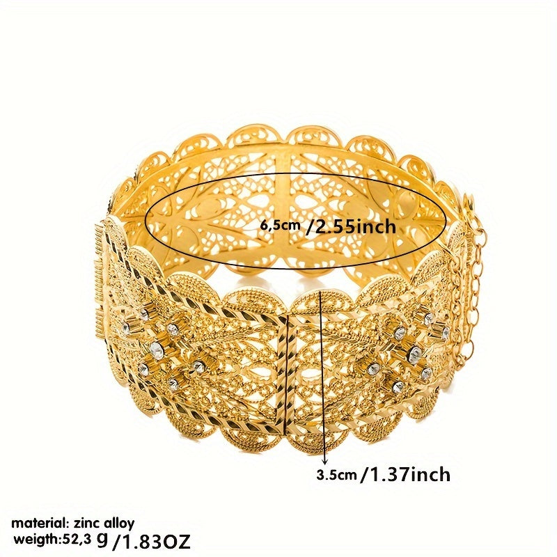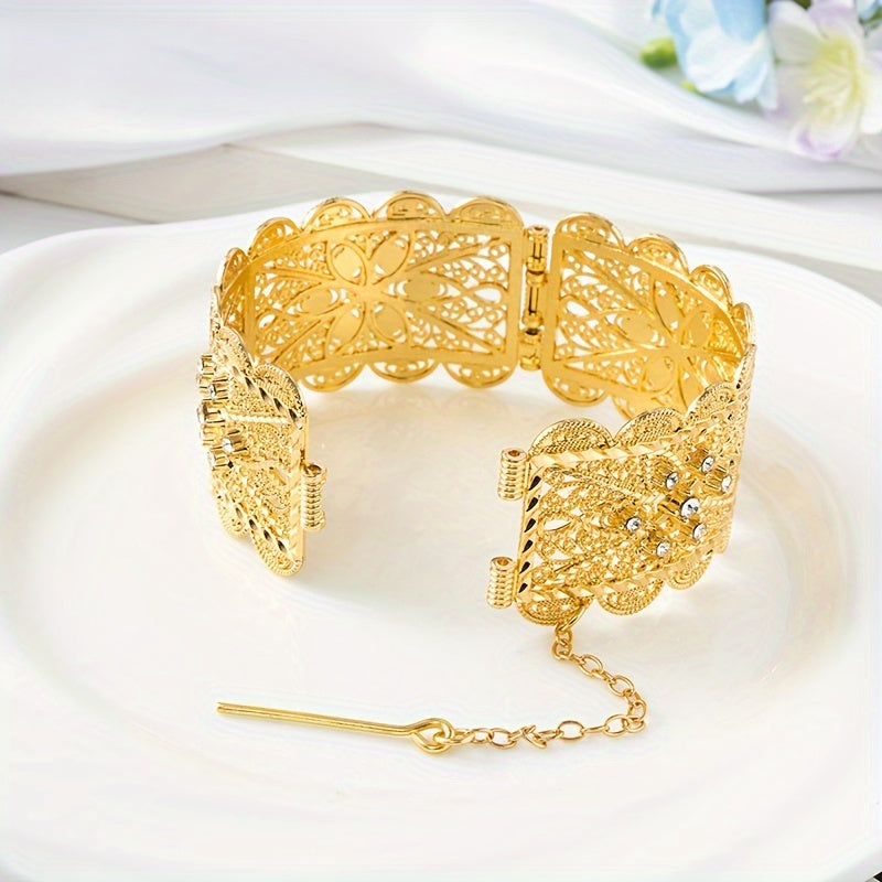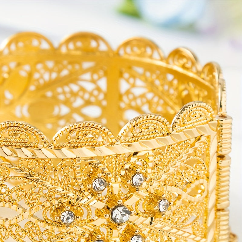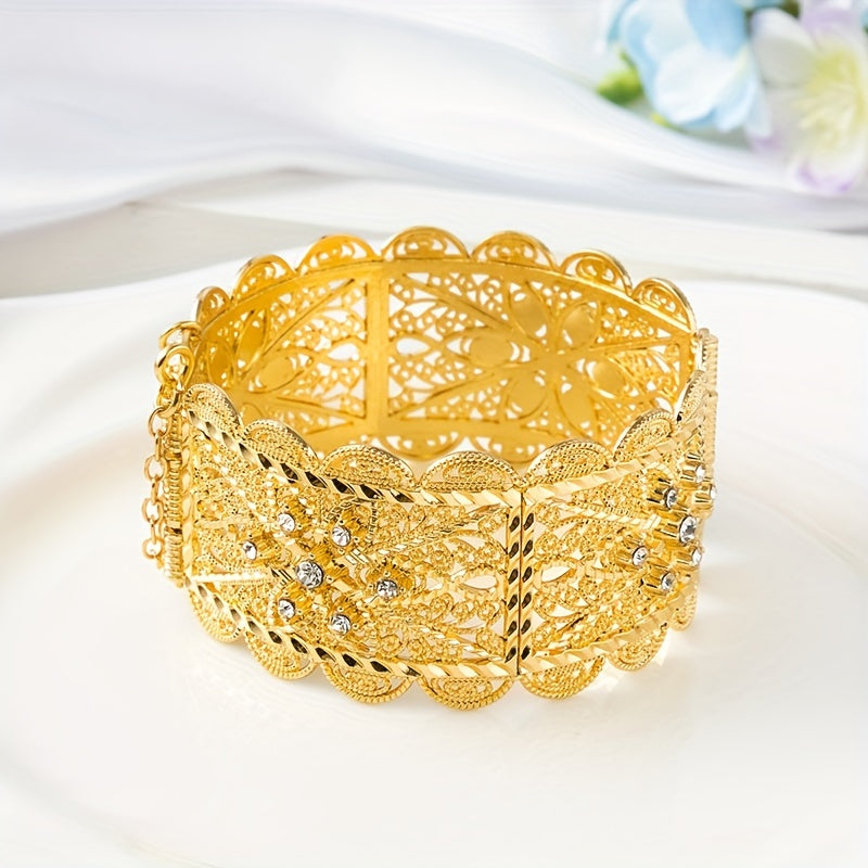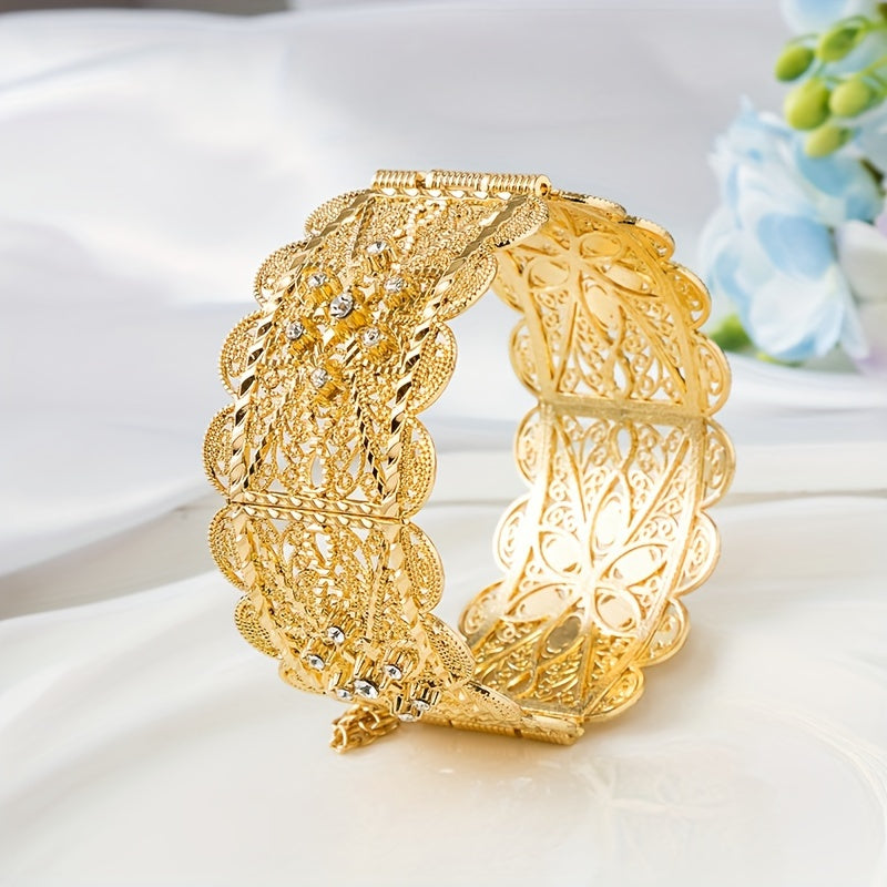 Zarif Vintage-ilhomlangan to'y bangle oltin qoplama bilan, murakkab bo'sh o'yilgan dizayn va porloq kubik zirkoniya tafsilotlari - to'ylar va rasmiy tadbirlar uchun ideal