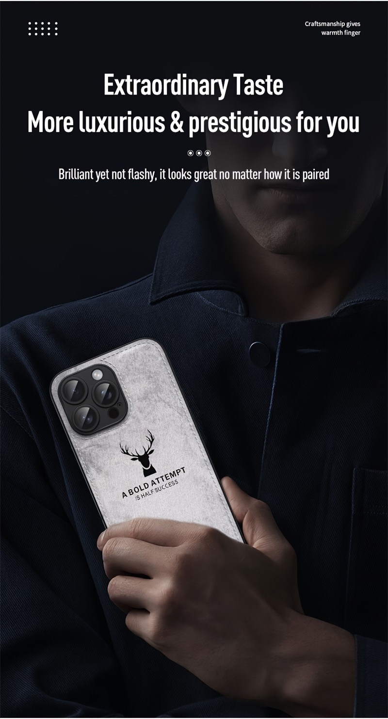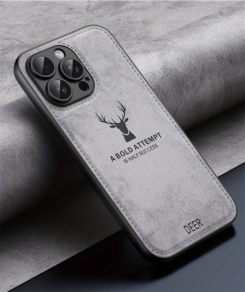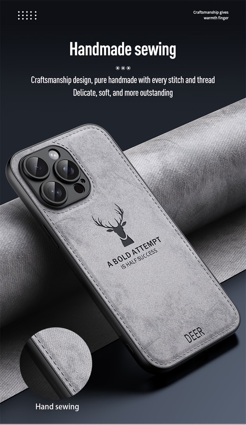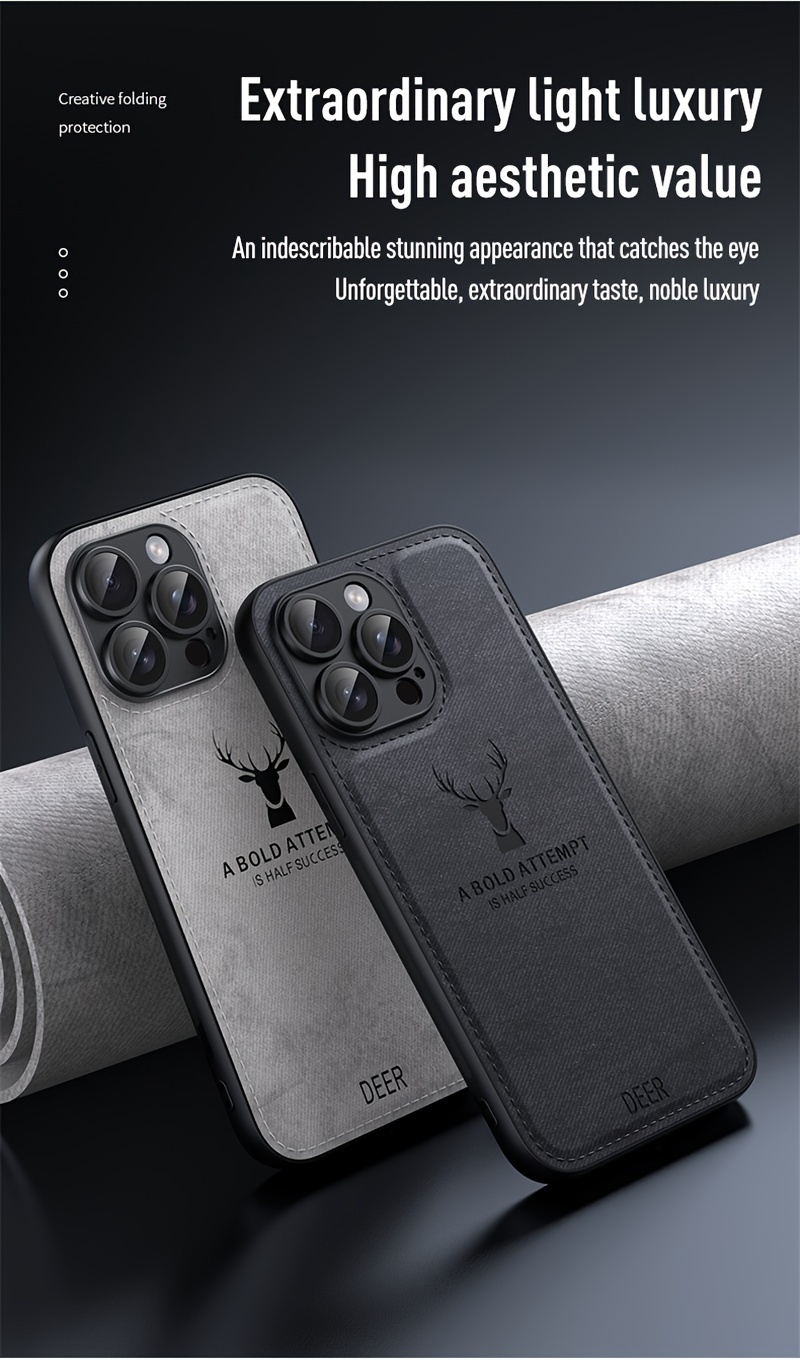 Faux teridan yasalgan kiyik boshli telefon qopqog'i iPhone uchun zarbaga chidamli dizayn va ingichka hashamatli dizayn bilan, 201.17 sm dan tushishga chidamli, iPhone 15 ProMax, 14Plus, 13Pro, 12, 11ProMax uchun mos keladi.