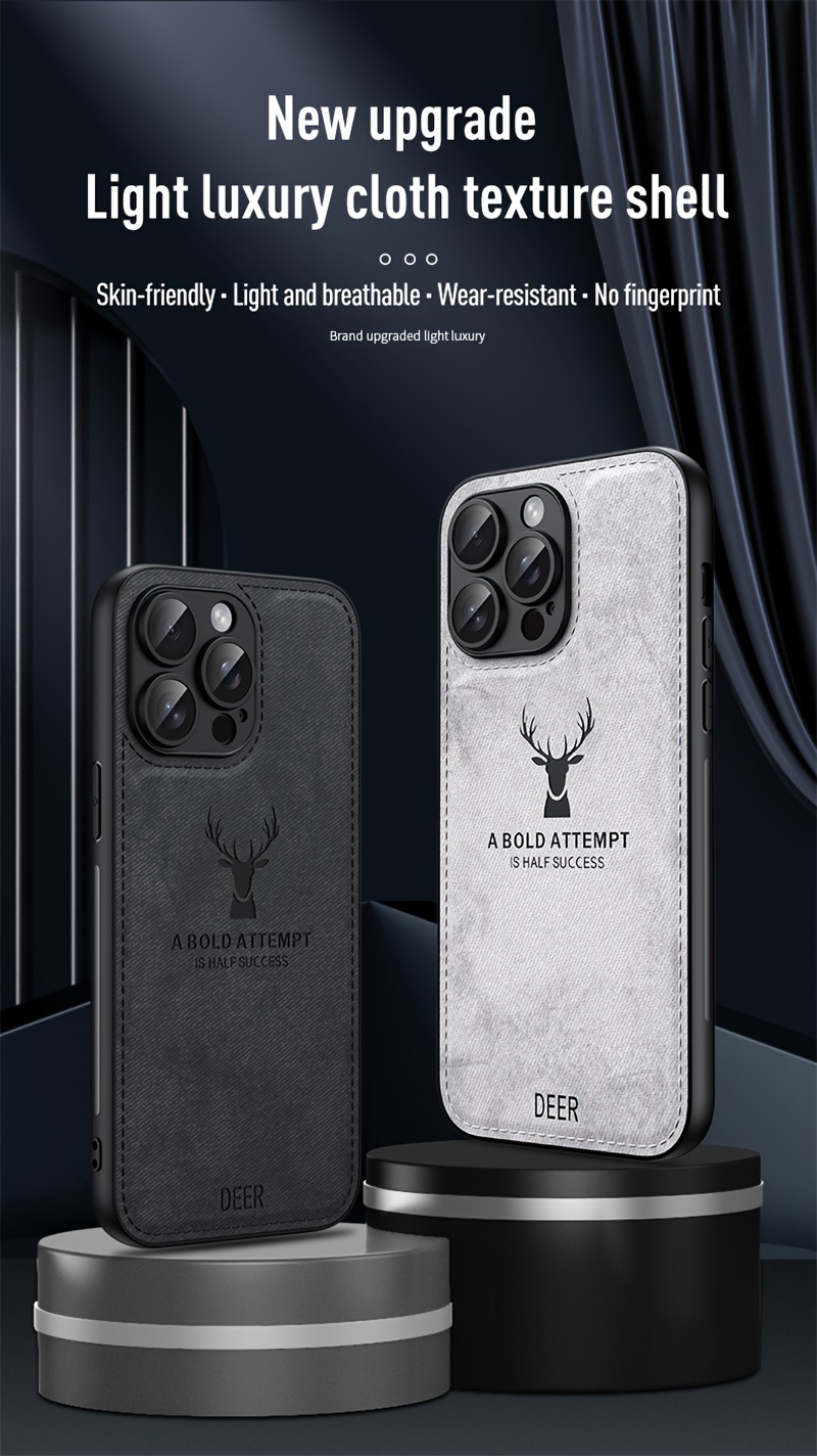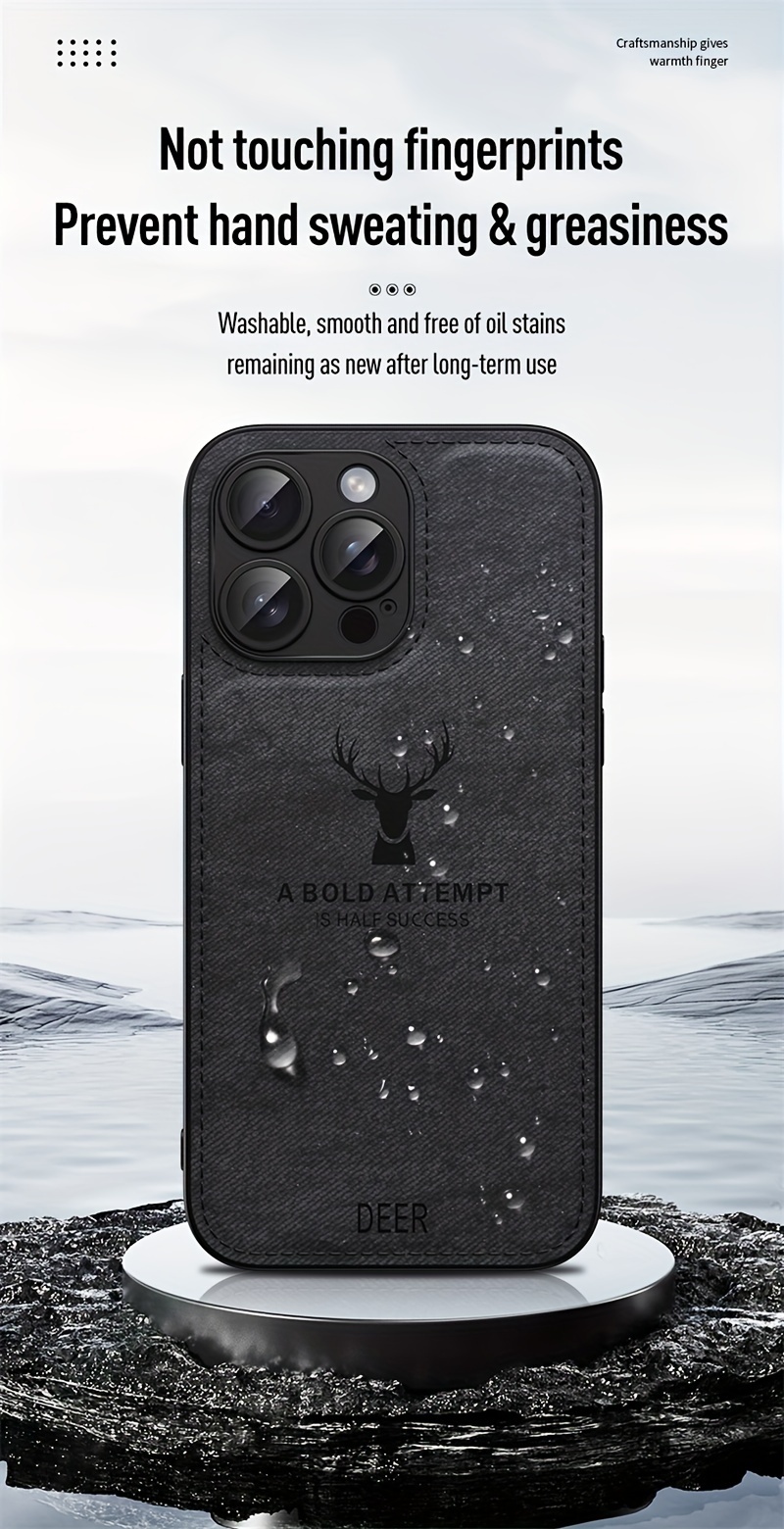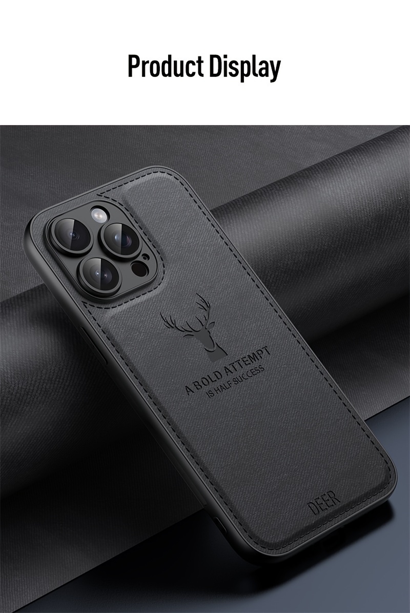 Faux teridan yasalgan kiyik boshli telefon qopqog'i iPhone uchun zarbaga chidamli dizayn va ingichka hashamatli dizayn bilan, 201.17 sm dan tushishga chidamli, iPhone 15 ProMax, 14Plus, 13Pro, 12, 11ProMax uchun mos keladi.