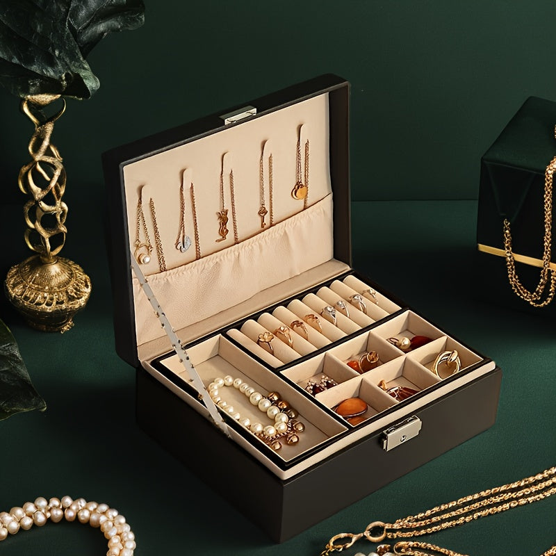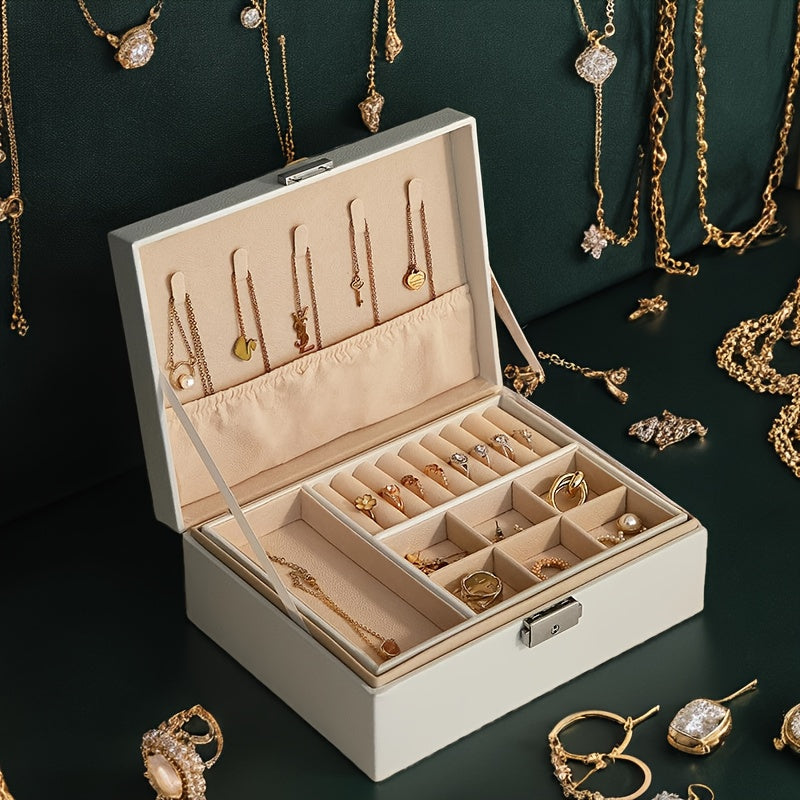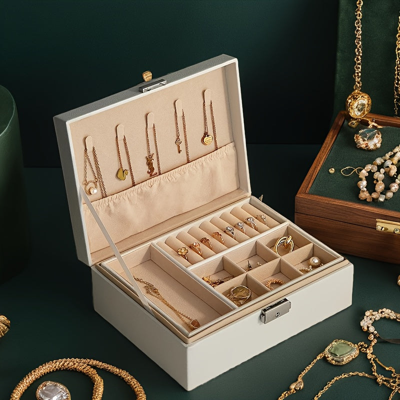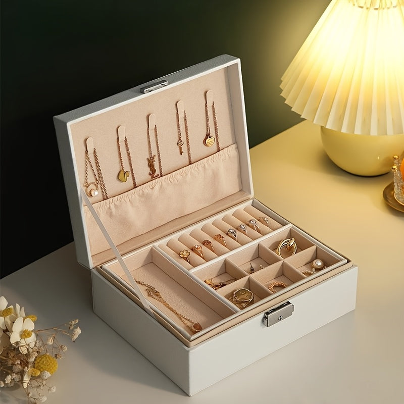 Yolgʻon charm bilan qulflangan ayollar aksessuarlari uchun ikki qavatli tashkilotchi bilan charm o‘ymakorlik qutisi