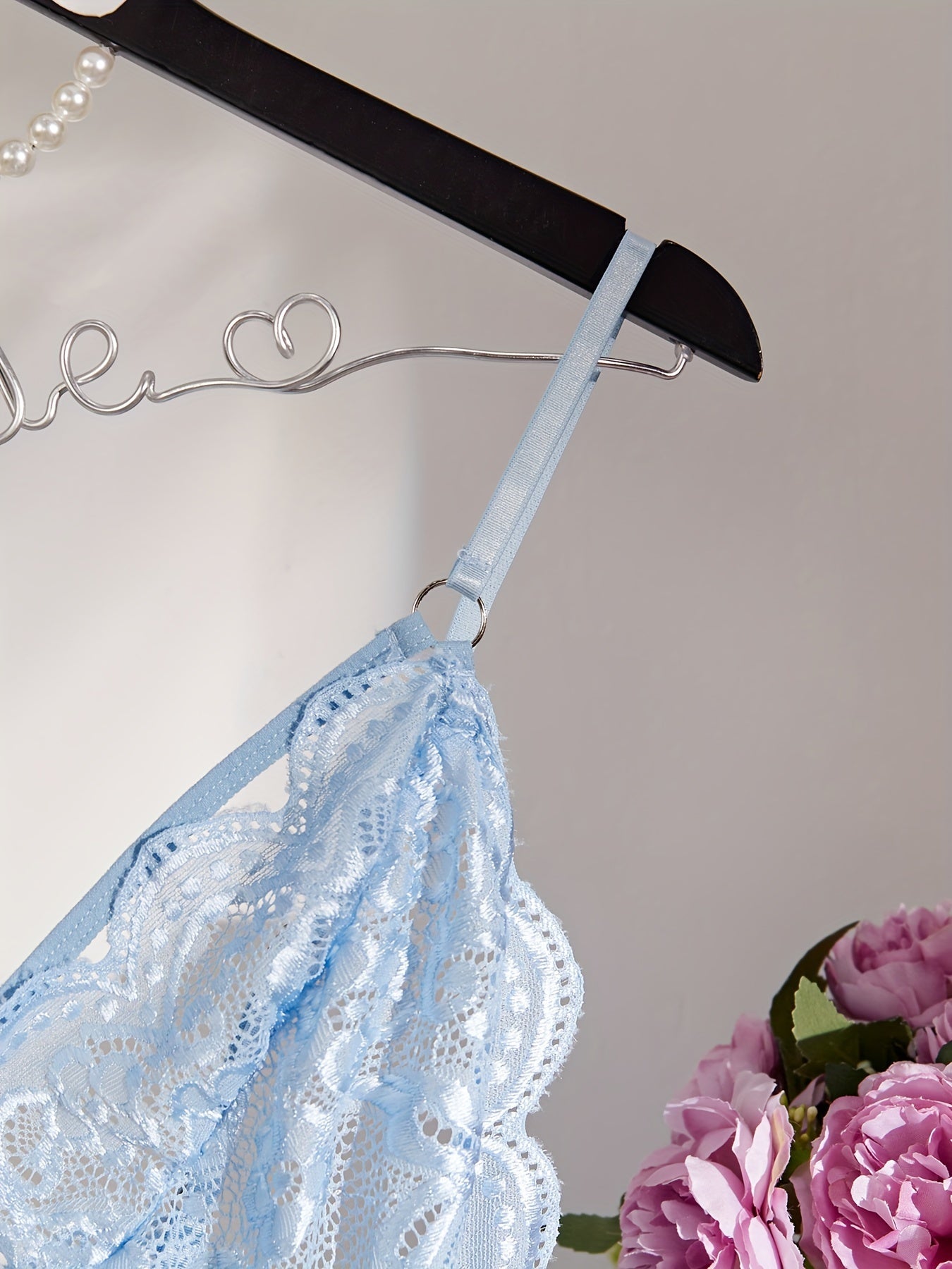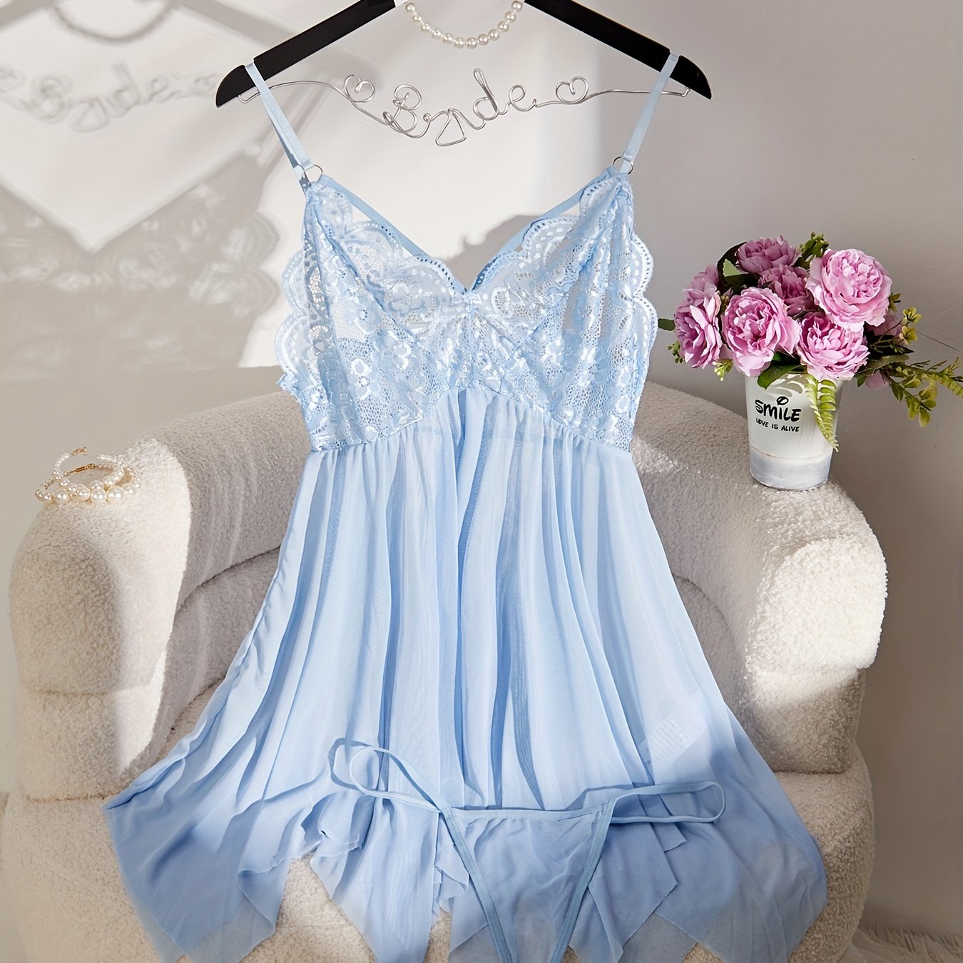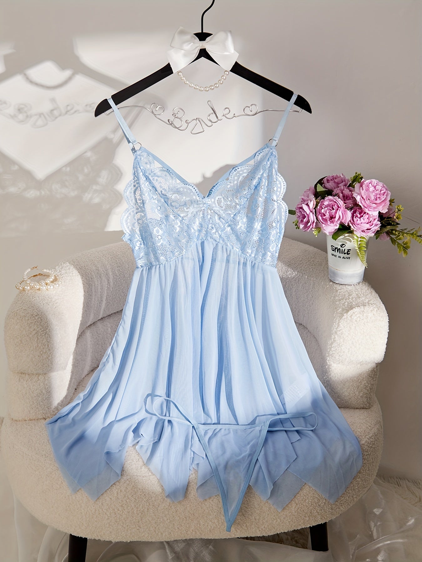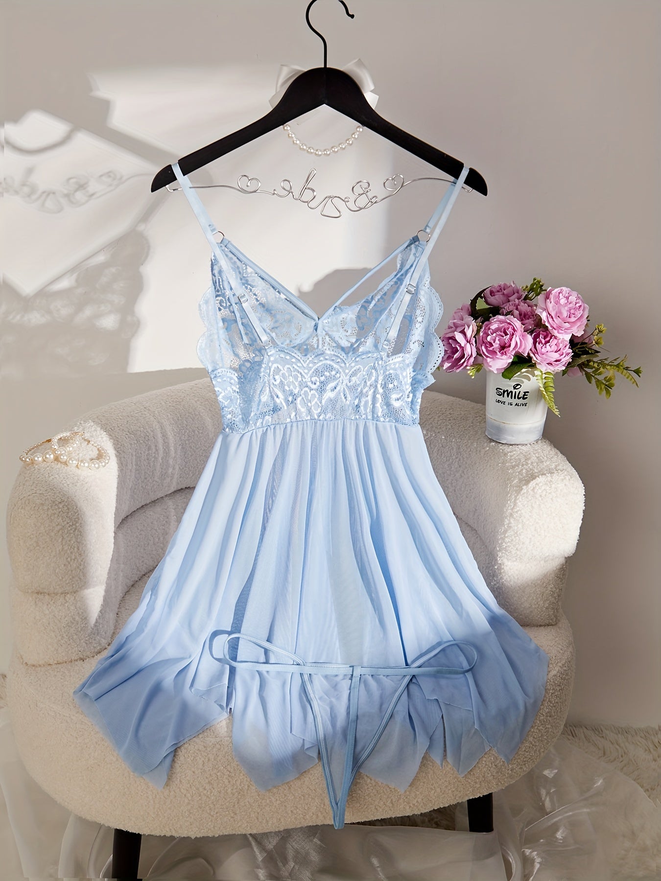Ayollarga mo'ljallangan dantel va shaffof slip ko'ylak to'plami, mos keluvchi thong bilan, maxsus tadbirlar va yaqin lahzalar uchun mukammal. V-yuqa va ruffle tafsilotlari bilan, polyester aralashmasidan tayyorlangan va qo'l bilan.