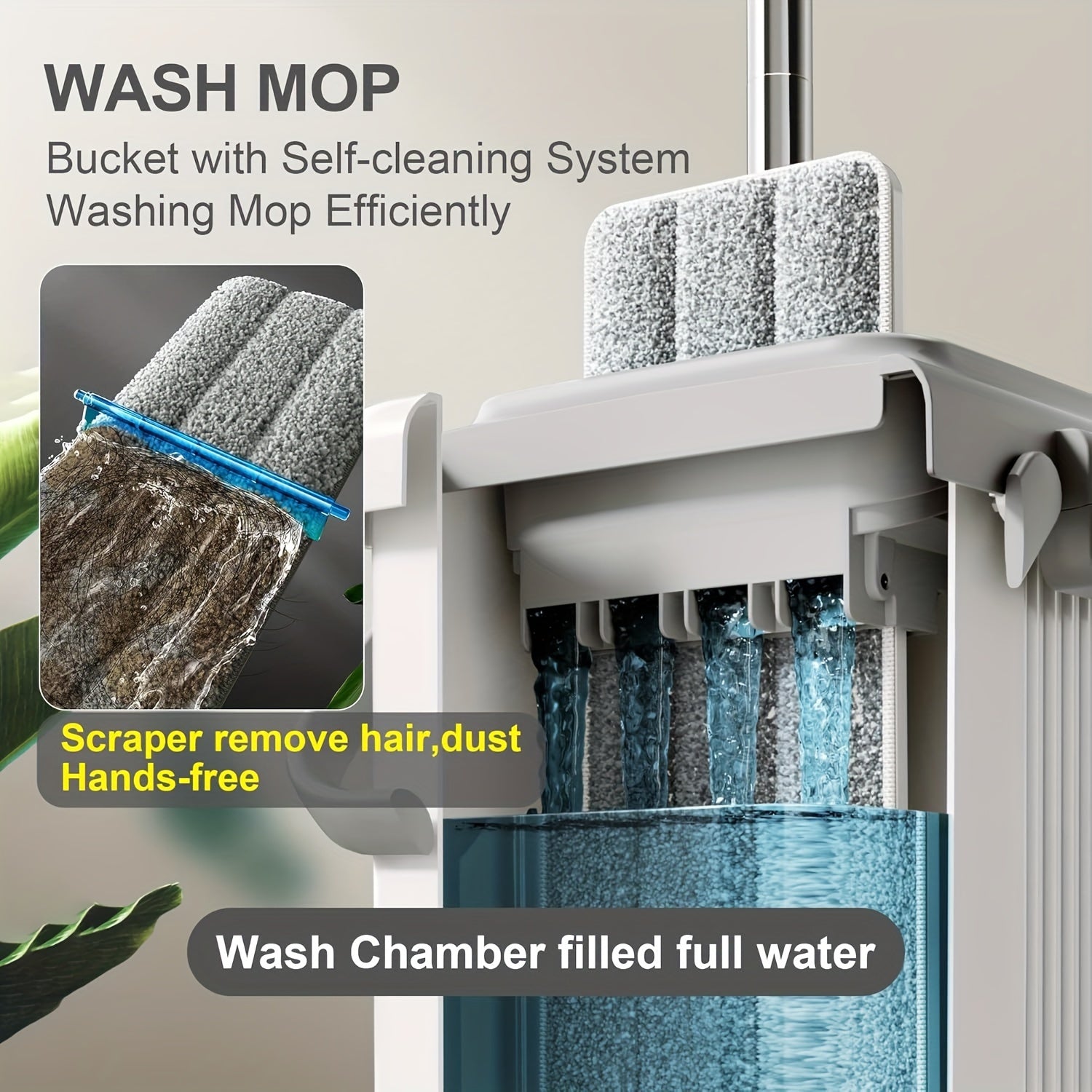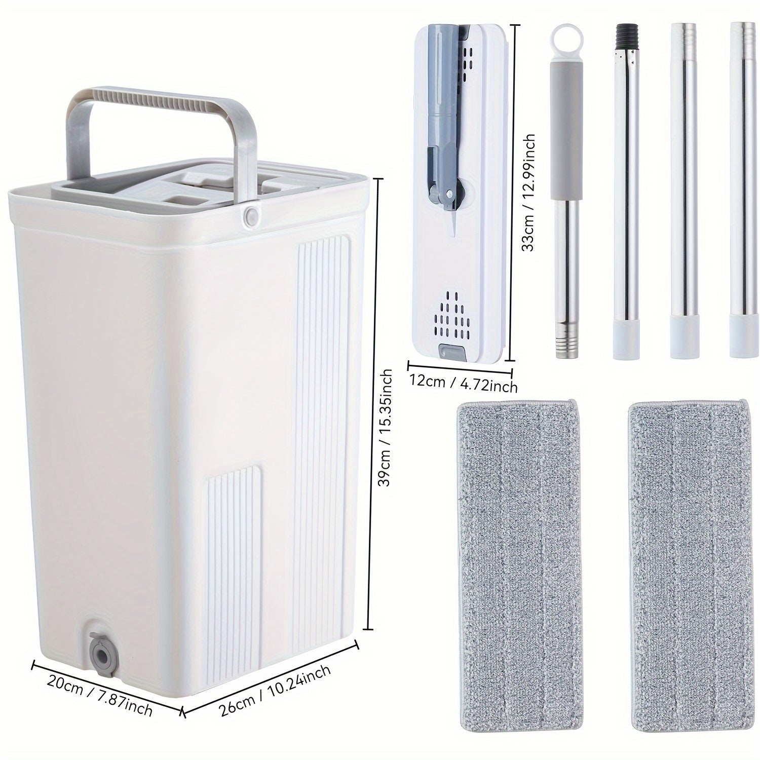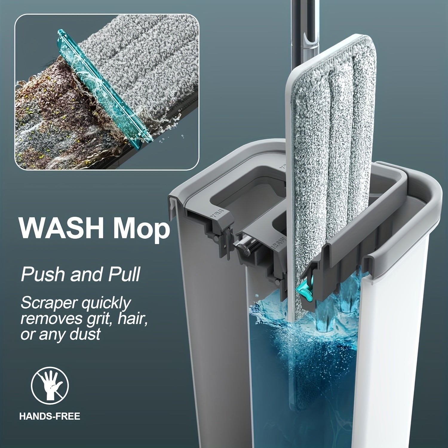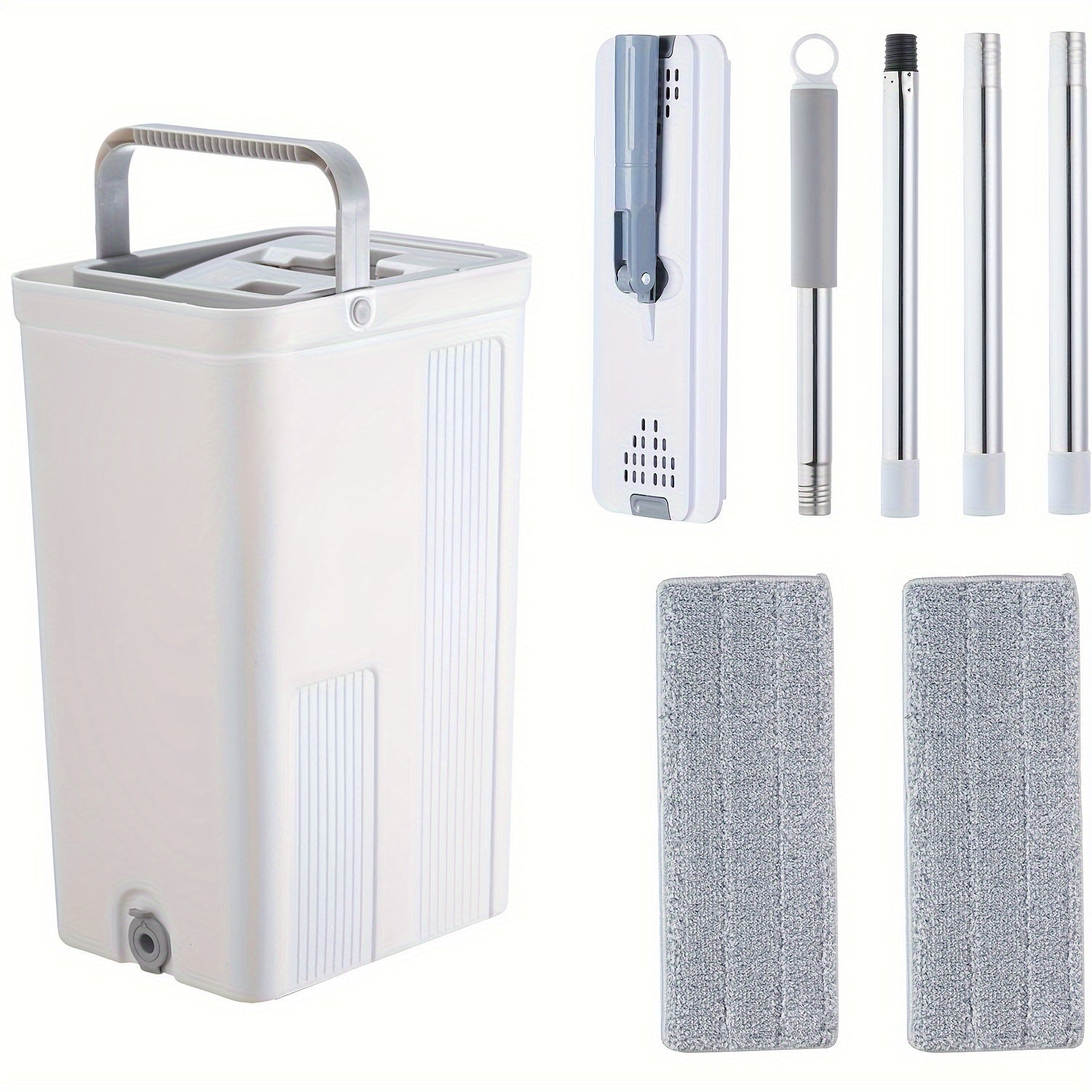 "Tekis mopu va chelak tizimi, squeegee va qo'l bilan ishlatishdan ozod dizayn bilan, oson uy tozalash uchun - Pol va devor tozalash uchun 2 ta qayta ishlatiladigan mikrofiber pad bilan birga."