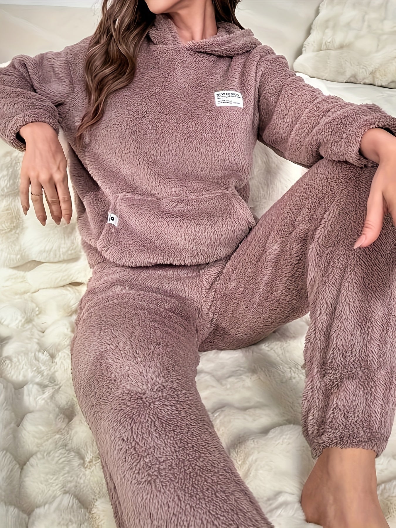 Ayollar uchun elegant jigarrang rangdagi fleece xuddi va shimlar to'plami, qulay va iliq, kanguru cho'ntagi bilan, mashinada yuvish mumkin.