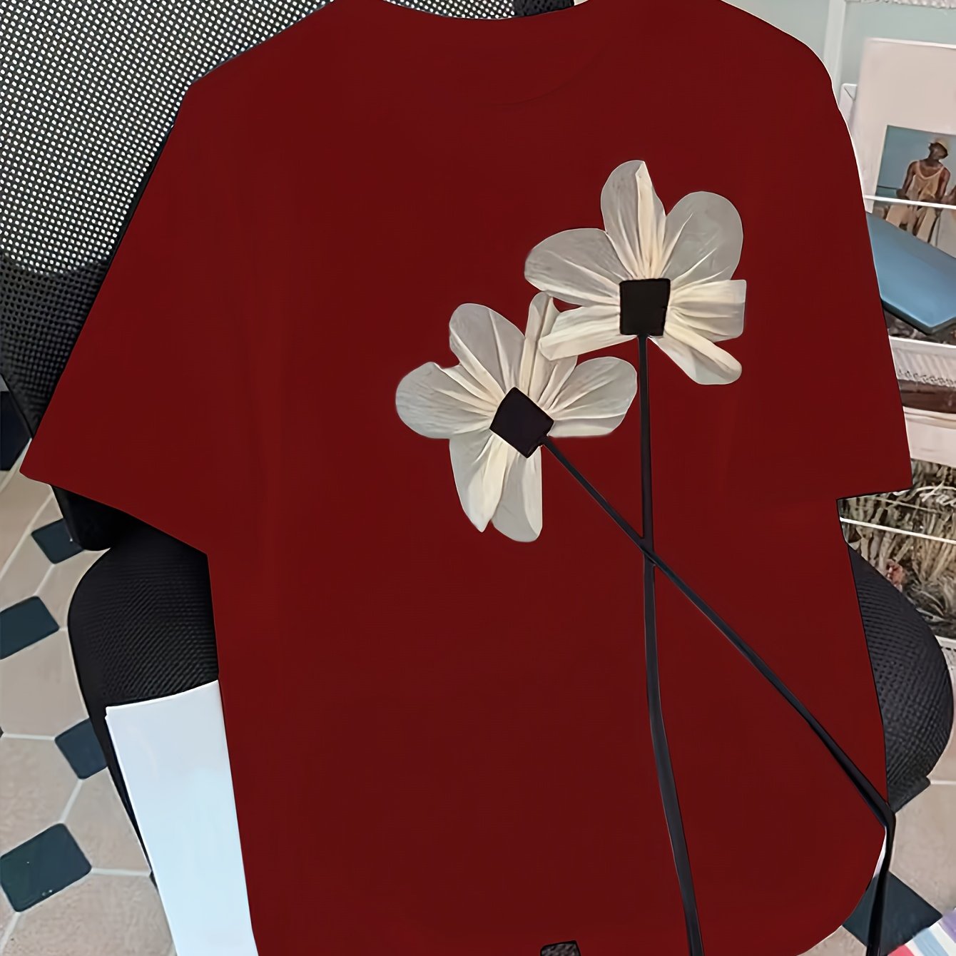 Ayollar uchun gullar bilan bezatilgan katta o'lchamdagi futbolka. Elastik polyester-spandeks aralashmasidan tayyorlangan. Dumaloq bo'yin, qisqa yeng, mashinada yuvish mumkin. Yozgi norasmiy yoki rasmiy kiyim uchun mos.