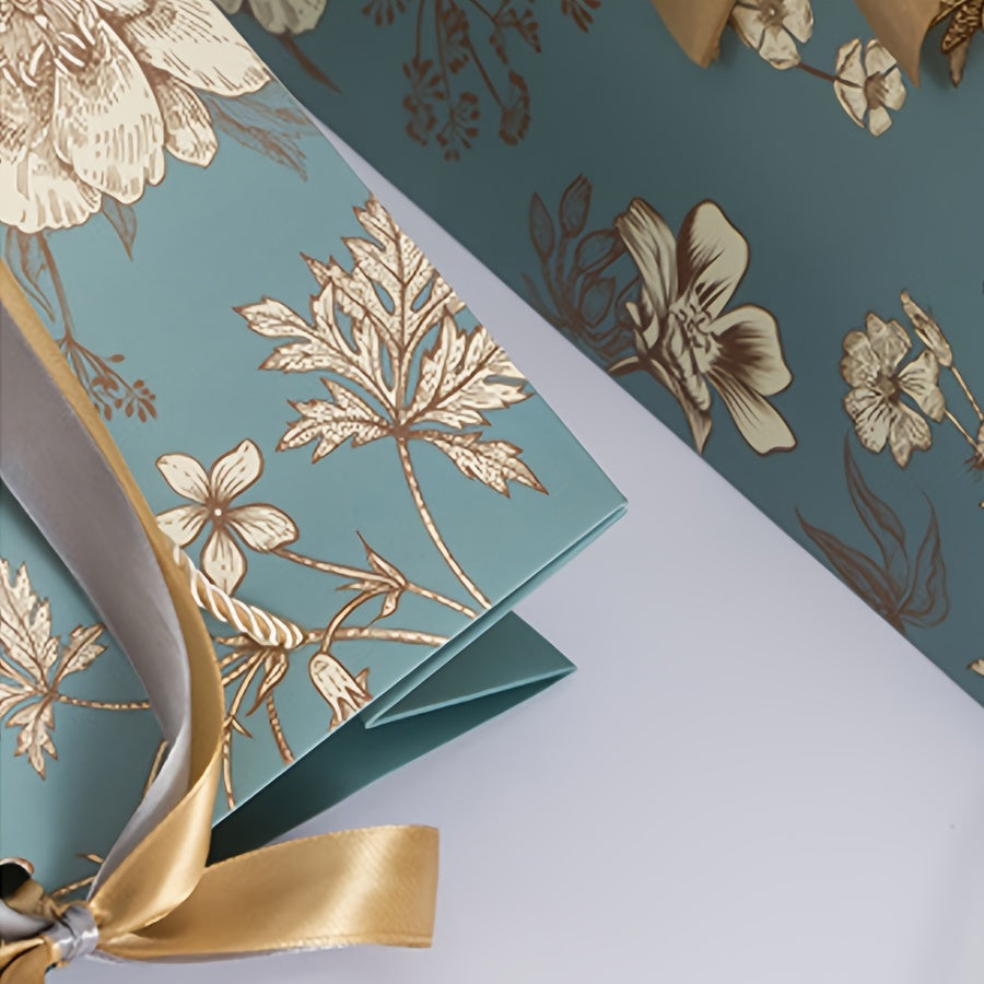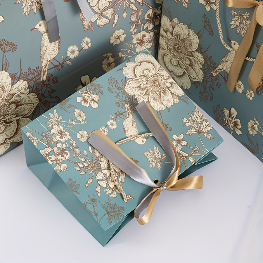 Gul naqshli qog'oz sovg'a sumkasi, oltin lenta, ko'k fon, jigarrang, oq va kulrang gullar, tug'ilgan kunlar, to'ylar, Onalar kuni va maxsus tadbirlar uchun mos. Tortishqichli yopiq.