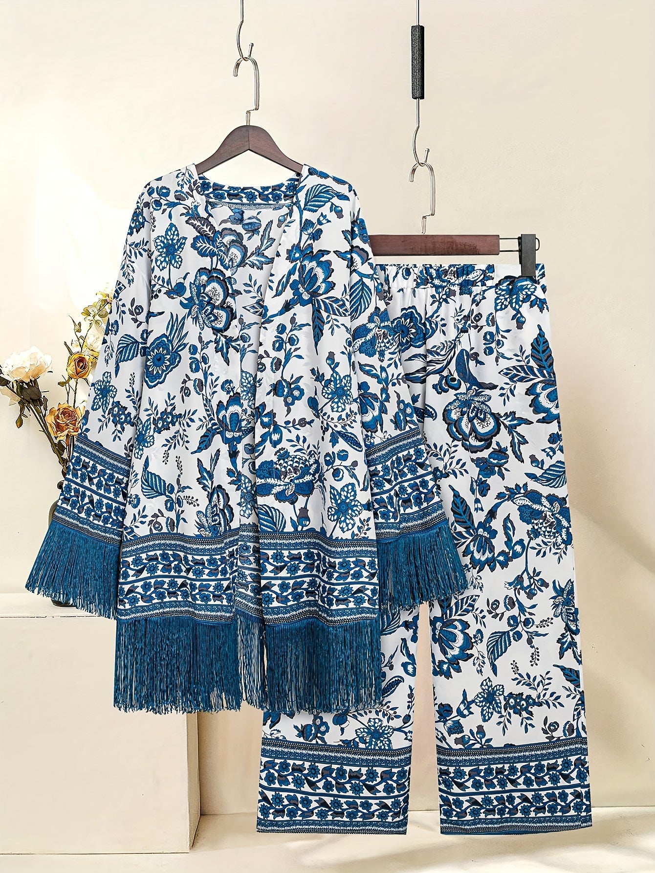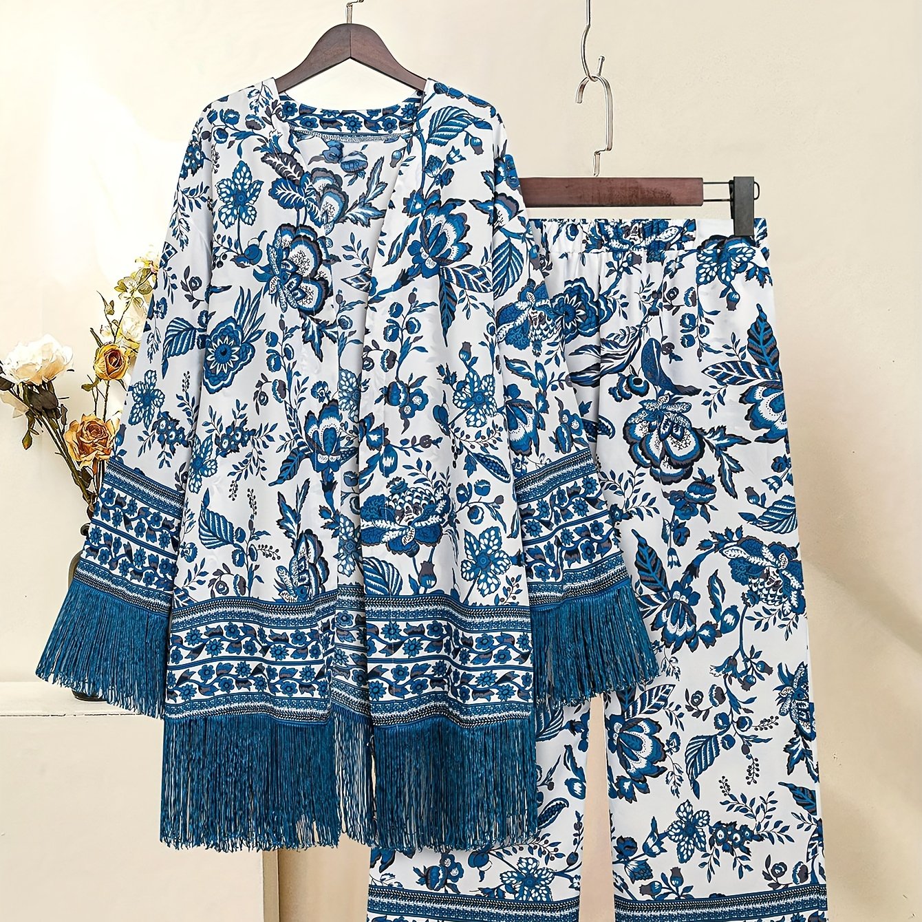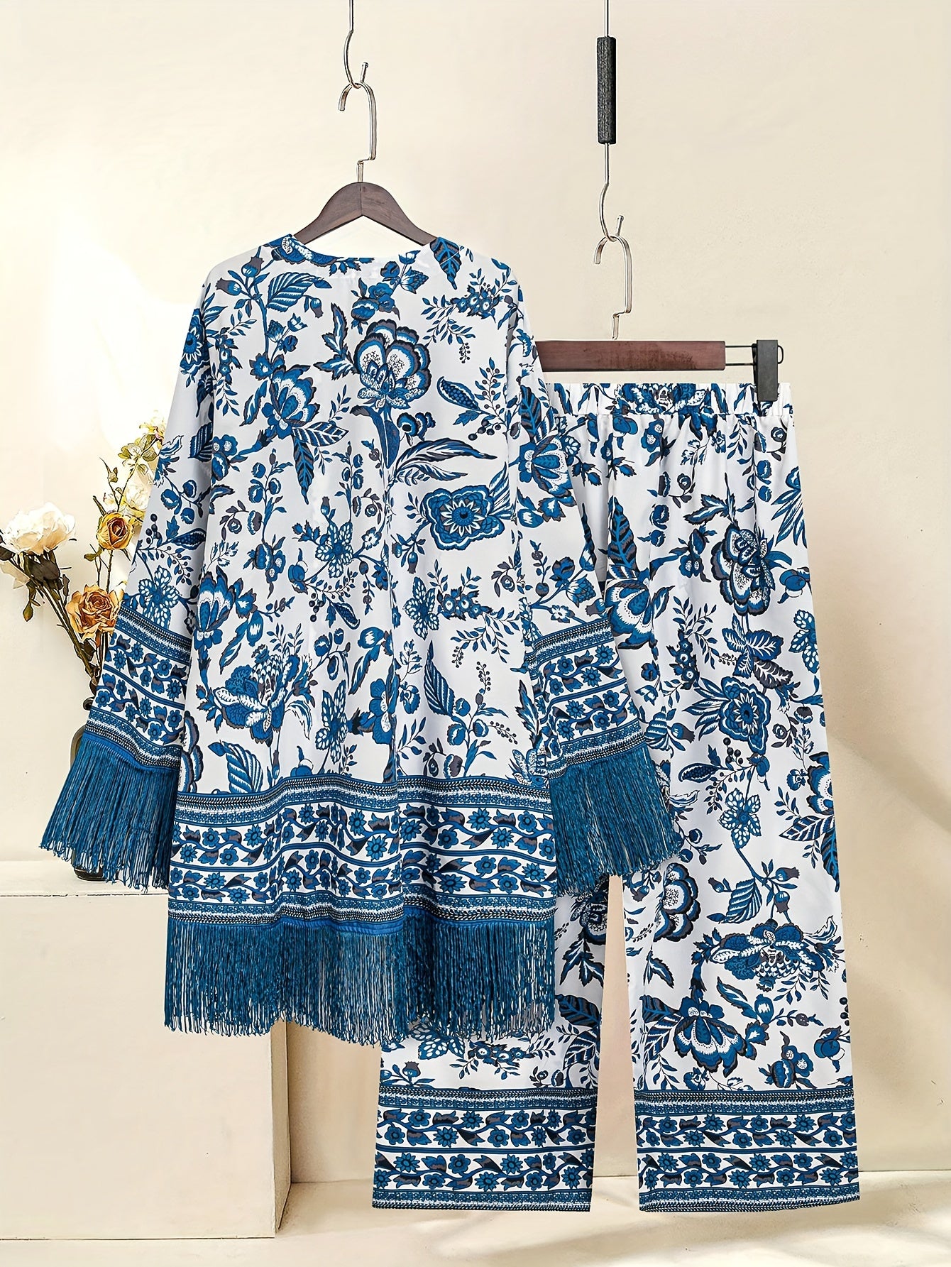 Gul naqshli franjali ikki qismli to'plam, ta'til uslubidagi uzun yengli bluzka va shimlar to'plami, kattalar uchun ayollar kiyimlari