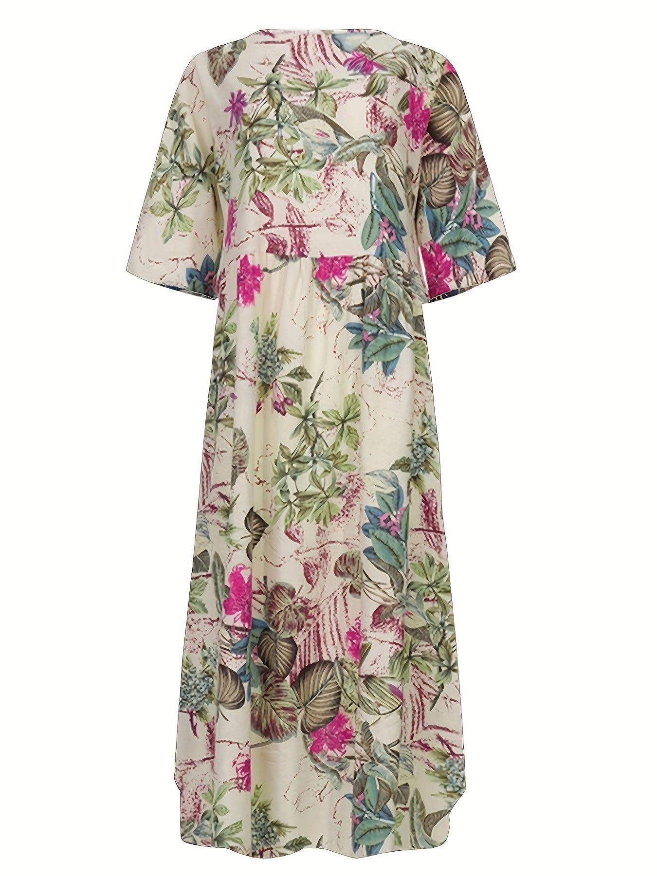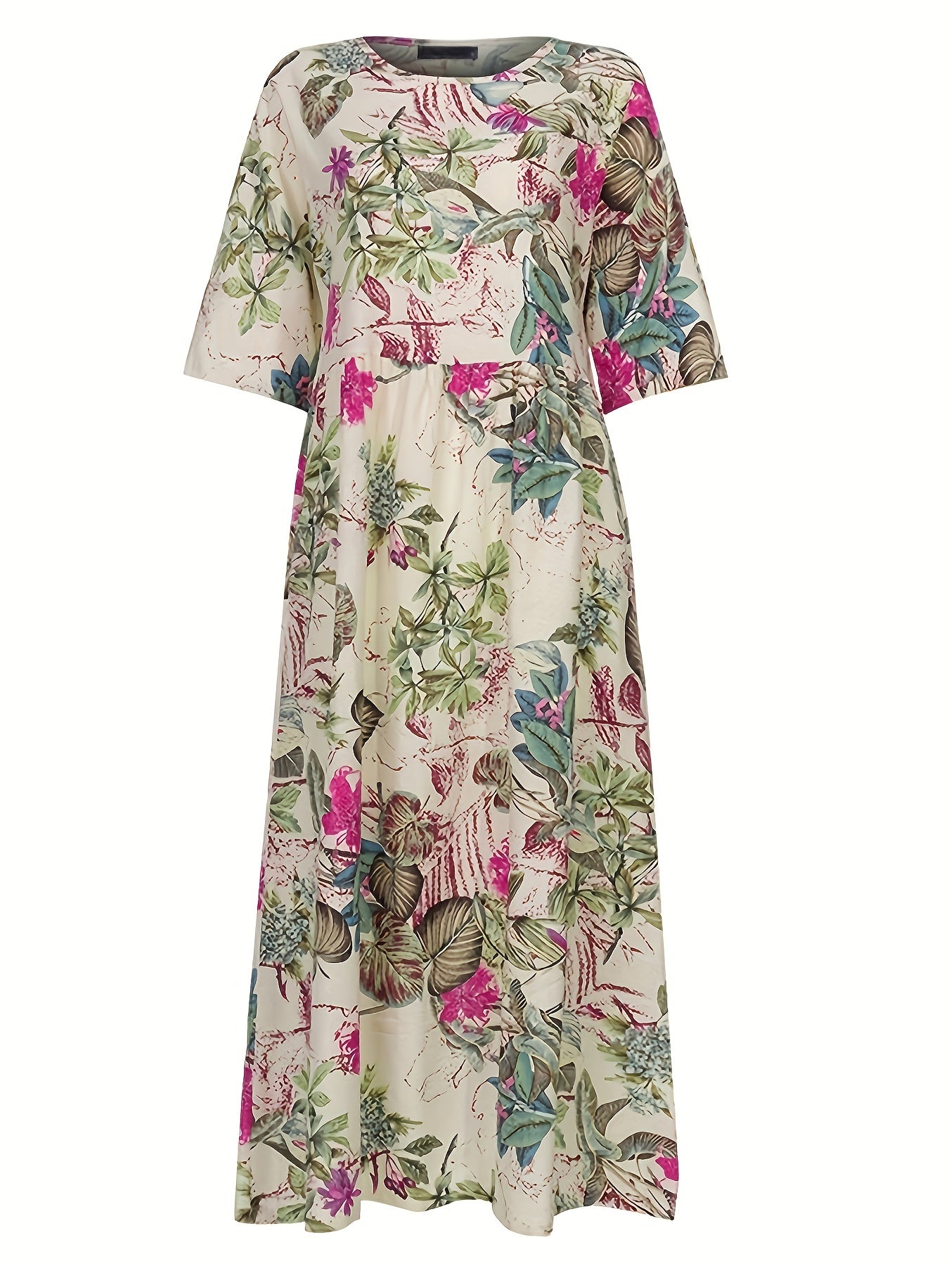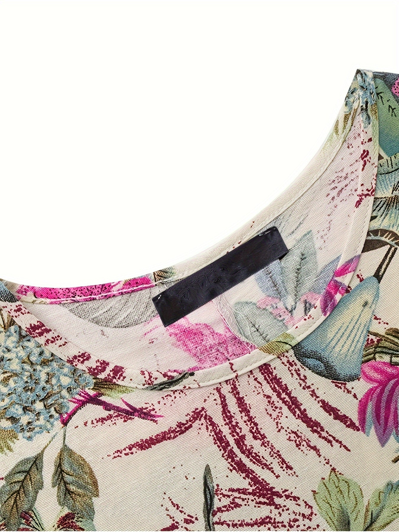 Bahor va yoz uchun gullar naqshidagi katta o'lchamdagi ko'ylak, ayollar kiyimlarida tasodifiy krujka bo'yin uslubi