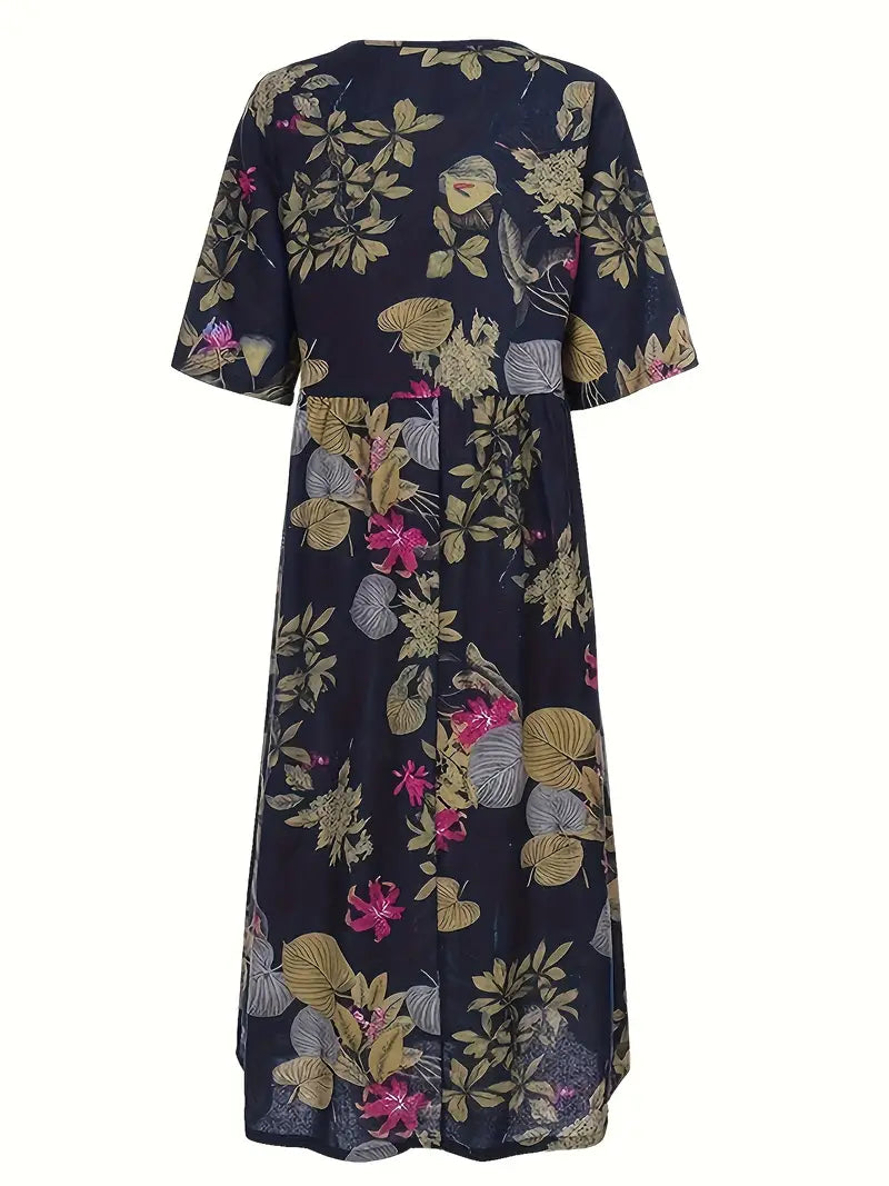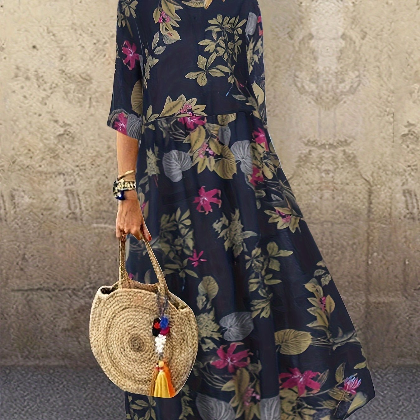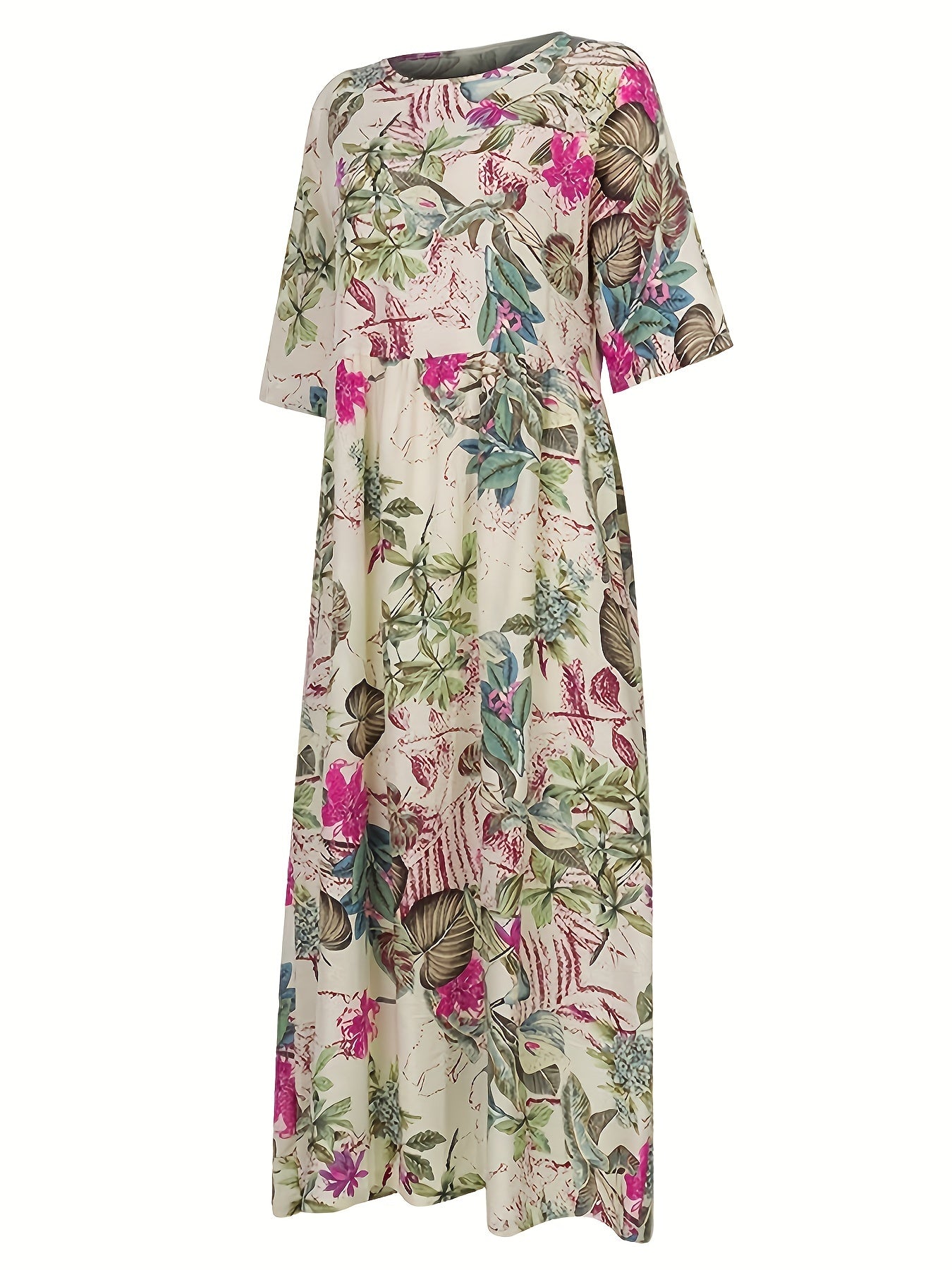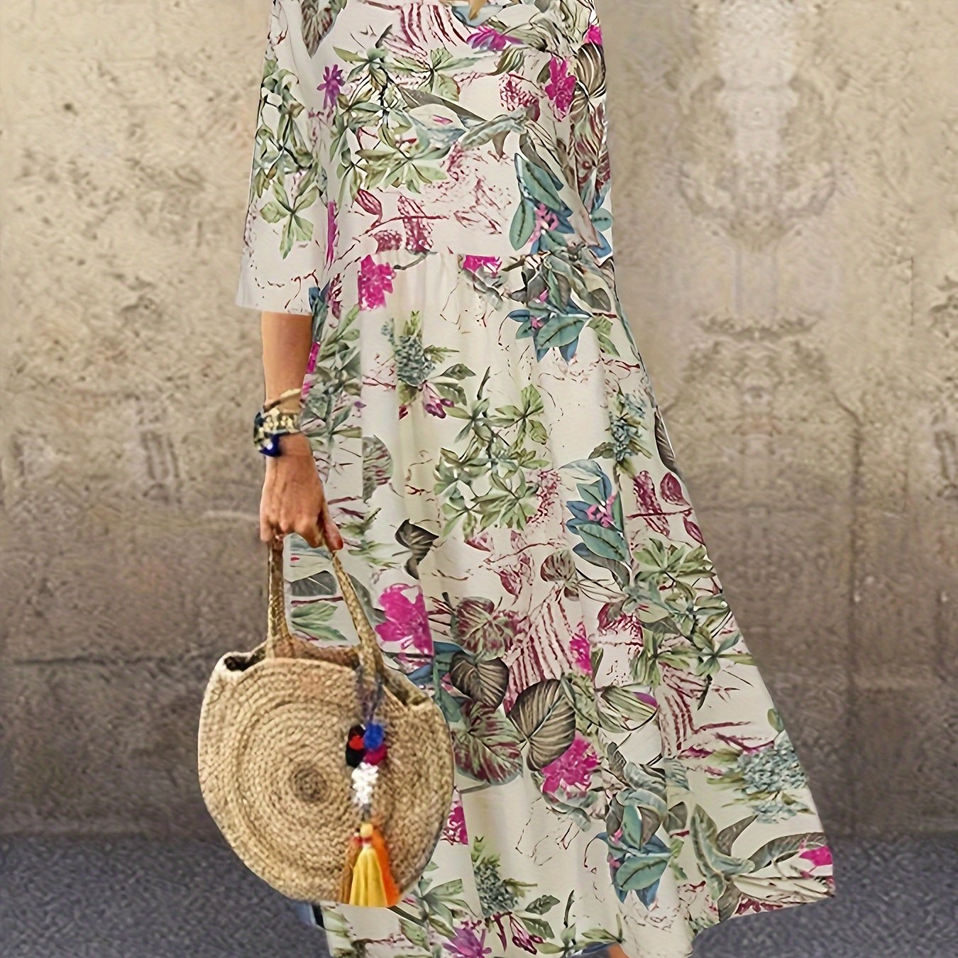 Bahor va yoz uchun gullar naqshidagi katta o'lchamdagi ko'ylak, ayollar kiyimlarida tasodifiy krujka bo'yin uslubi