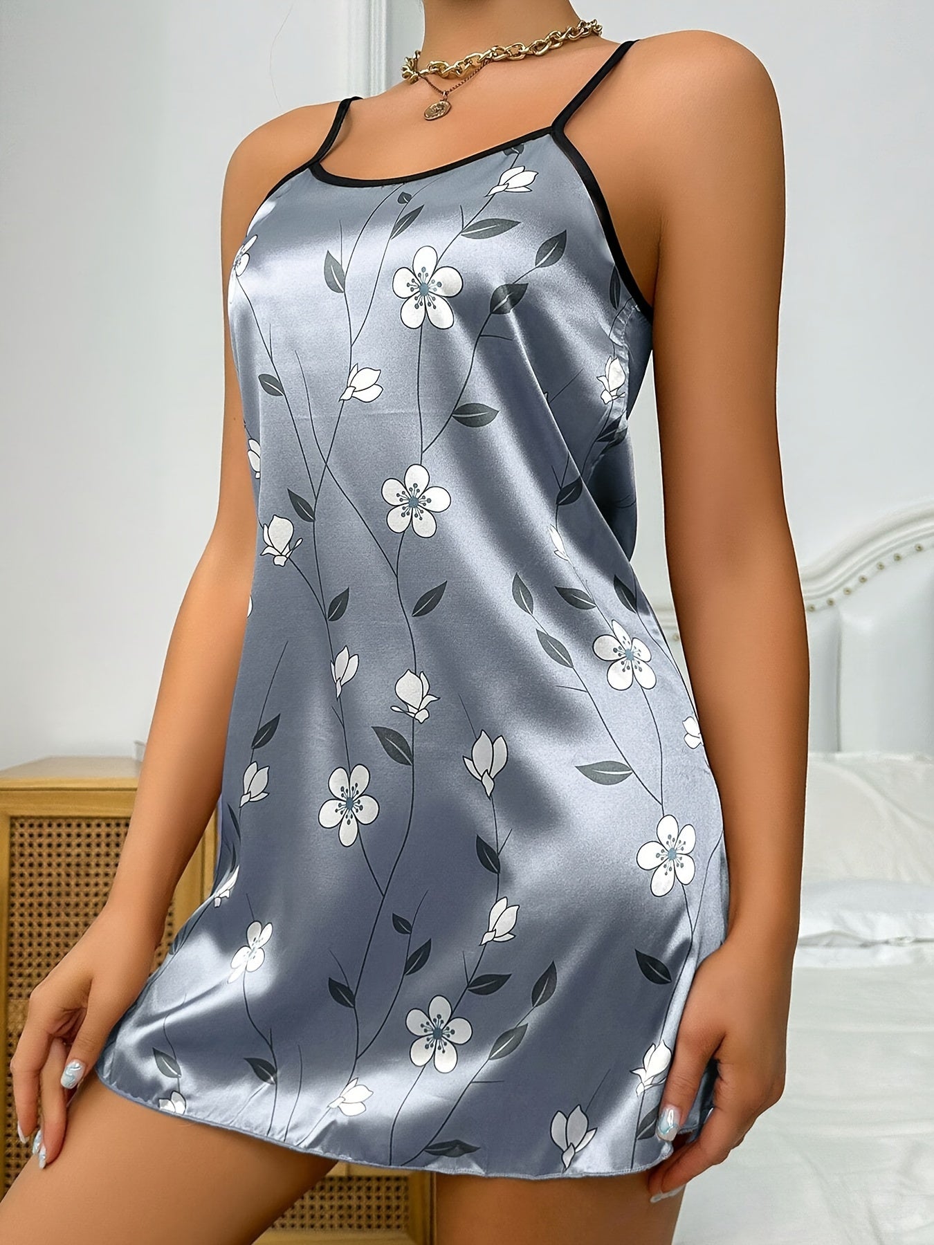 Gul naqshli saten tunika, ayollar uchun uyqu kiyimlari uchun orqa qismi ochiq slip ko'ylagi