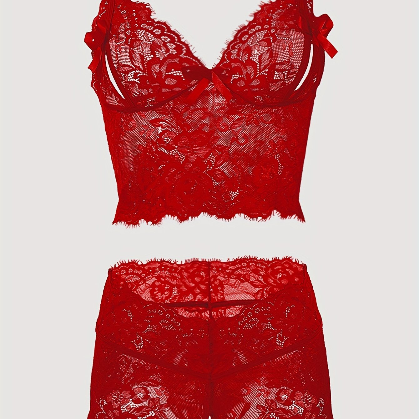 Gul to'quvli ichki kiyim to'plami, bog'ichli brassiyer va ochiq qorinli shortiklar