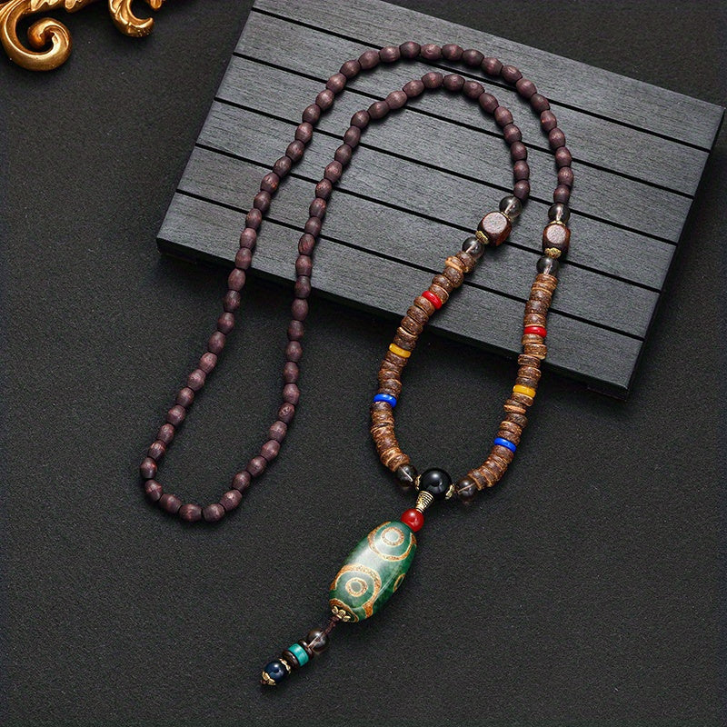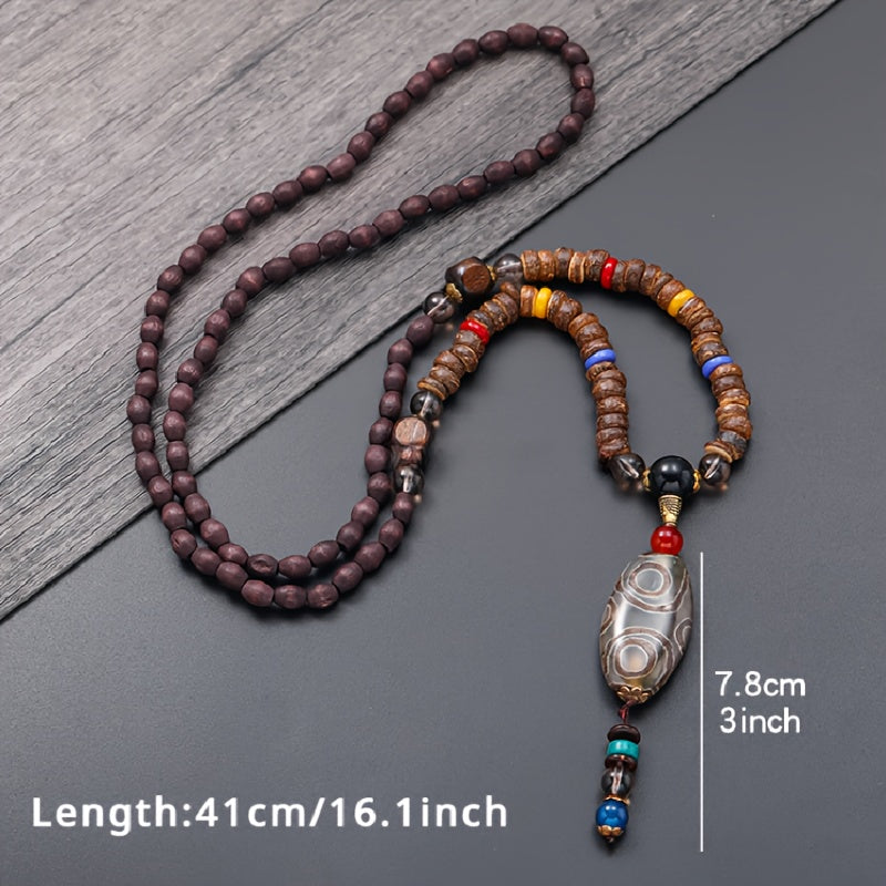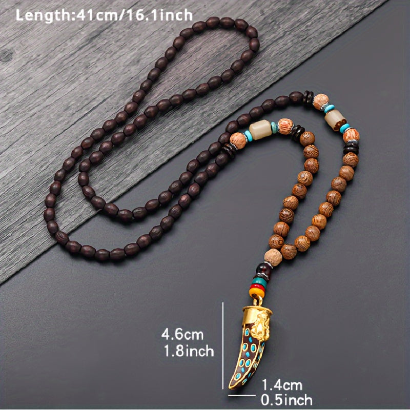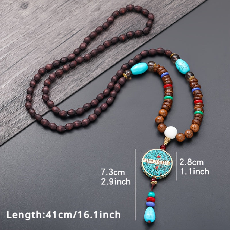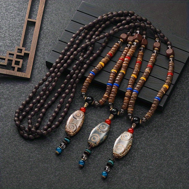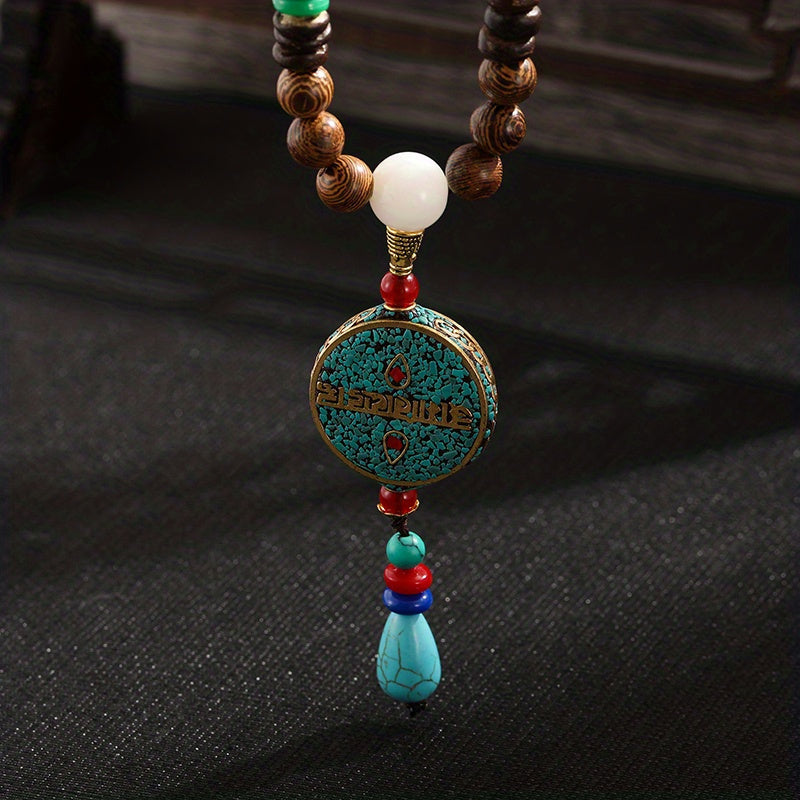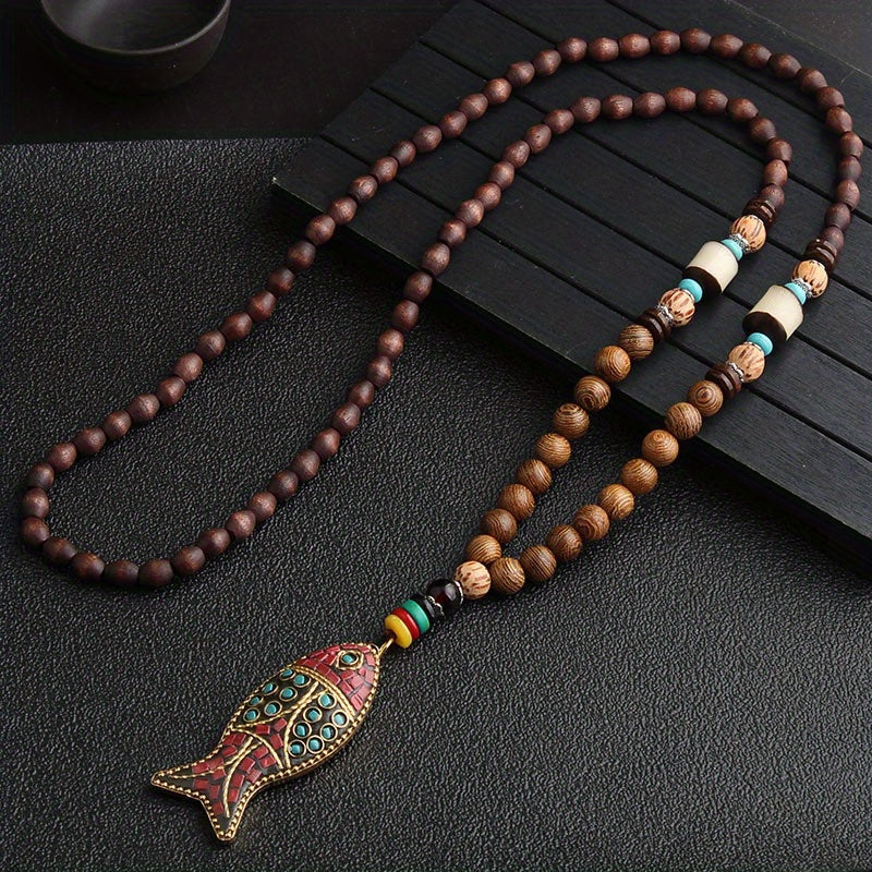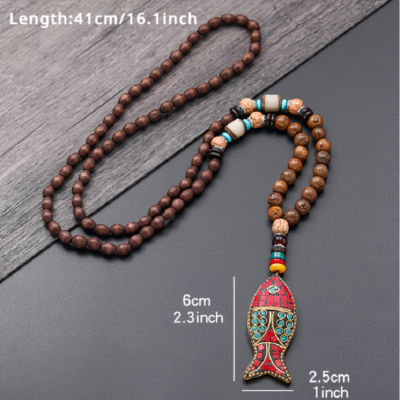 Sovg'a marjon: Boho uslubidagi yog'och beadli pandant bilan uzun sviter zanjiri, o'yma zargarlik
