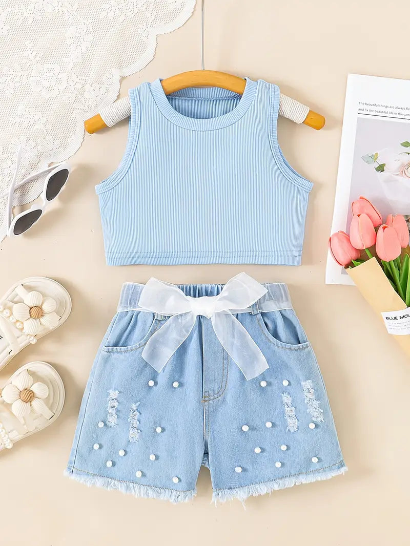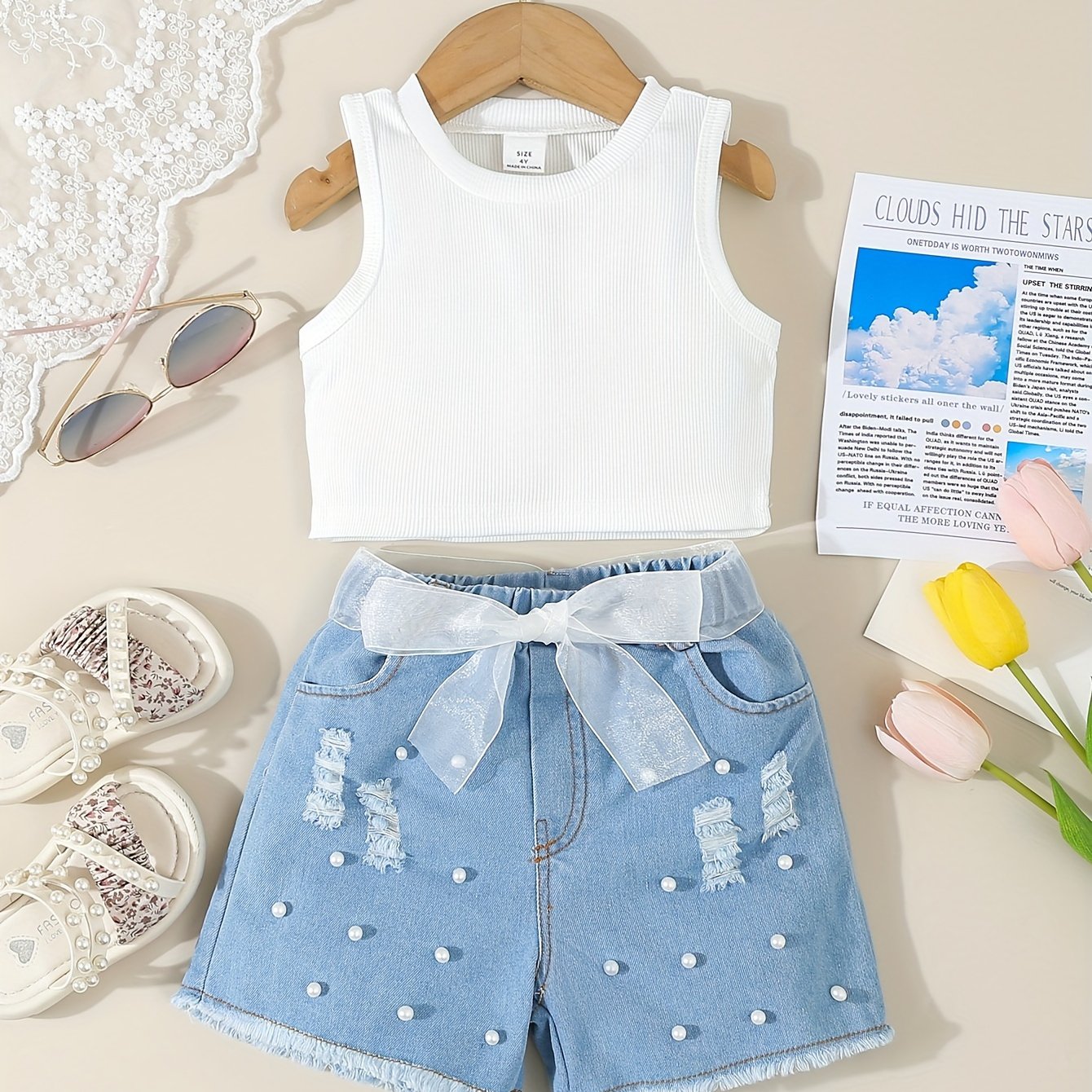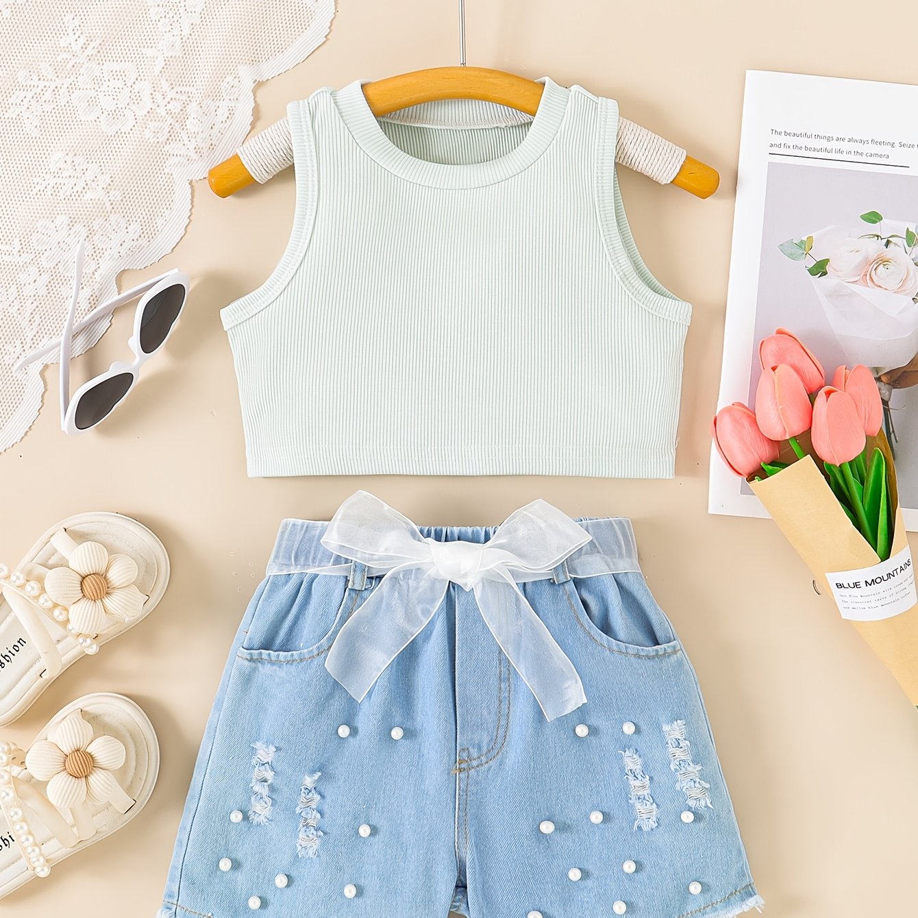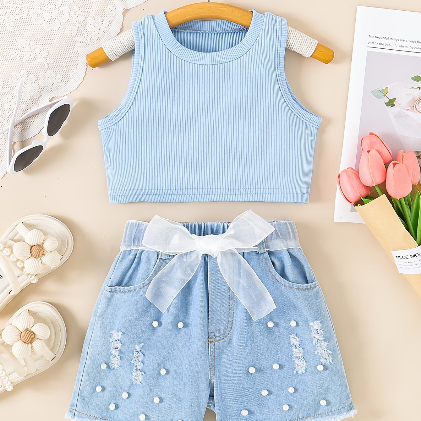 Qizlar uchun tank top va marvarid dizaynli shortlar to'plami, yozgi har kuni kiyish uchun mukammal. Qizlar uchun ajoyib sovg'a g'oyasi.