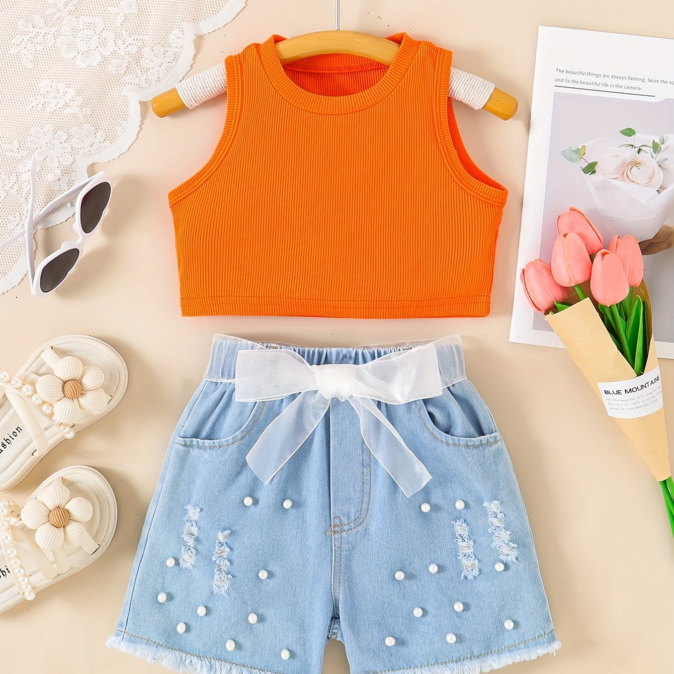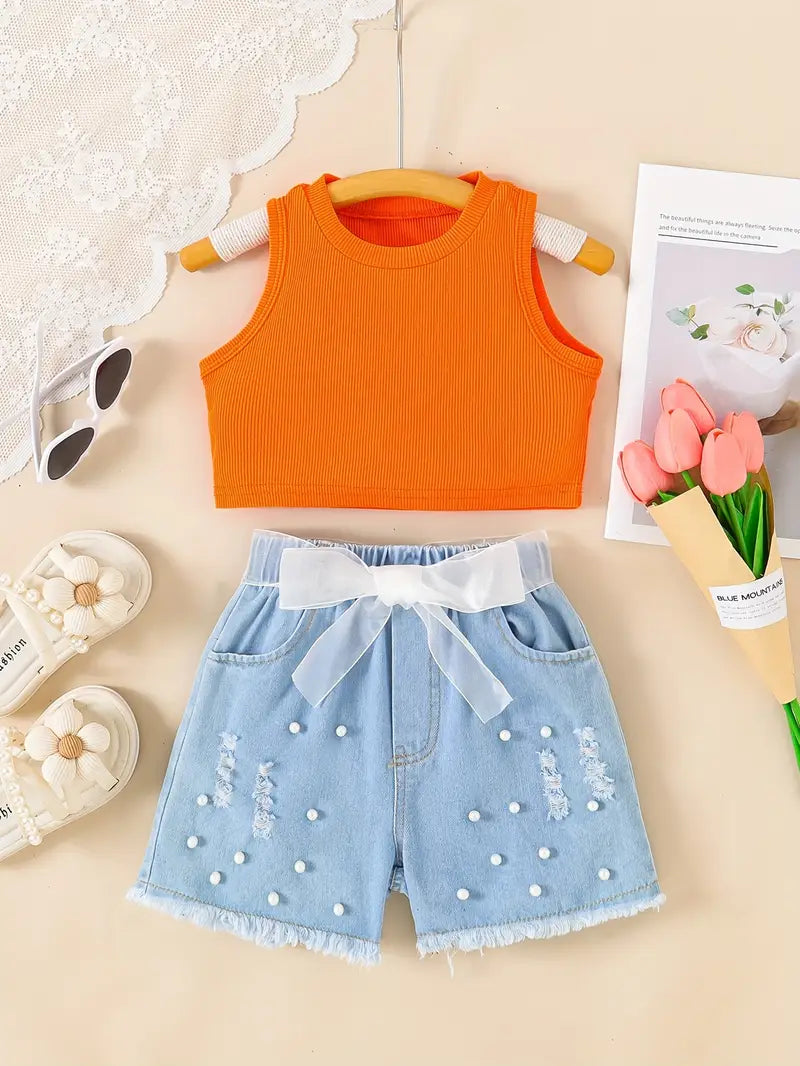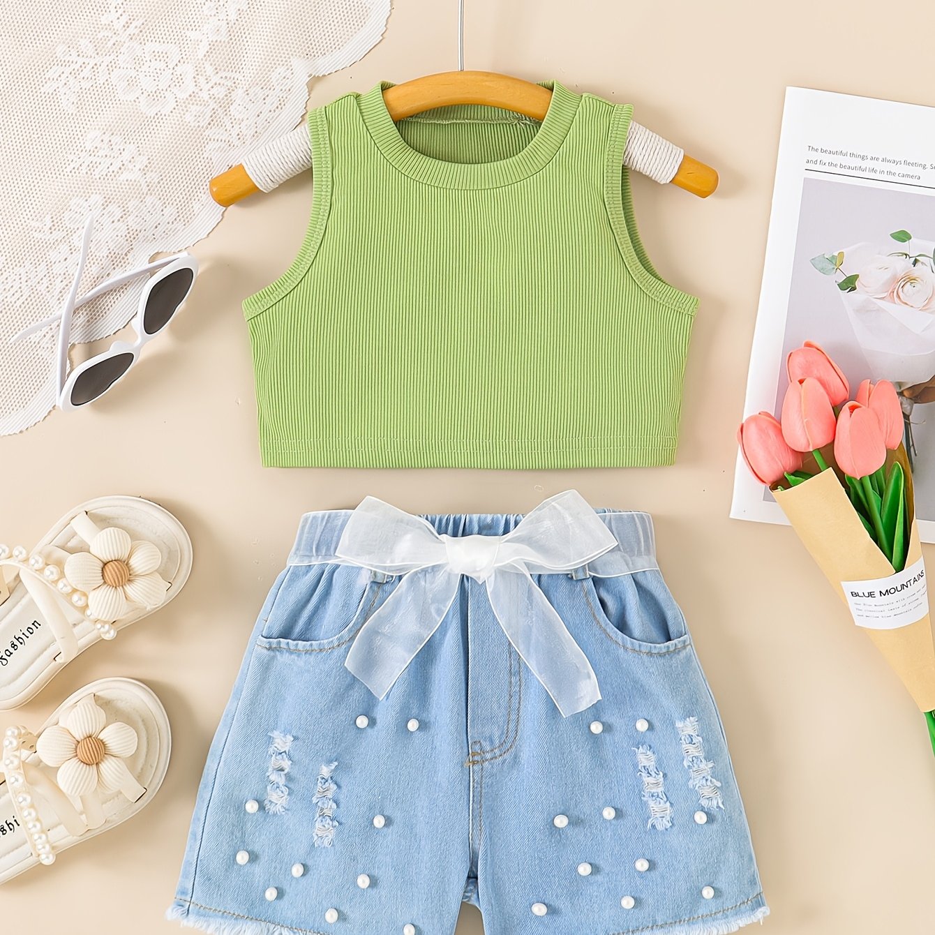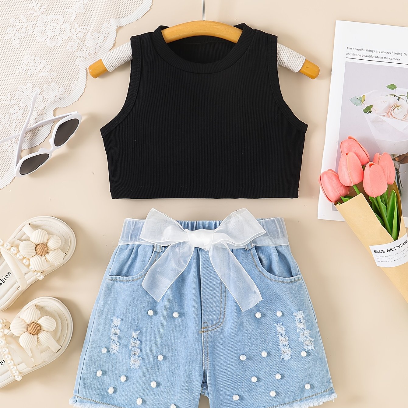 Qizlar uchun tank top va marvarid dizaynli shortlar to'plami, yozgi har kuni kiyish uchun mukammal. Qizlar uchun ajoyib sovg'a g'oyasi.