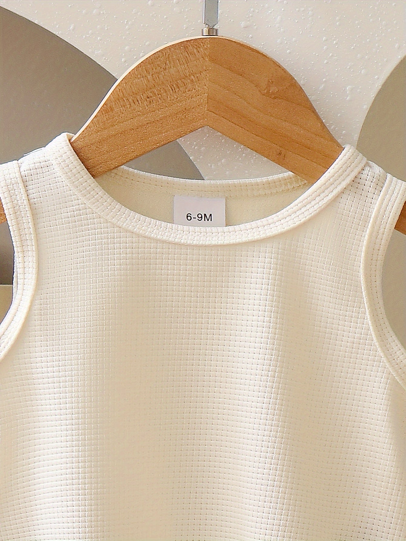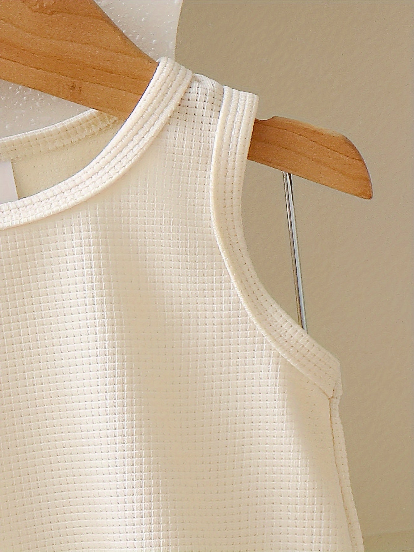 Qizlar uchun Boho uslubidagi yengsiz to'qilgan to'p va shortlar to'plami, 100% polyester to'qima materialidan tayyorlangan, bir rangda. Yozgi ochiq havoda faoliyatlar uchun odatiy moslik.
