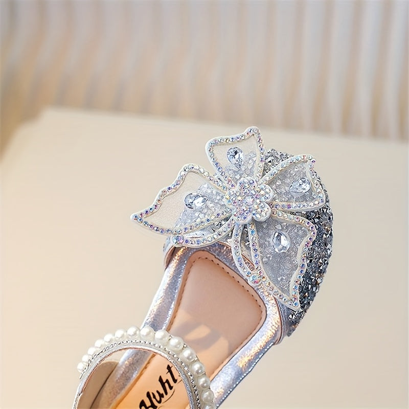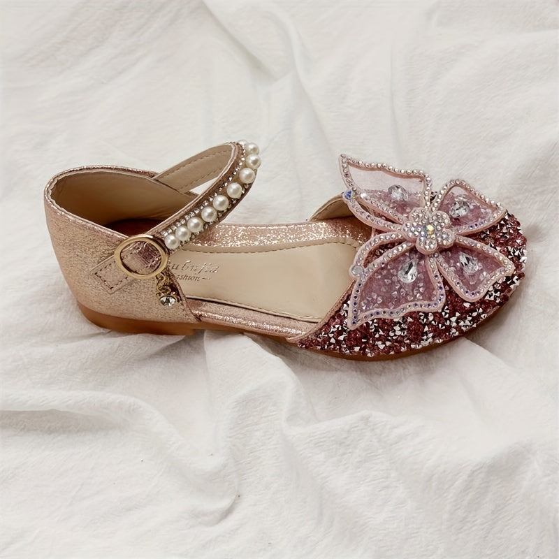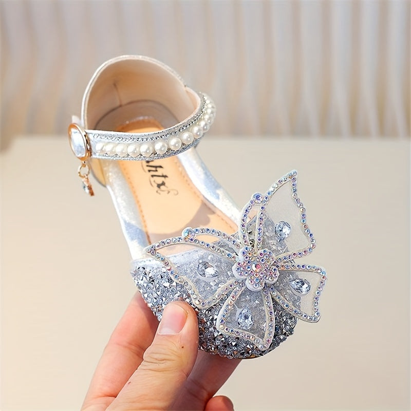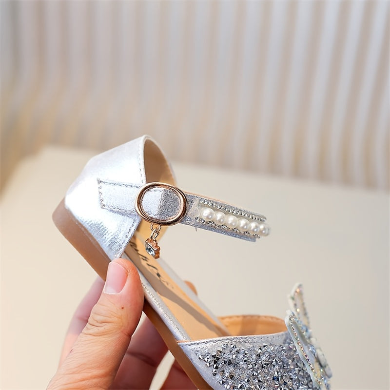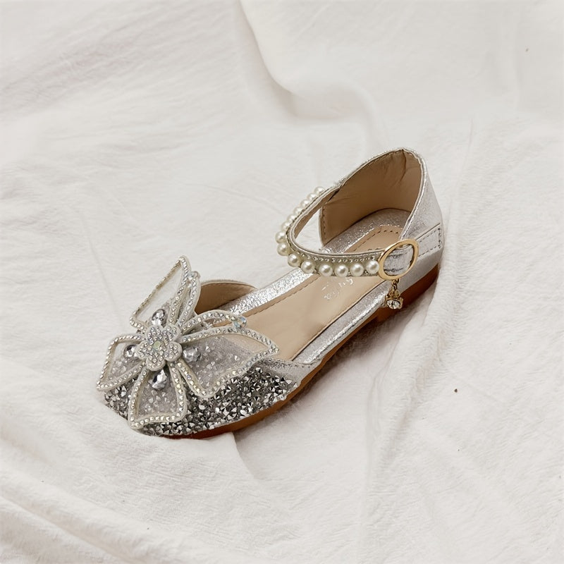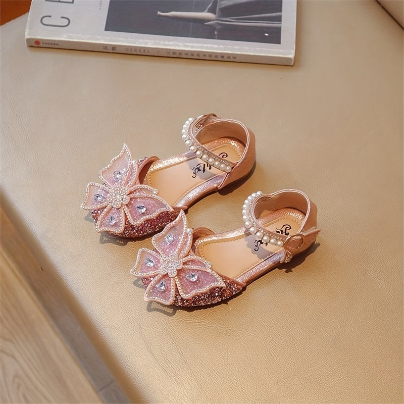 Qizlar uchun soxta marvarid va payetka bezaklari bilan sandallar.