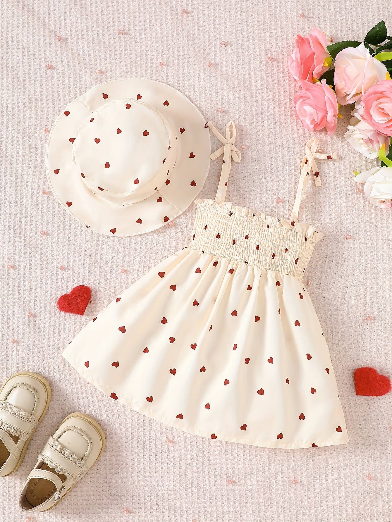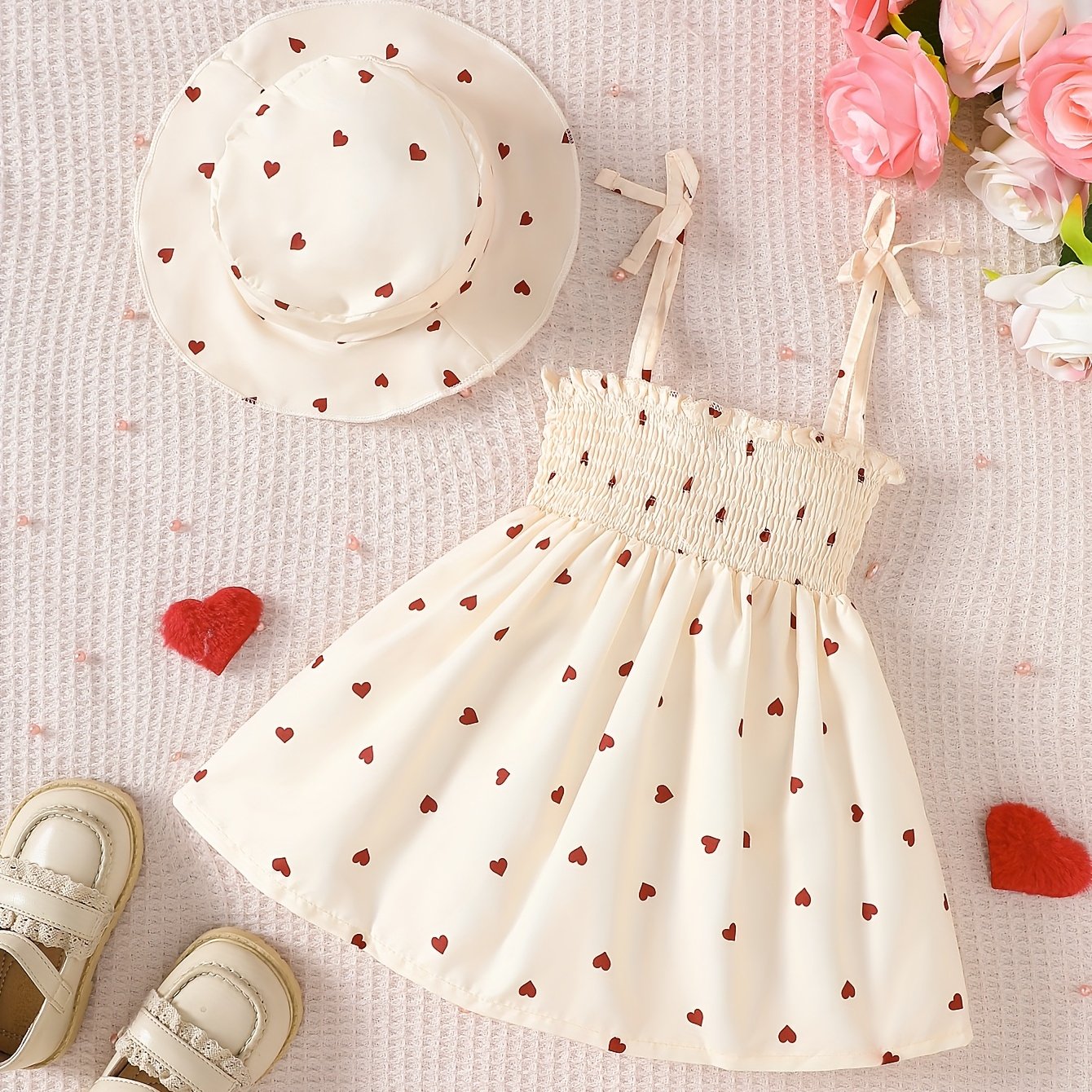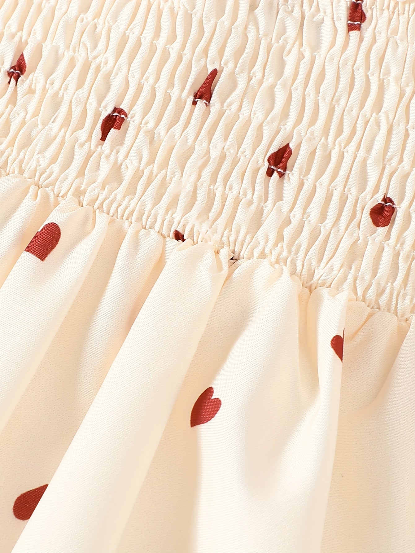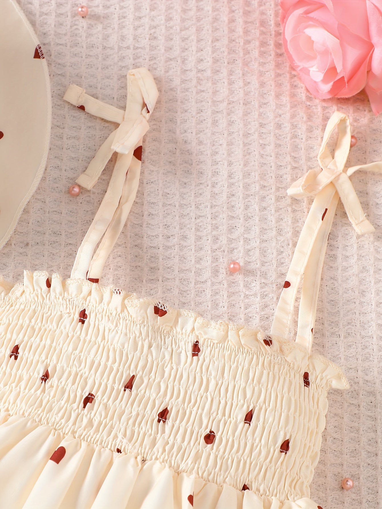 Qizlar uchun yengsiz soyabon yubka ko'ylagi, shaftoli yurak printi, tortishqichli suspender, yozgi ochiq havoda kiyish uchun mukammal.