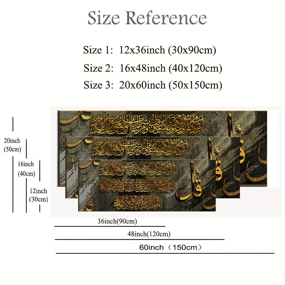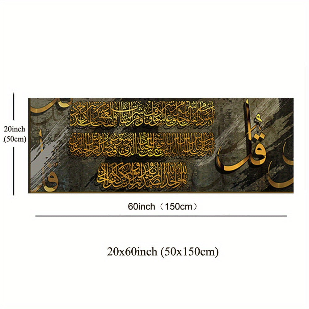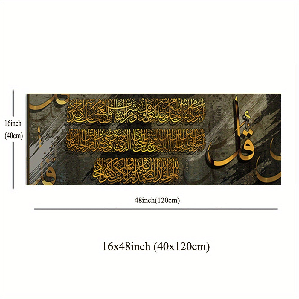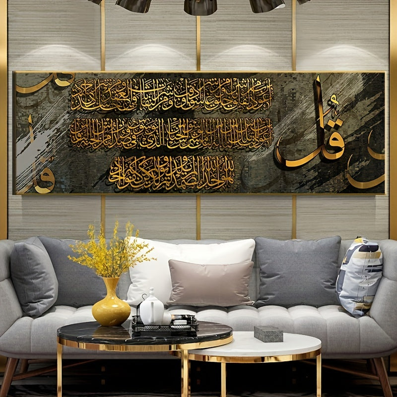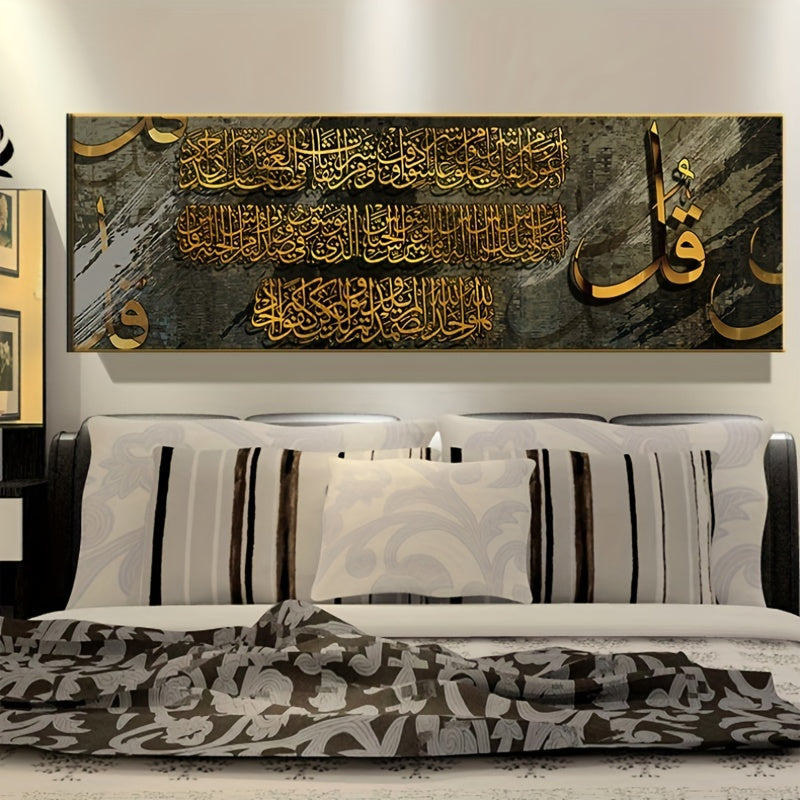 Zamonaviy arab yozuvi bilan bezatilgan oltin islomiy kaligrafiya kanvas san'at plakat, ramkasiz HD sifatida. Har qanday xona yoki ofis uchun zamonaviy diniy uy aksenti. Zamonaviy islomiy uy dekoratsiyasi uchun batafsil tuzilmali san'at asari.