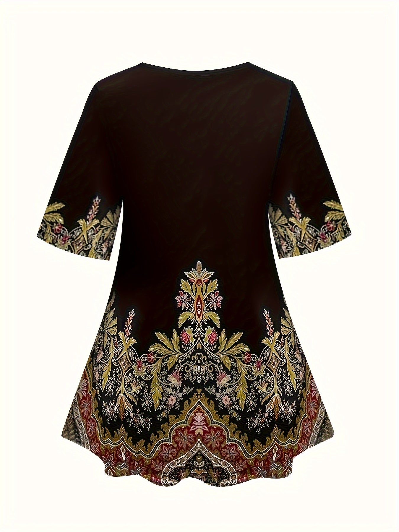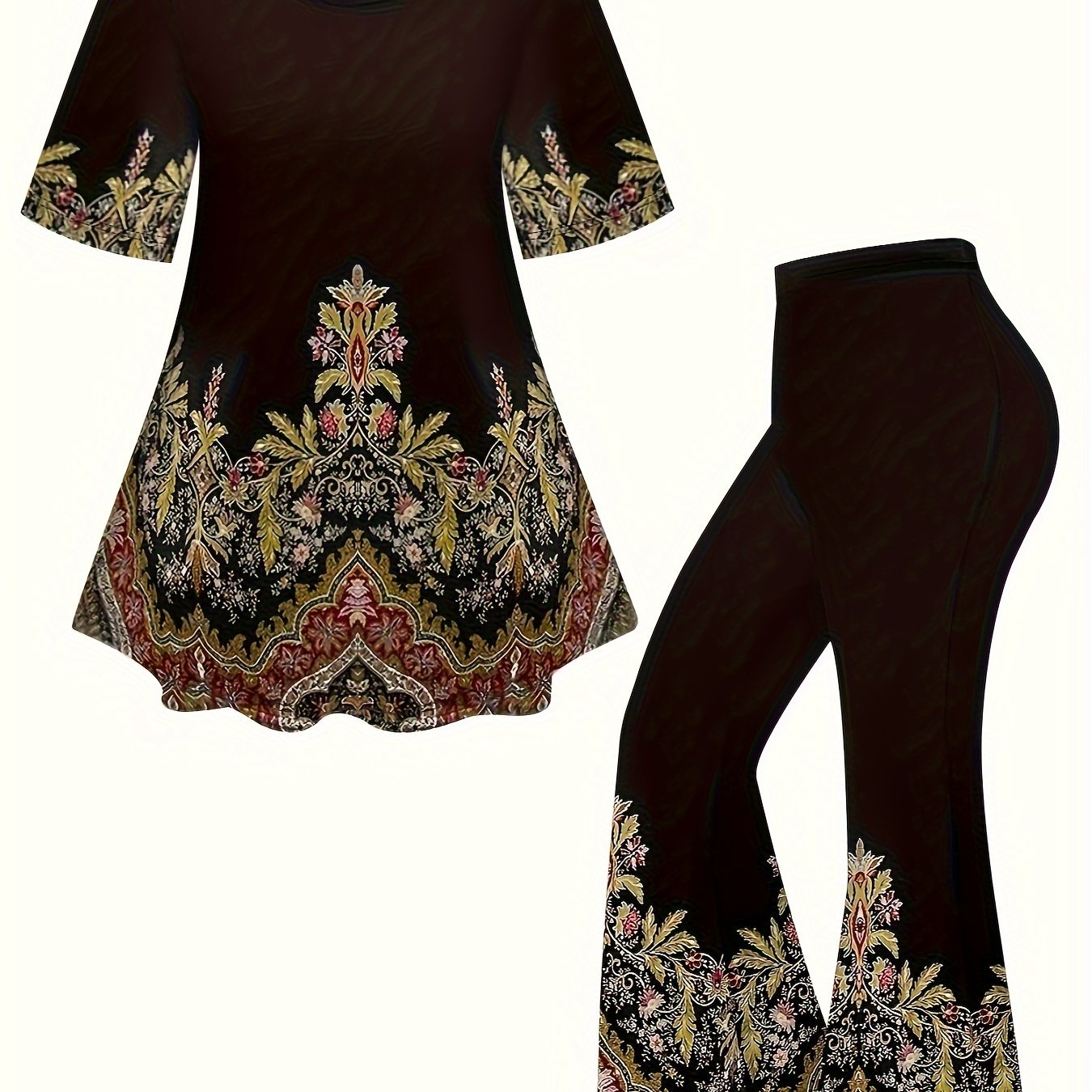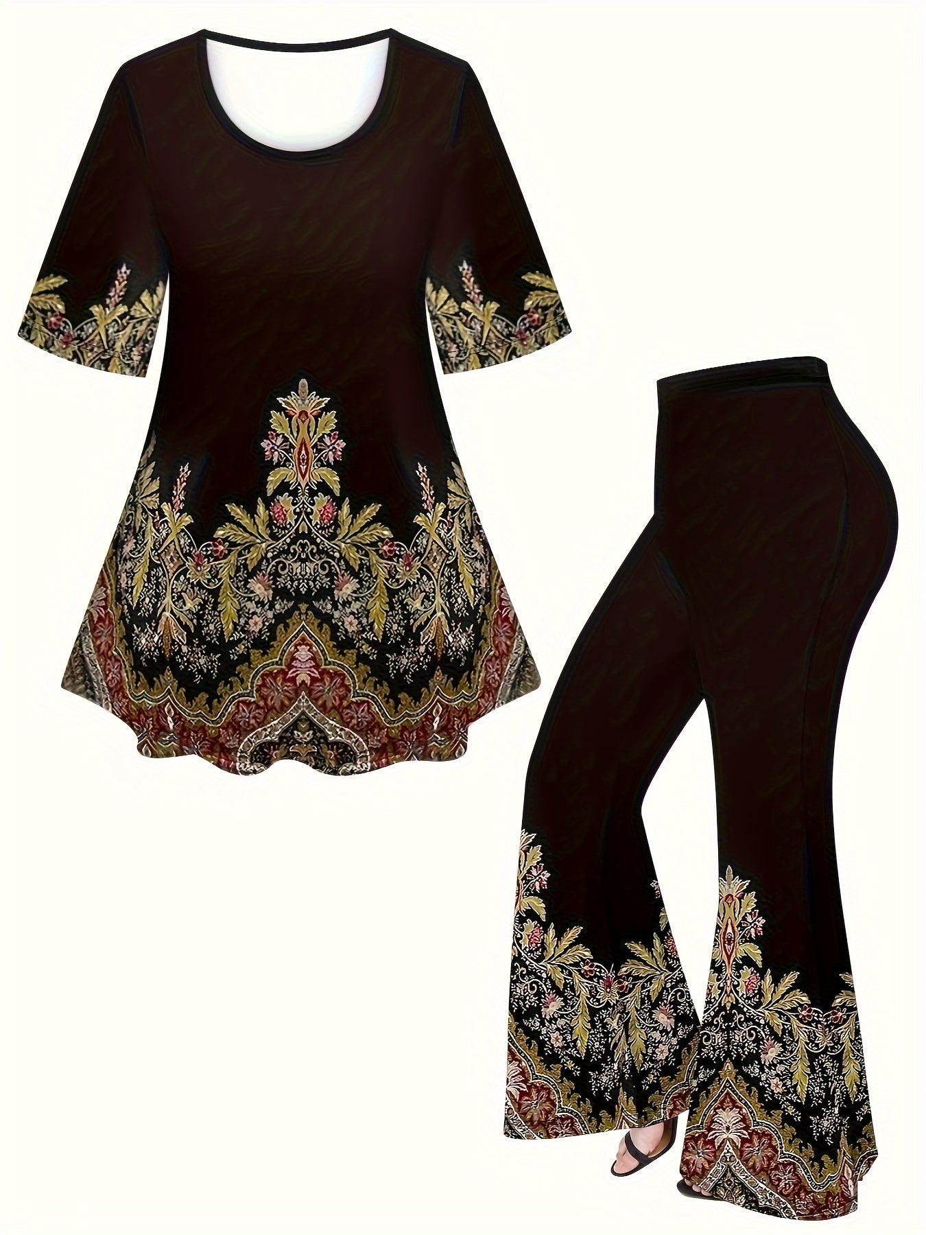 Katta o'lchamdagi ayollar uchun grafik printli ikki qismli to'plam, krujka yoqasi t-shirt va shimlar to'plami.