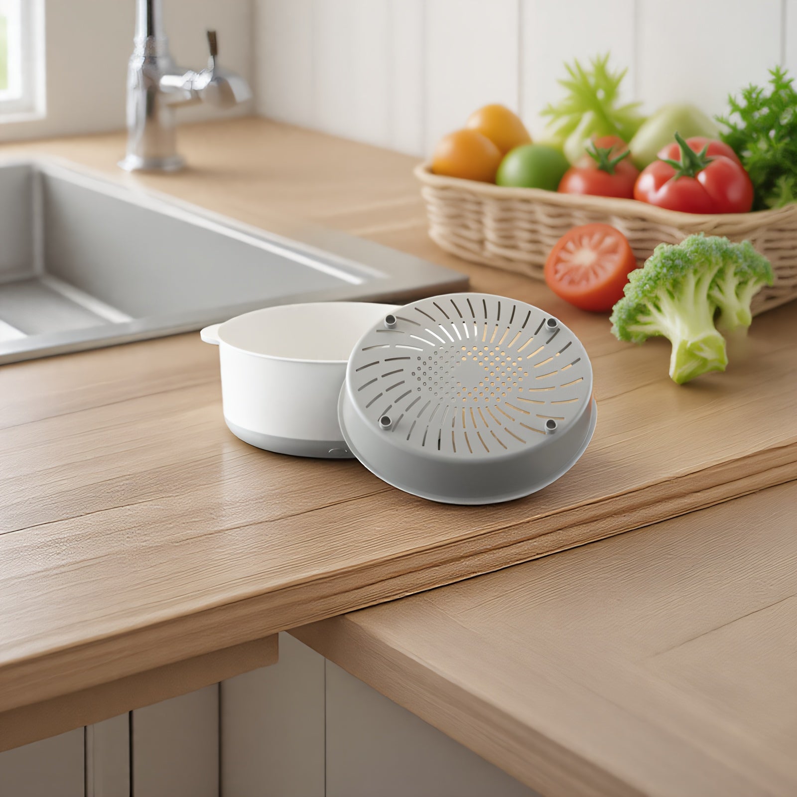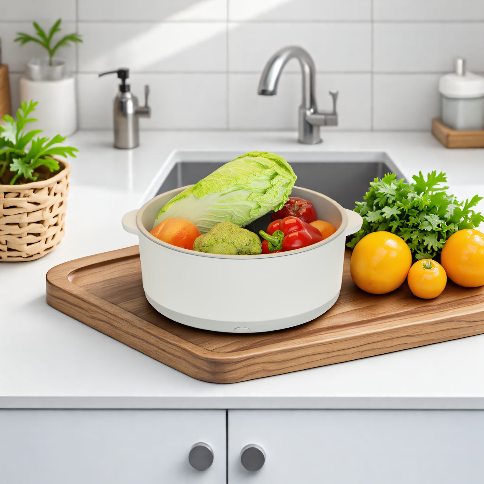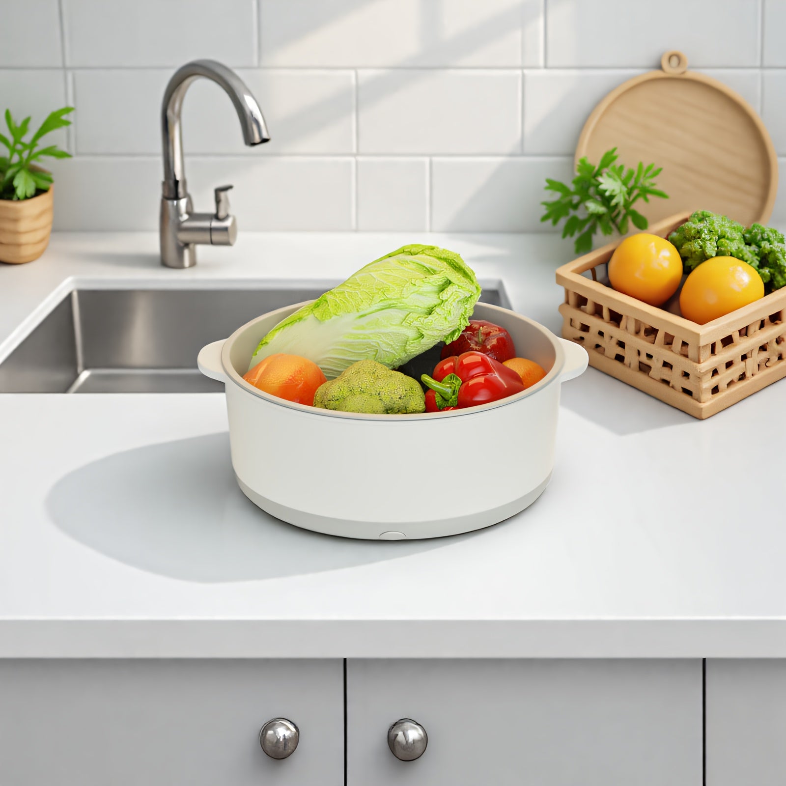 Qurilma bilan elektr quvvatli qo‘l bilan ishlovchi meva va sabzavot yuvish mashinasi, oqim qutisi va USB port bilan. Oziq-ovqat protsessorining qo‘shimchalari bilan ta'minlangan.