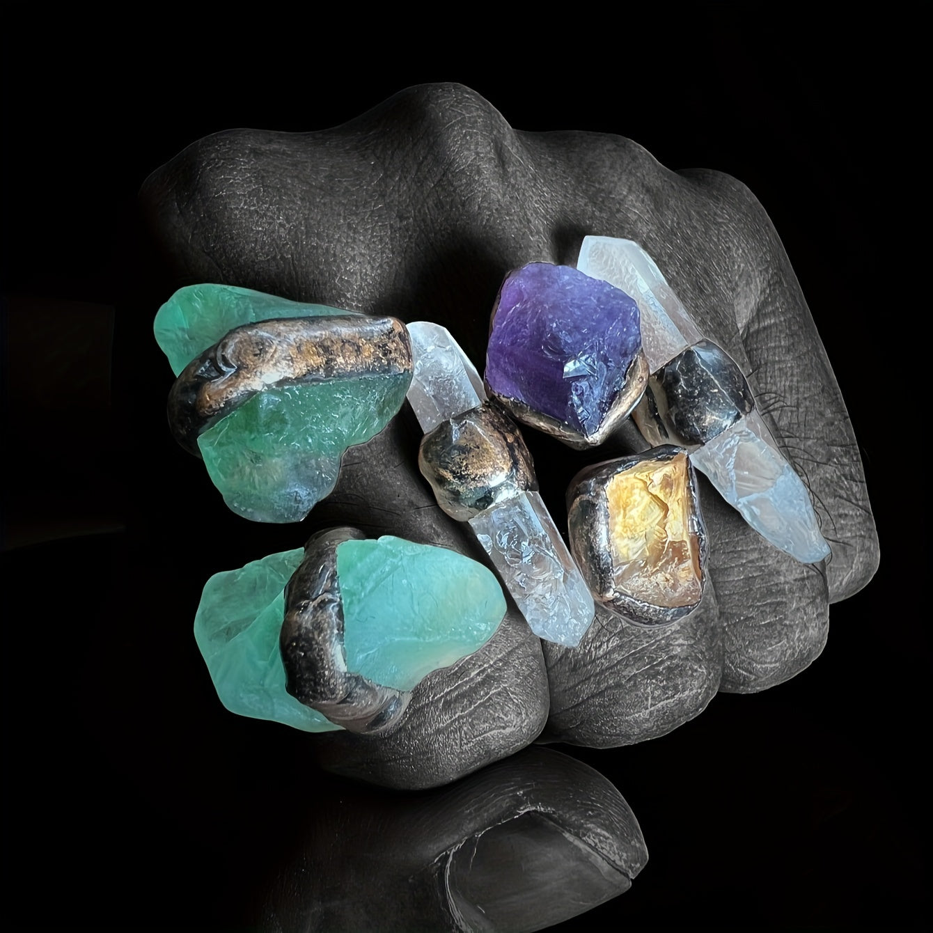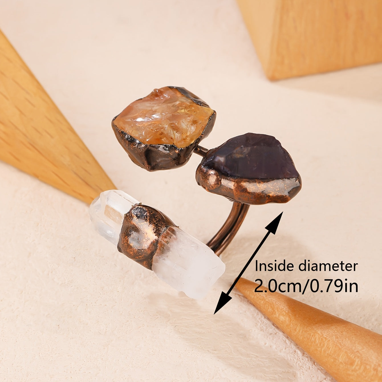 Qoʻlda tayyorlangan kristall uzuk, tabiiy moʻl va qum yoriqlari bilan, noyob zargarlik buyumi