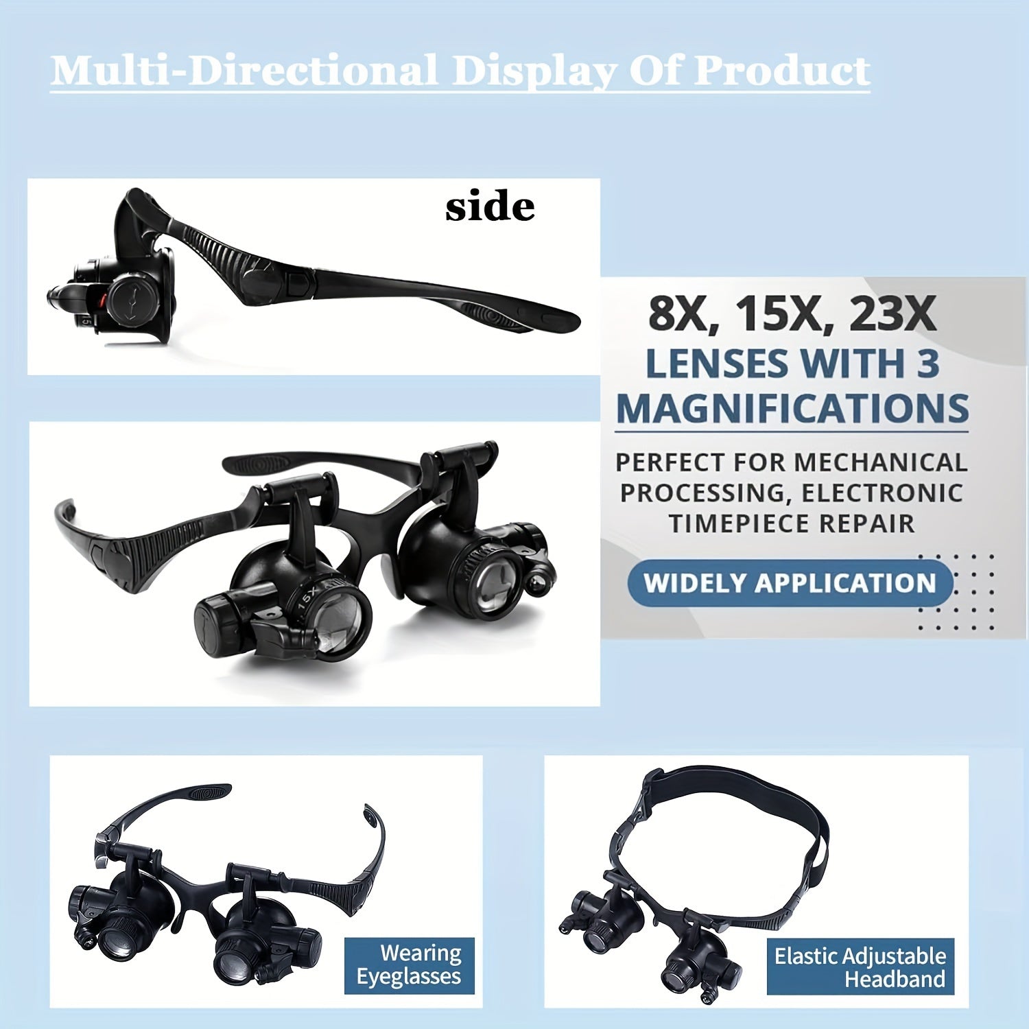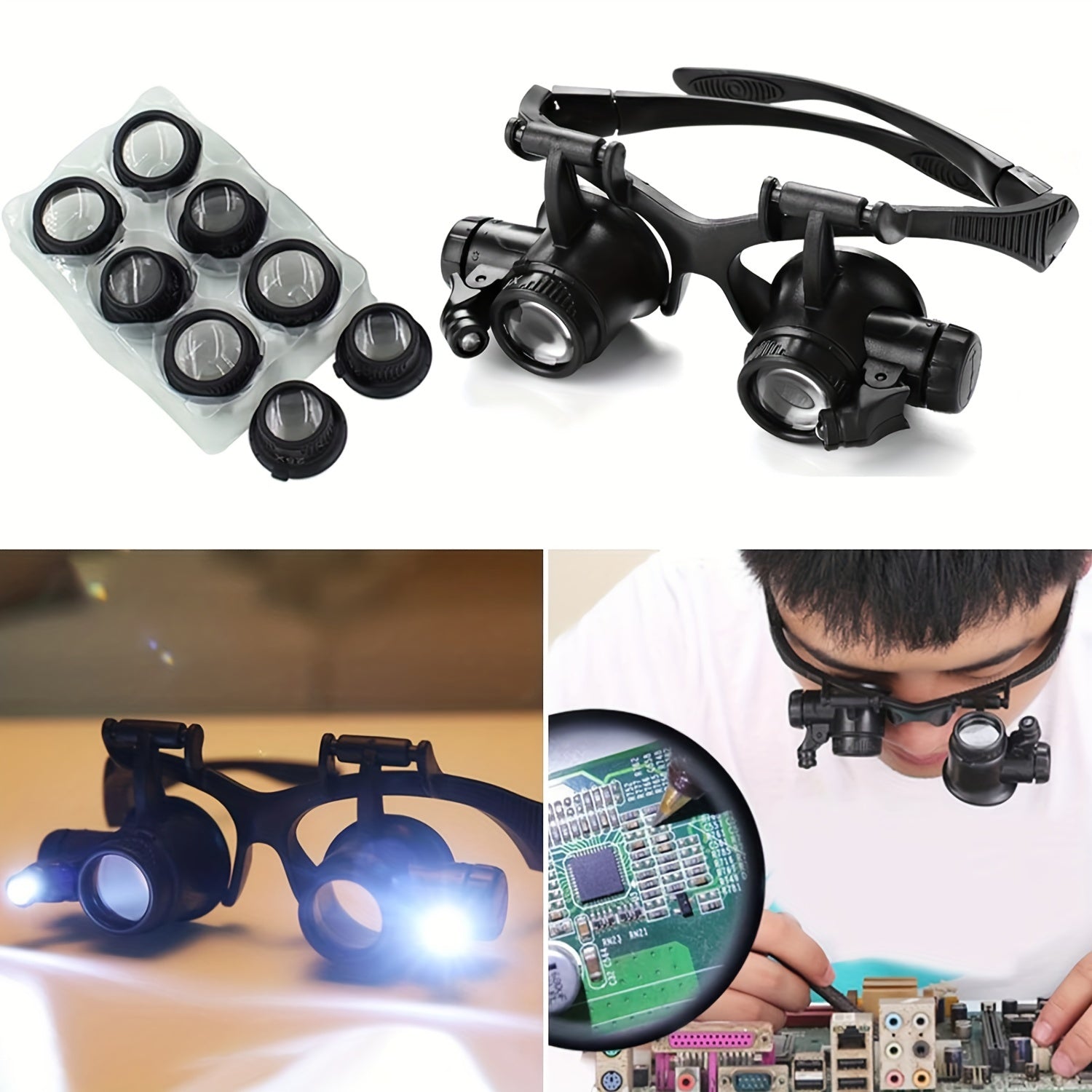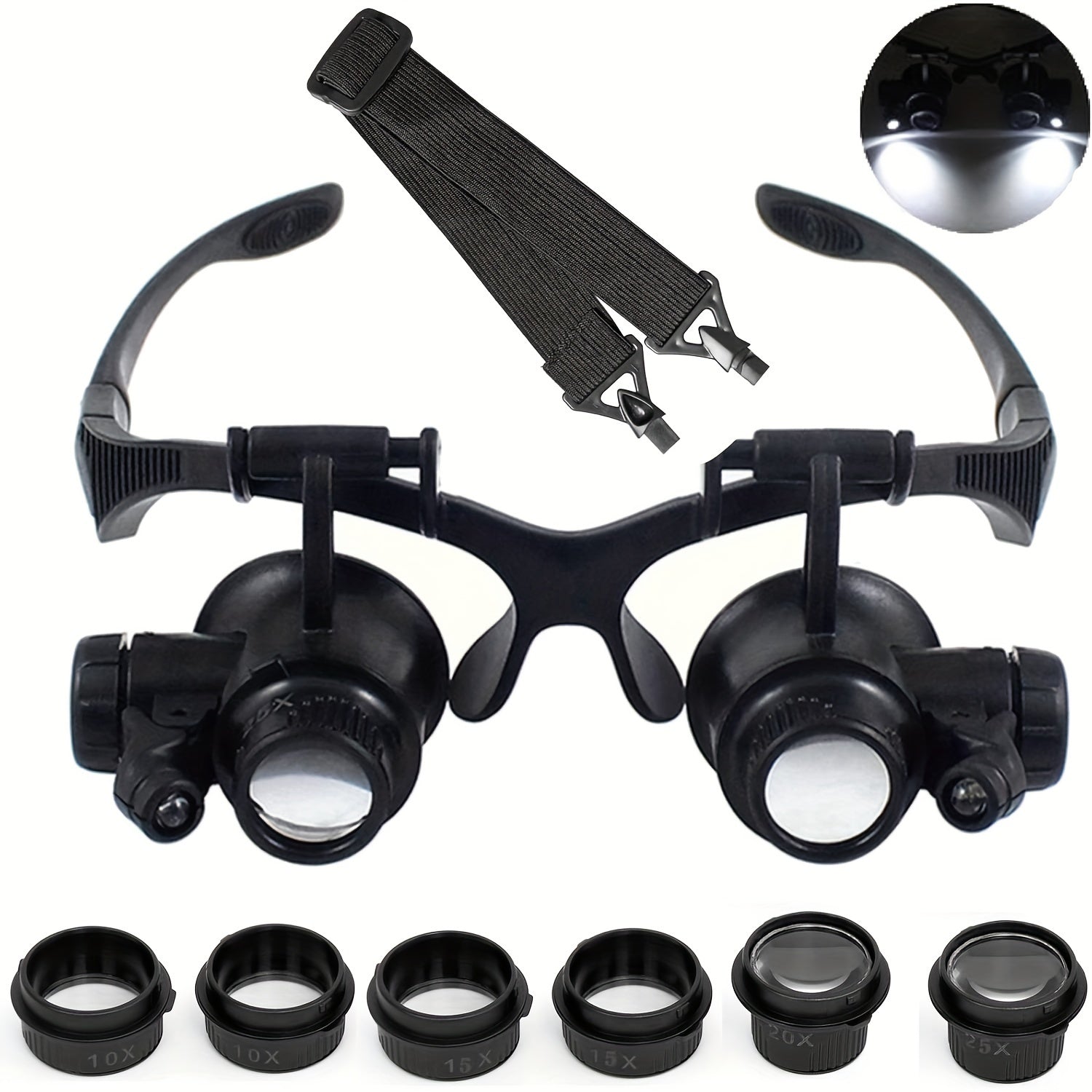 10X, 15X, 20X va 25X linzalari bilan boshband magnitli ko'zoynaklar to'plami. Turli vazifalar uchun LED chiroqli qo'l bilan taqiladigan loupe vizori. Qayta zaryadlanmaydigan tugmachali batareyalar bilan ishlaydi.