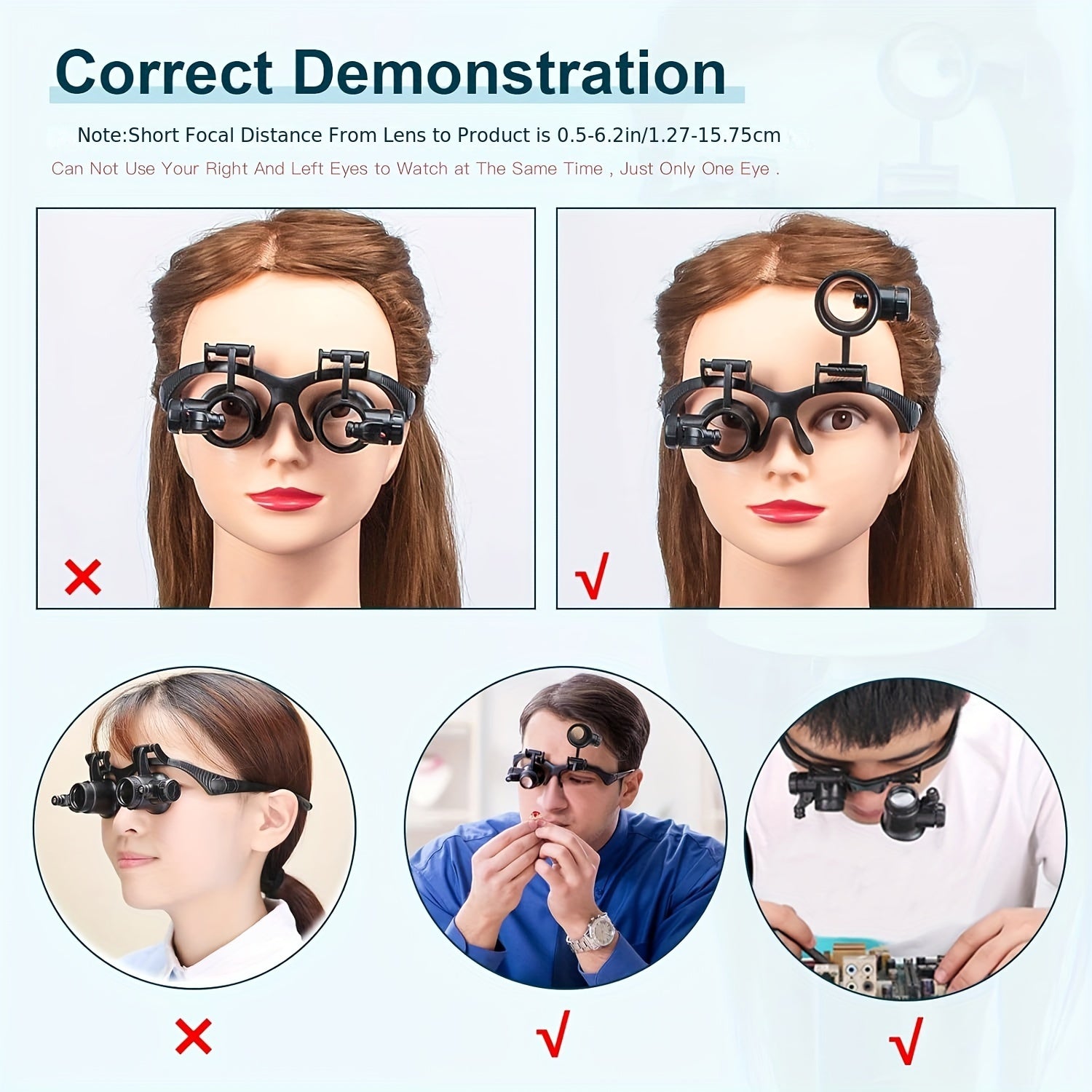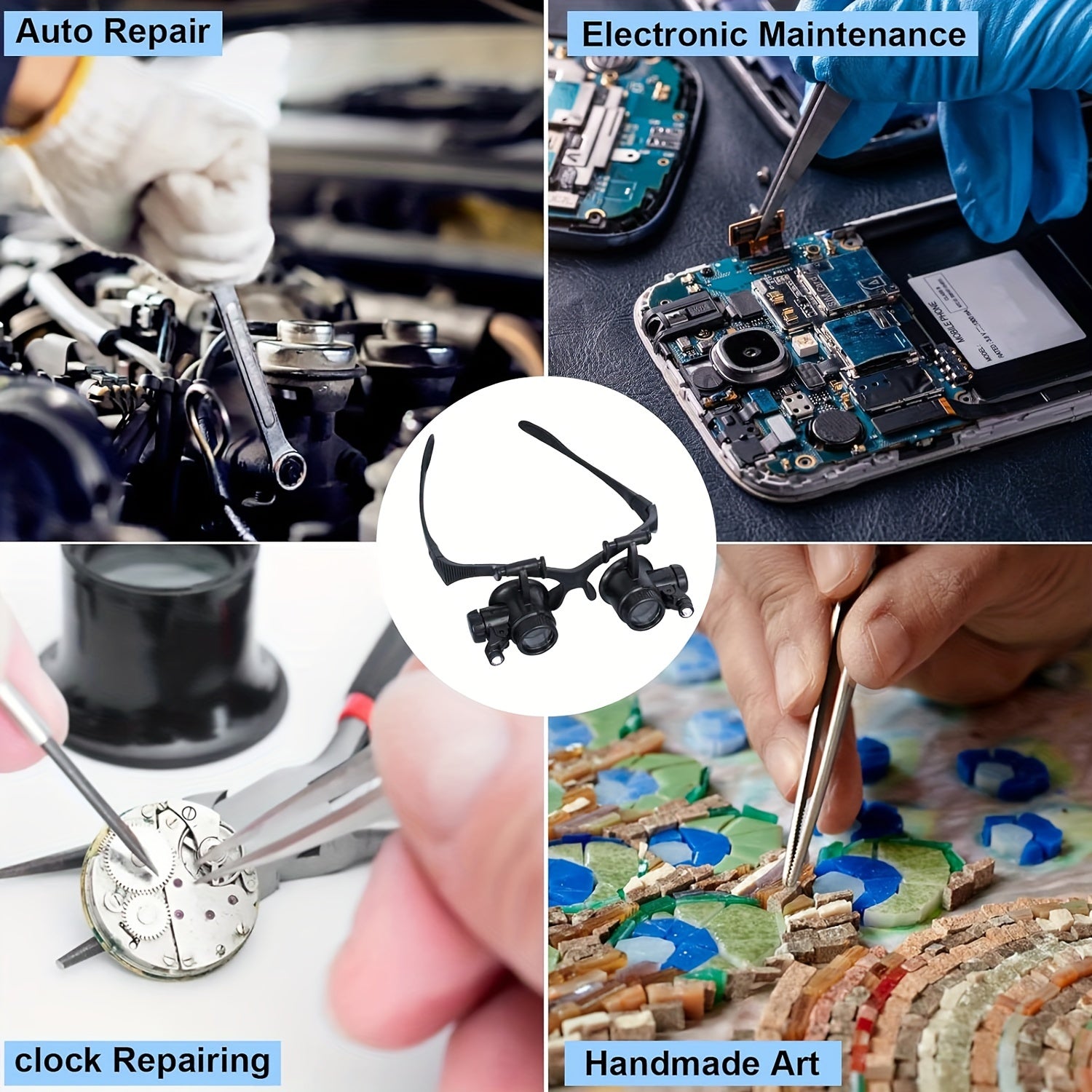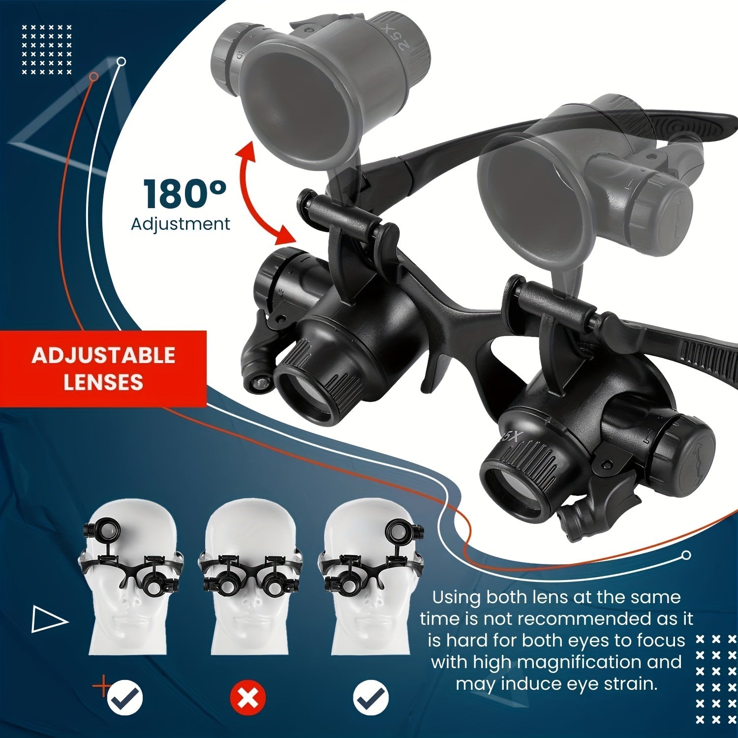 10X, 15X, 20X va 25X linzalari bilan boshband magnitli ko'zoynaklar to'plami. Turli vazifalar uchun LED chiroqli qo'l bilan taqiladigan loupe vizori. Qayta zaryadlanmaydigan tugmachali batareyalar bilan ishlaydi.
