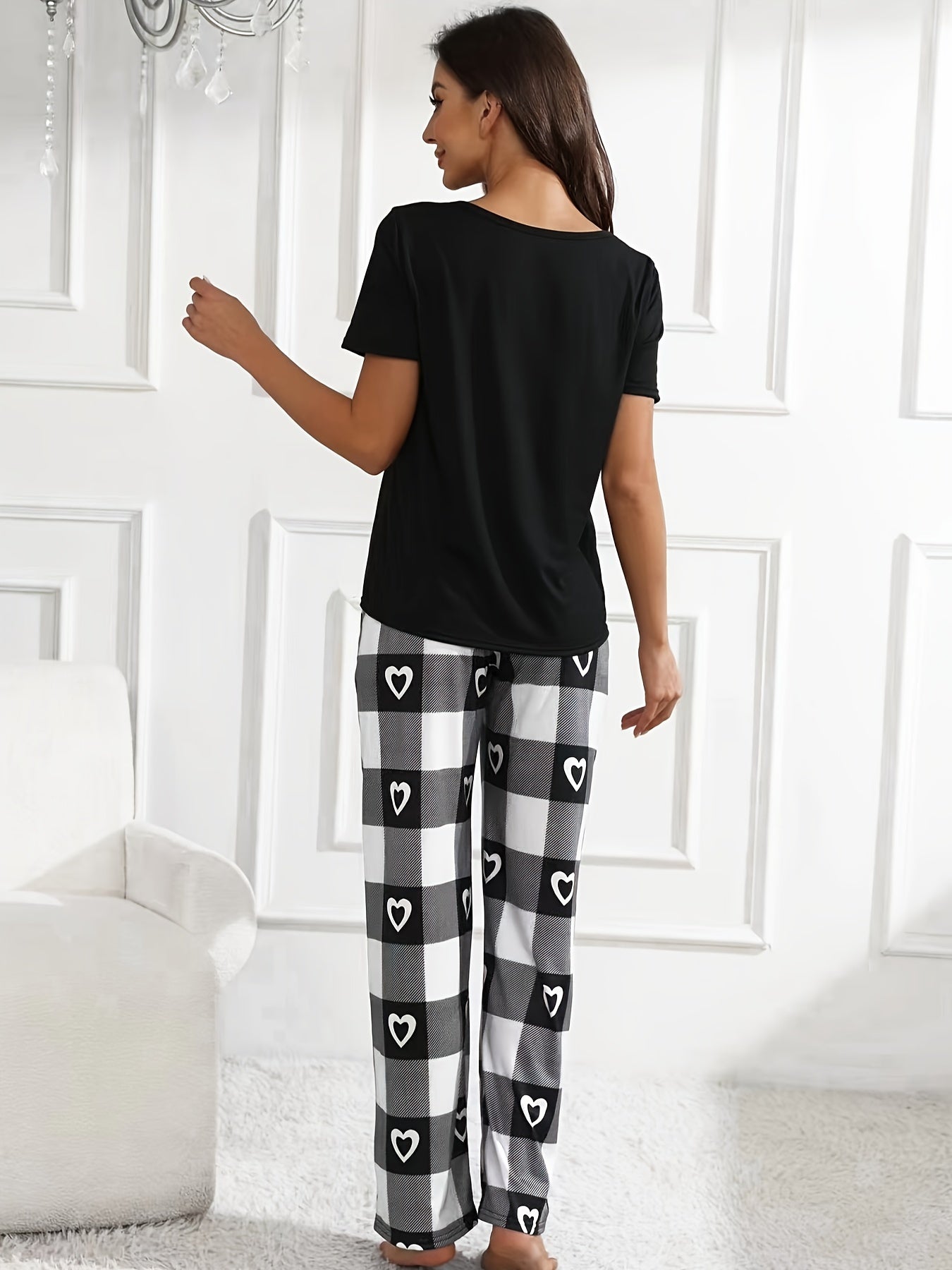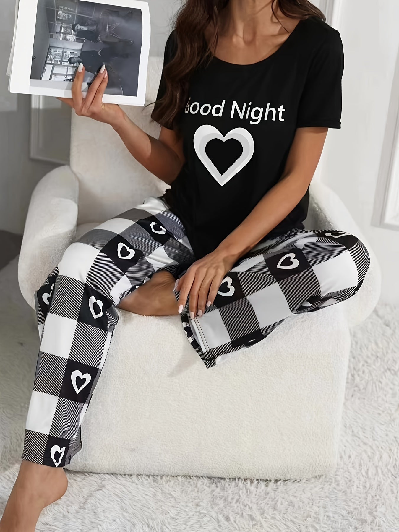 "Yurak va shiorli bosma pijama to'plami, qisqa dumaloq bo'yinli bluzka va plaid shimlar, ayollar uchun uyqu kiyimlari"