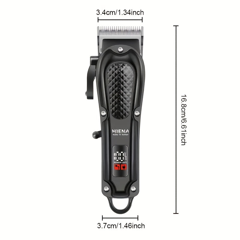 HIENA Erkaklar uchun parvarish to'plami LCD displey bilan - qayta zaryadlanadigan soch kesgich, soqol qirqish mashinasi va burun sochlari to'plami. USB zaryadlash, 1500mAh batareya, taroq hamda qo'shimchalar kiritilgan. Ideal Otalar kuni sovg'asi.