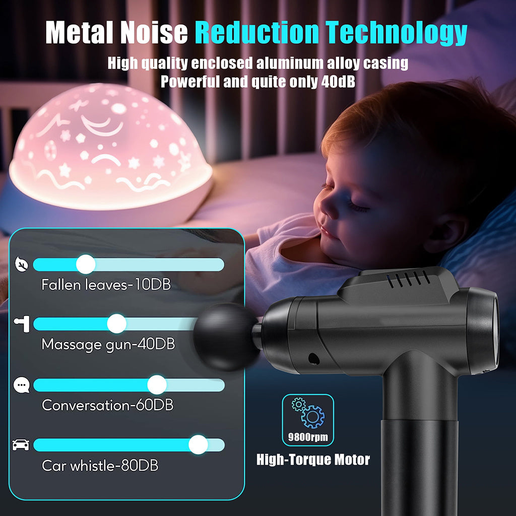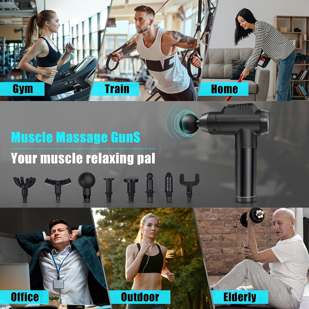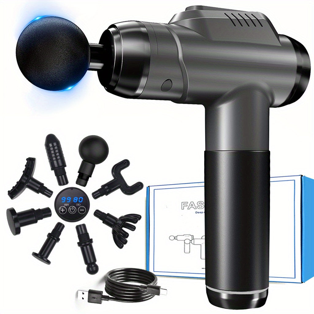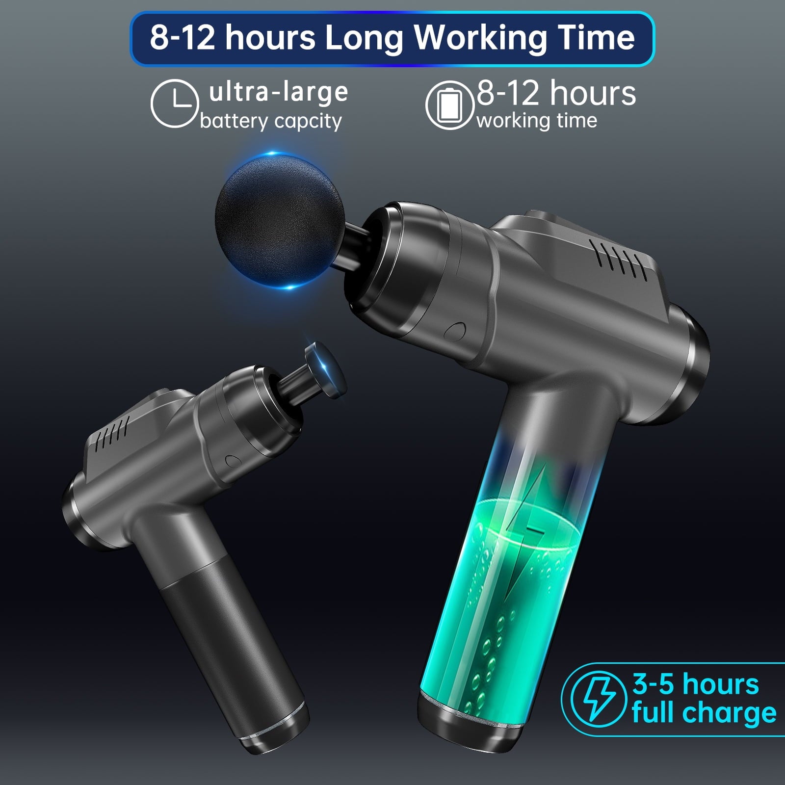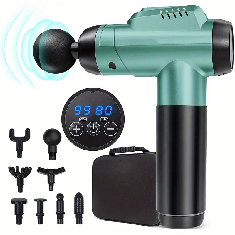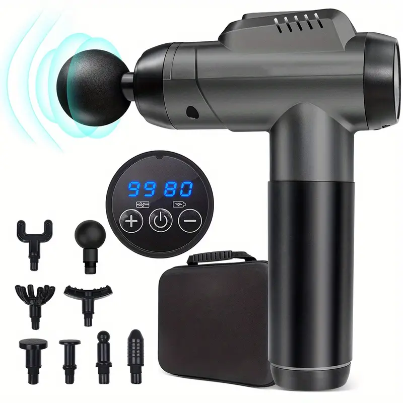 8 ta almashtiriladigan boshli yuqori quvvatli chuqur to'qima massaj quroli, USB orqali zaryadlanadigan, sozlanadigan tezliklar (1200-6000 RPM), LCD sensorli ekran, butun tanani bo'shatuvchi.