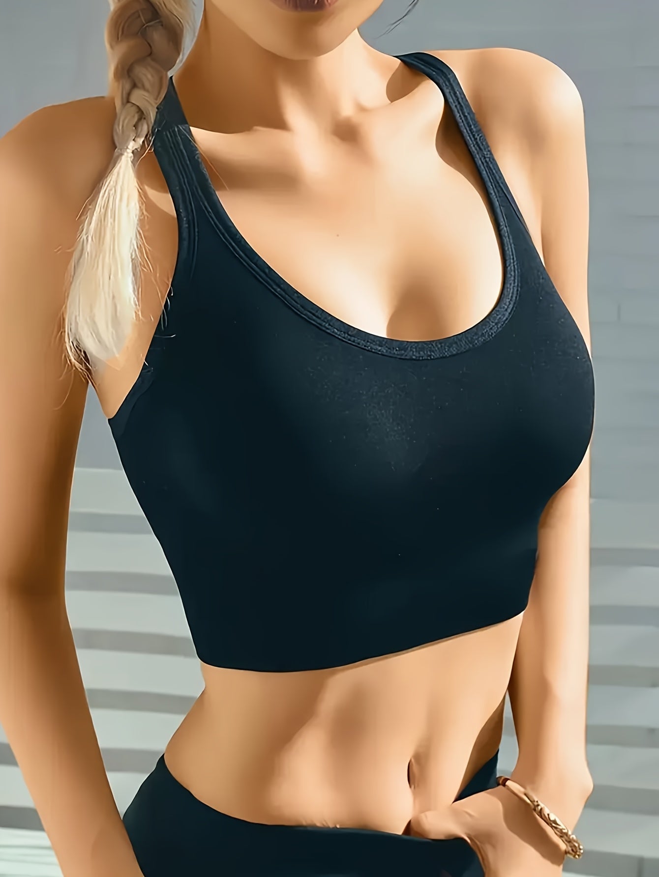 Ayollar uchun yuqori qo'llab-quvvatlovchi sport brassi, sozlanadigan orqa tugma, olib tashlanadigan yostiqlar va kesish-orqa dizayni bilan. Yoga, fitnes va yugurish uchun juda mos. Havo o'tkazuvchan nylon matodan tayyorlangan.