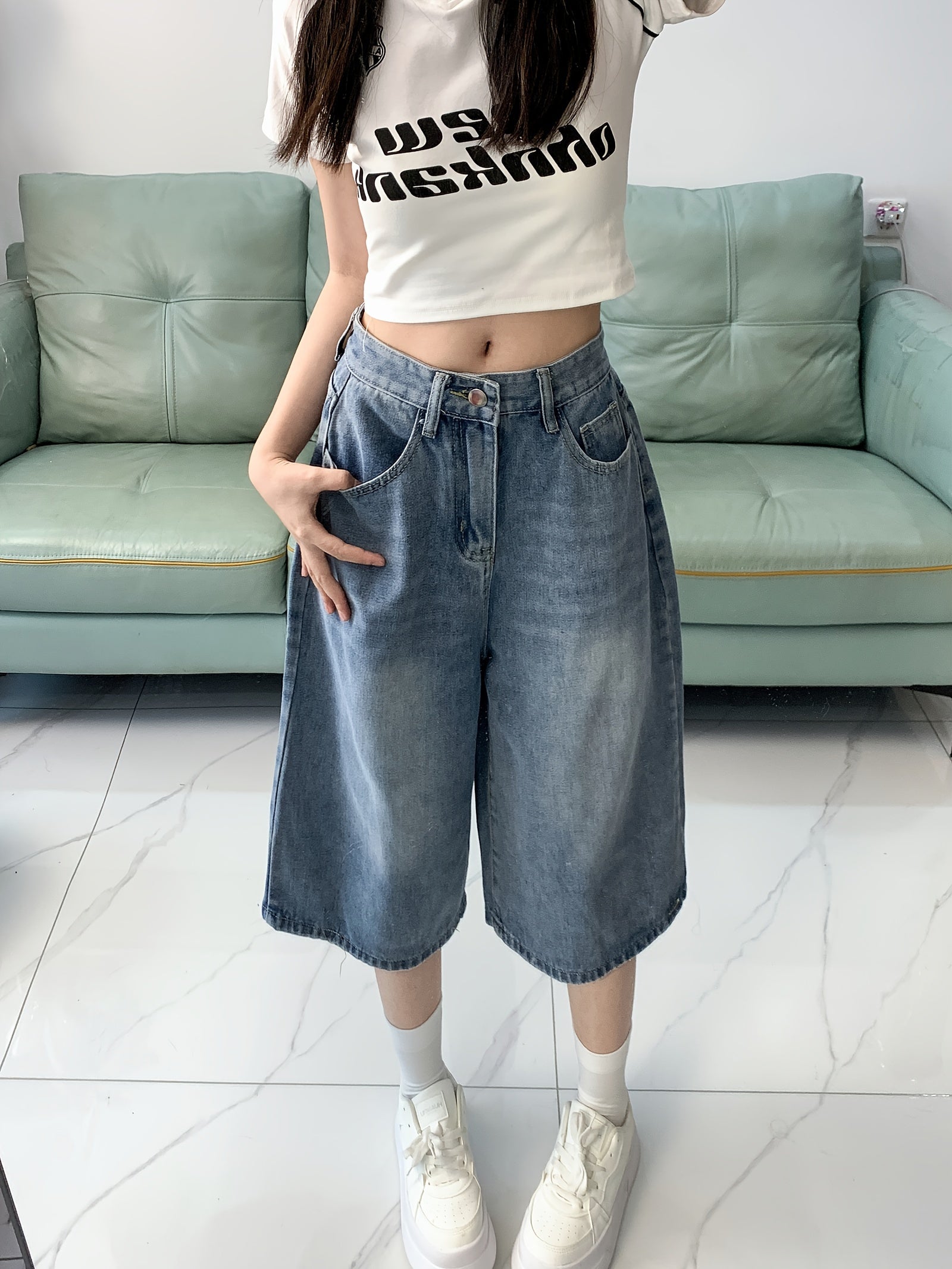Ayollar uchun yuqori belli denim shortlar, tugmachali, to'g'ri oyoq va ozgina cho'ziladigan, bahor/yaz uchun mukammal.