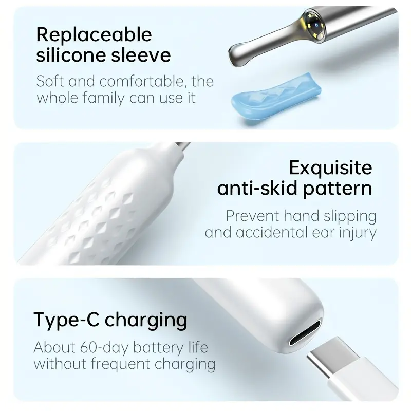 INSKAM Simsiz Quloq Mumini Olib Tashlash Vositasi, Kamera, Yorug'lik, 7 dona Quloq Qopqog'i To'plami, 6 dona Silikon Qop, Qayta Zaryadlanadigan Batareya, Ikki Quvvat, ≤36V Ishlash Voltaji, Barcha Mobil Telefonlar Uchun, Oson va