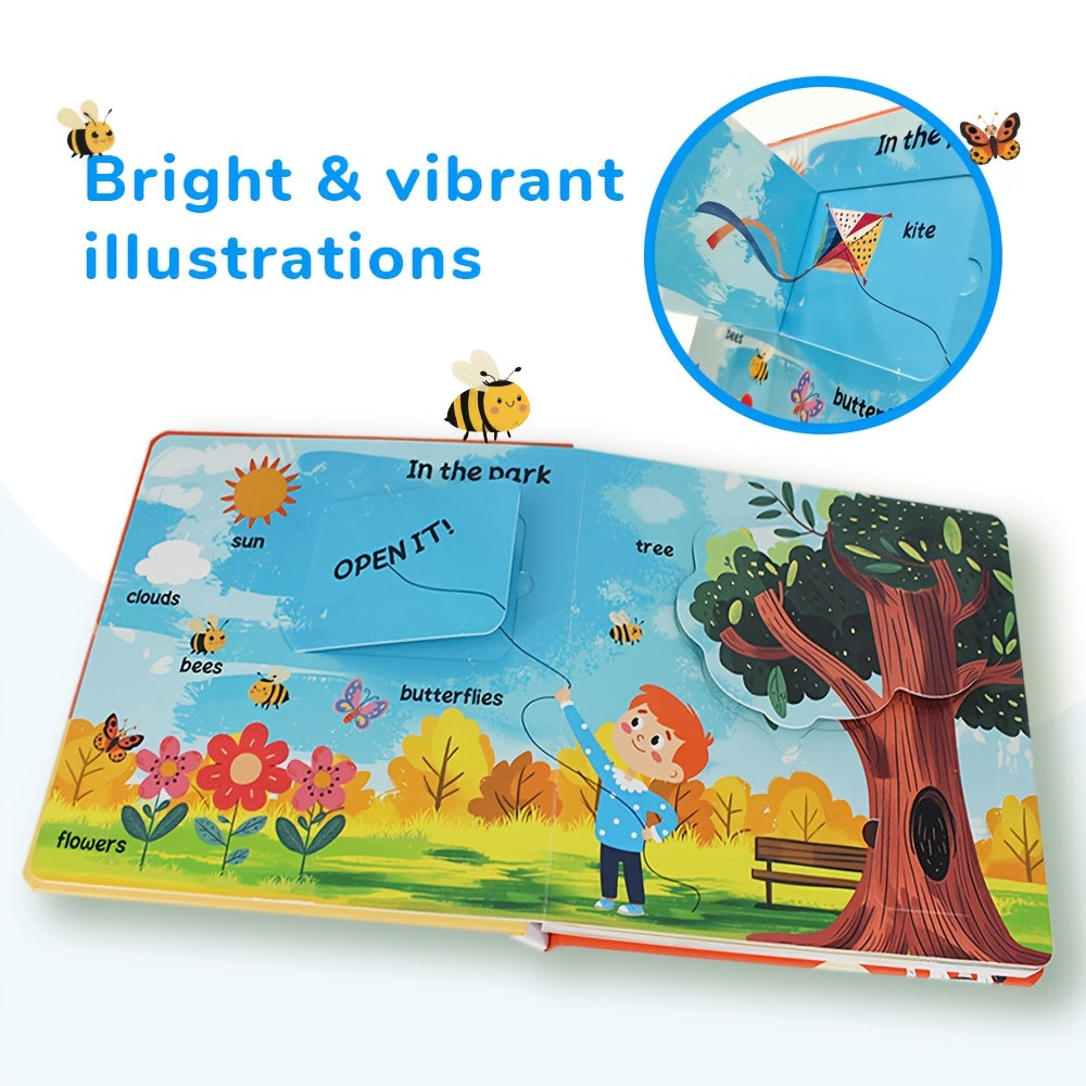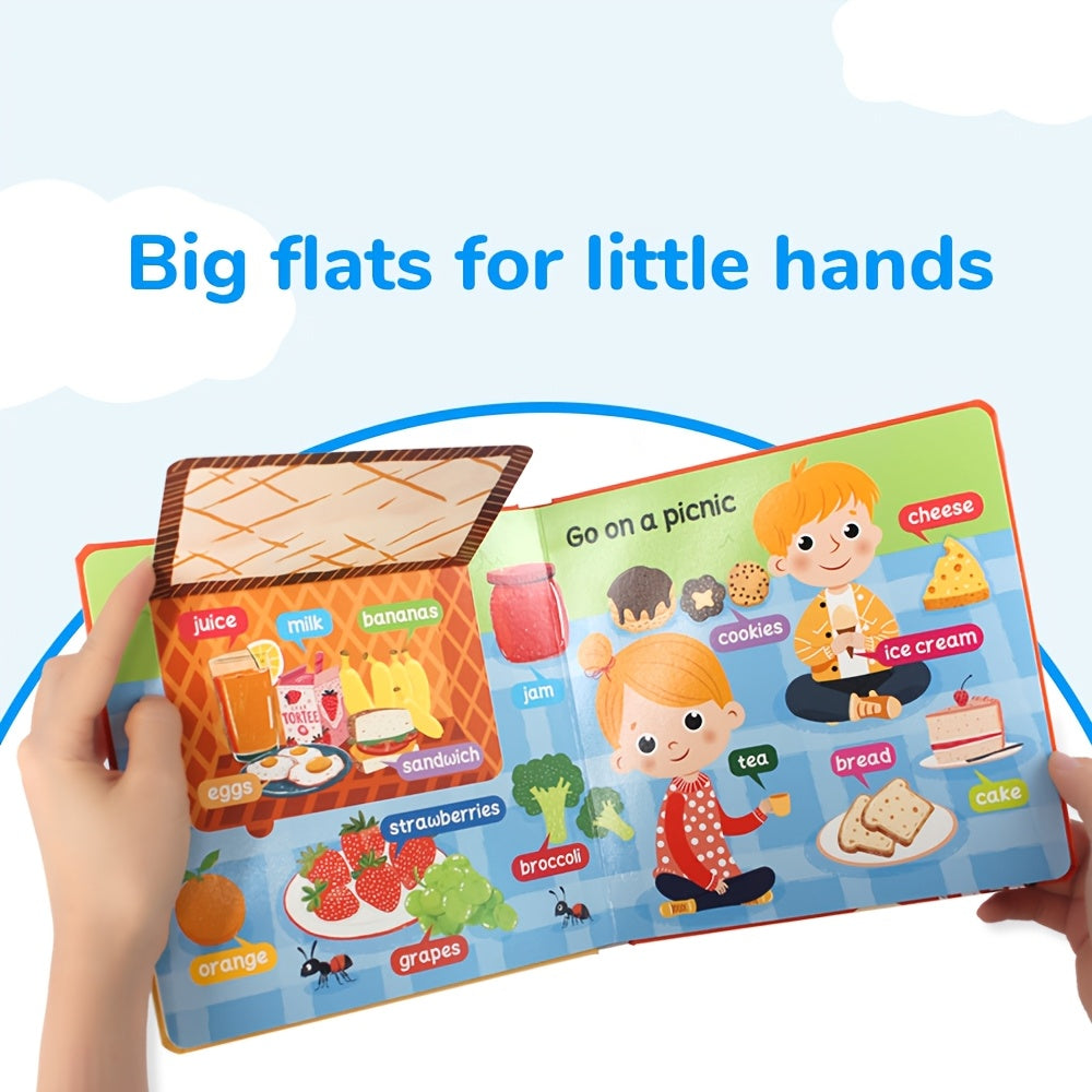 "Finding The First Word" kitobidagi interaktiv sahifa aylantirish, 1-3 yoshdagi bolalar uchun uyda va maktabgacha ta'lim muassasalarida qiziqarli ta'lim kitobi qiladi.
