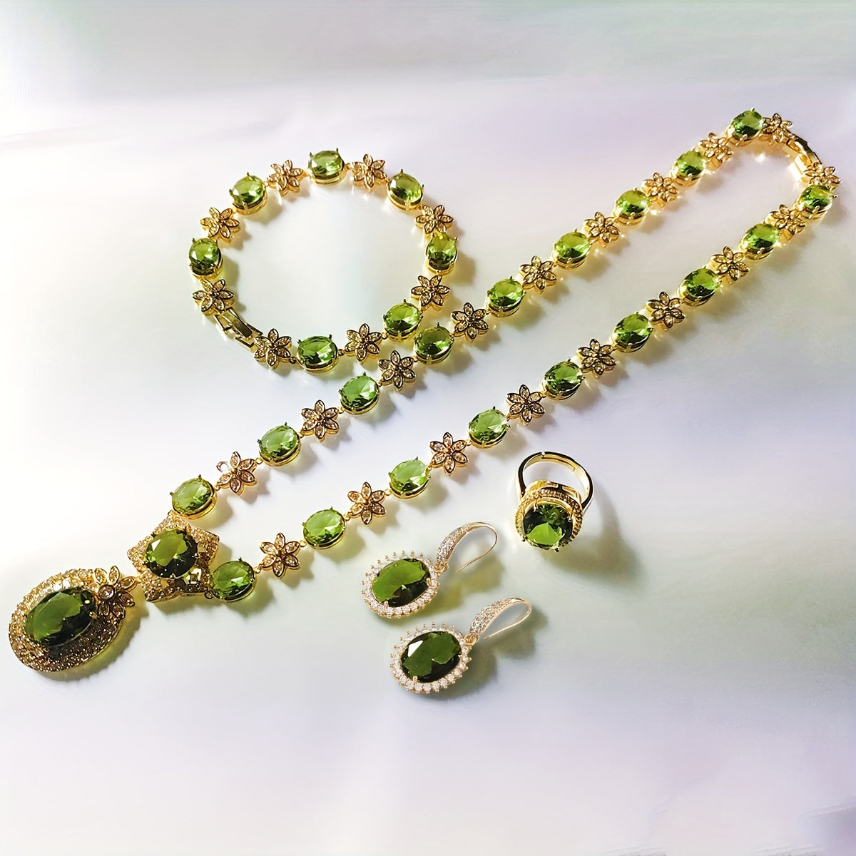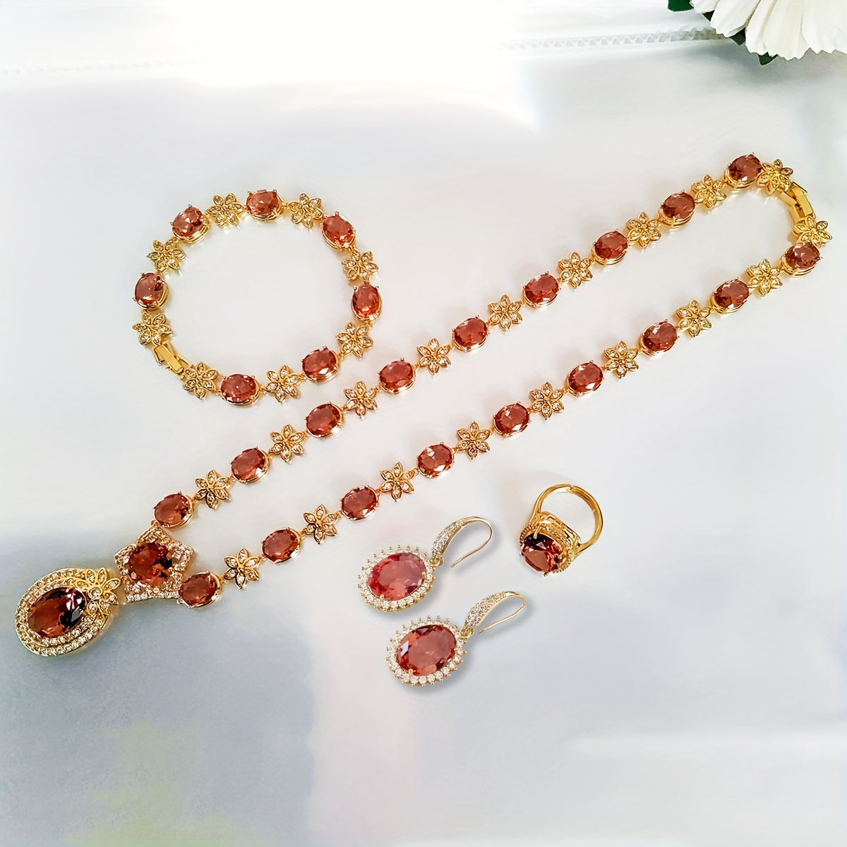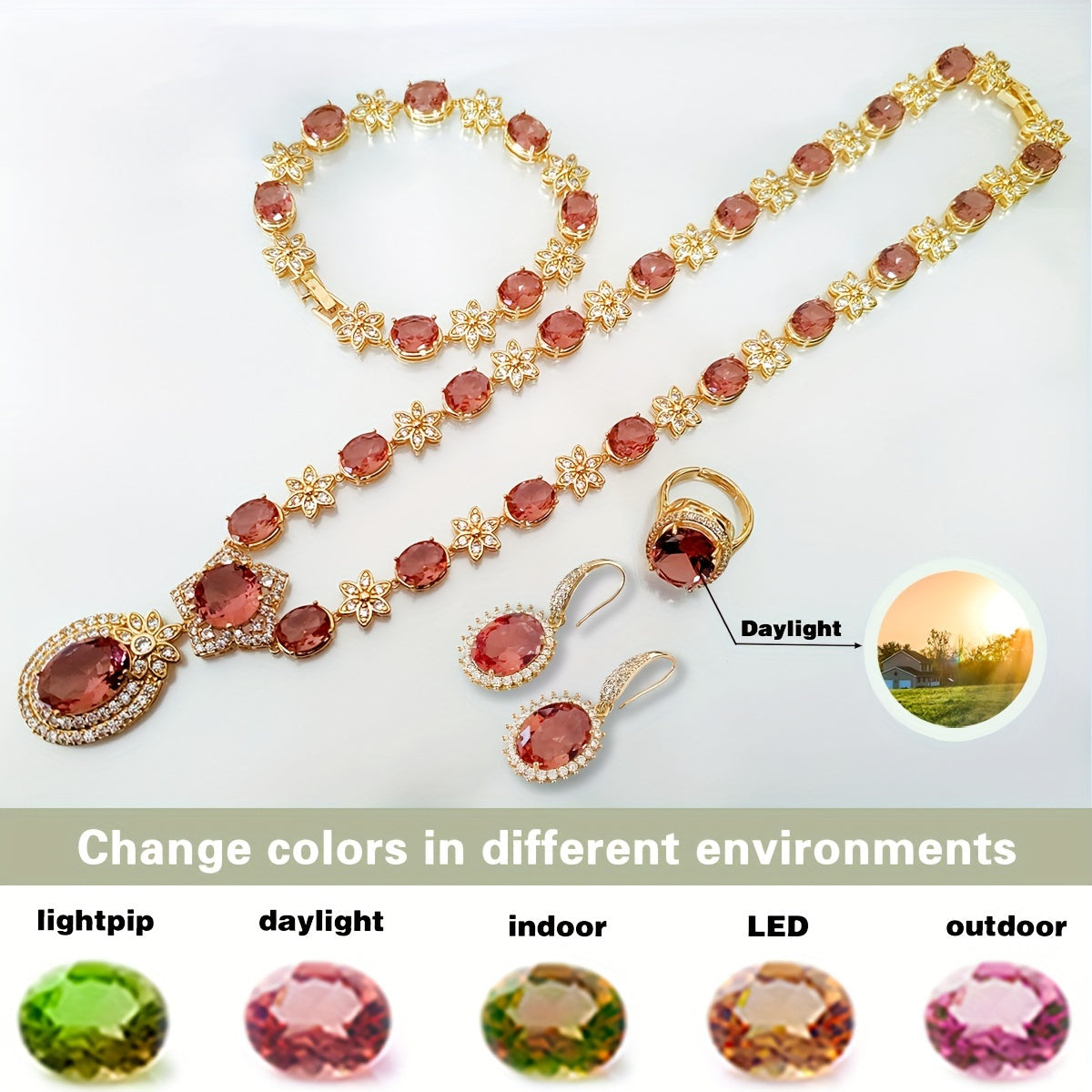 MEETMAY sintetik rang o'zgartiruvchi sultanite diaspore oval quyosh gulini taqdim etamiz. Ushbu nafis mis rangidagi to'rt qismli to'plamga uzuk, sirg'a, bilaguzuk va marjon kiradi. Ranglar turli yoritish sharoitlariga moslashish uchun sozlanishi mumkin.