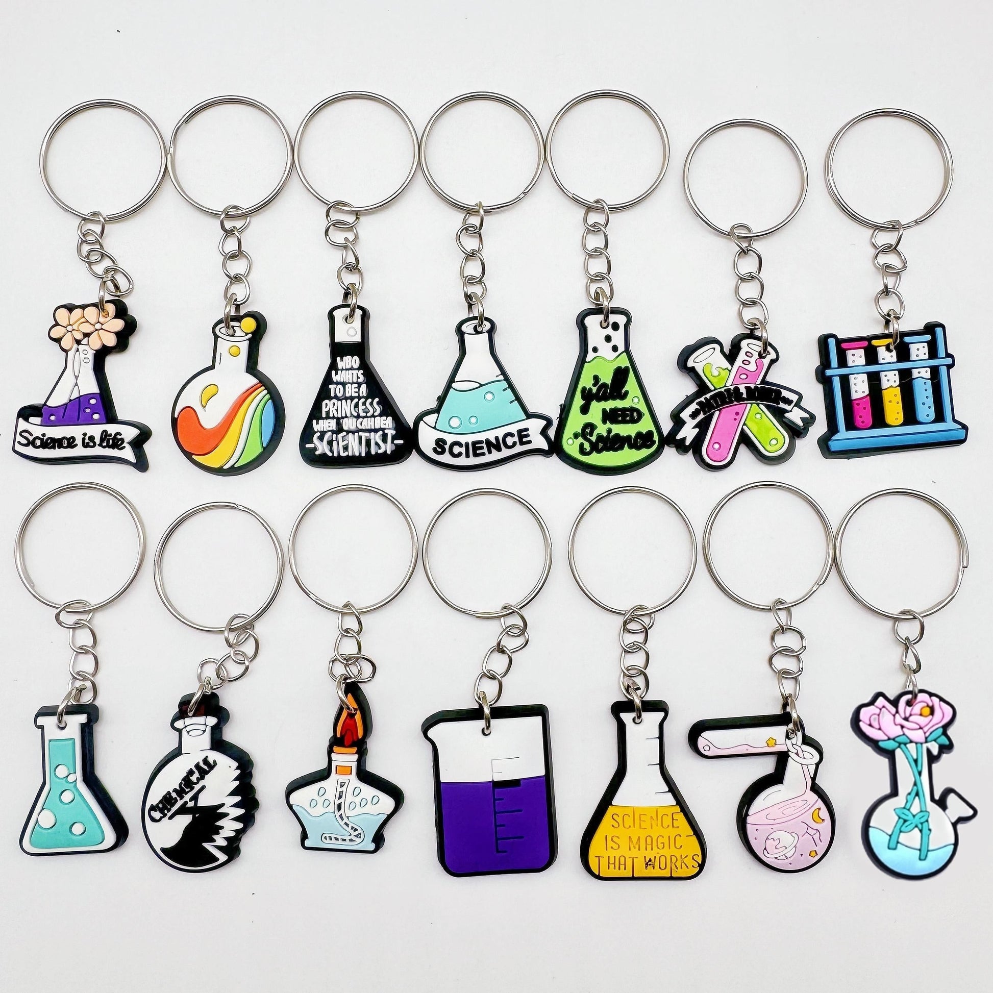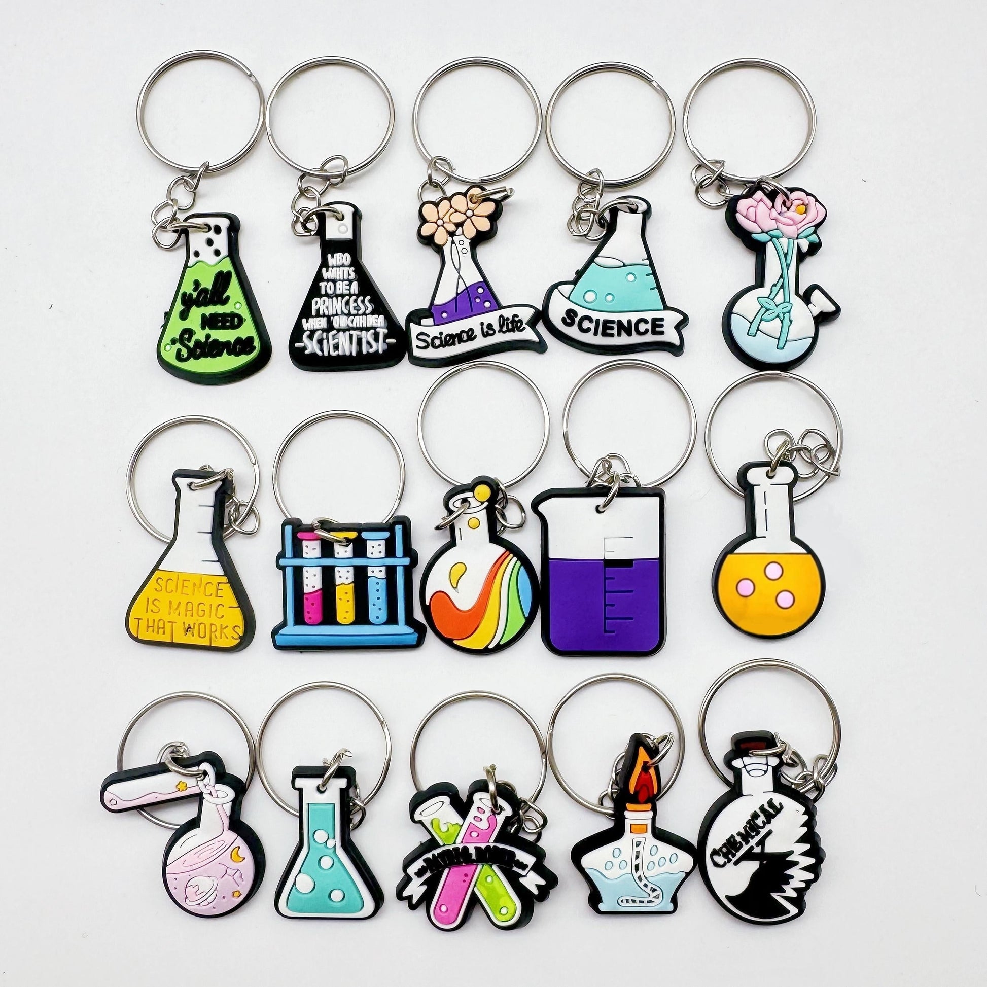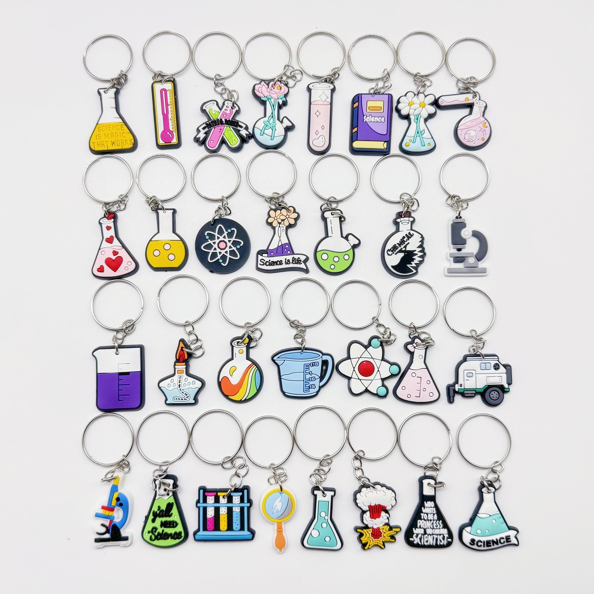 Kimyo va biologiya laboratoriyasi mavzulari bilan kalit zanjiri to'plami, test quvurlari, beakerlar, spirtli lampalar va uchburchak shishalar bilan - talabalar va maktab bezaklari uchun ideal, fan ilhomlantirgan.