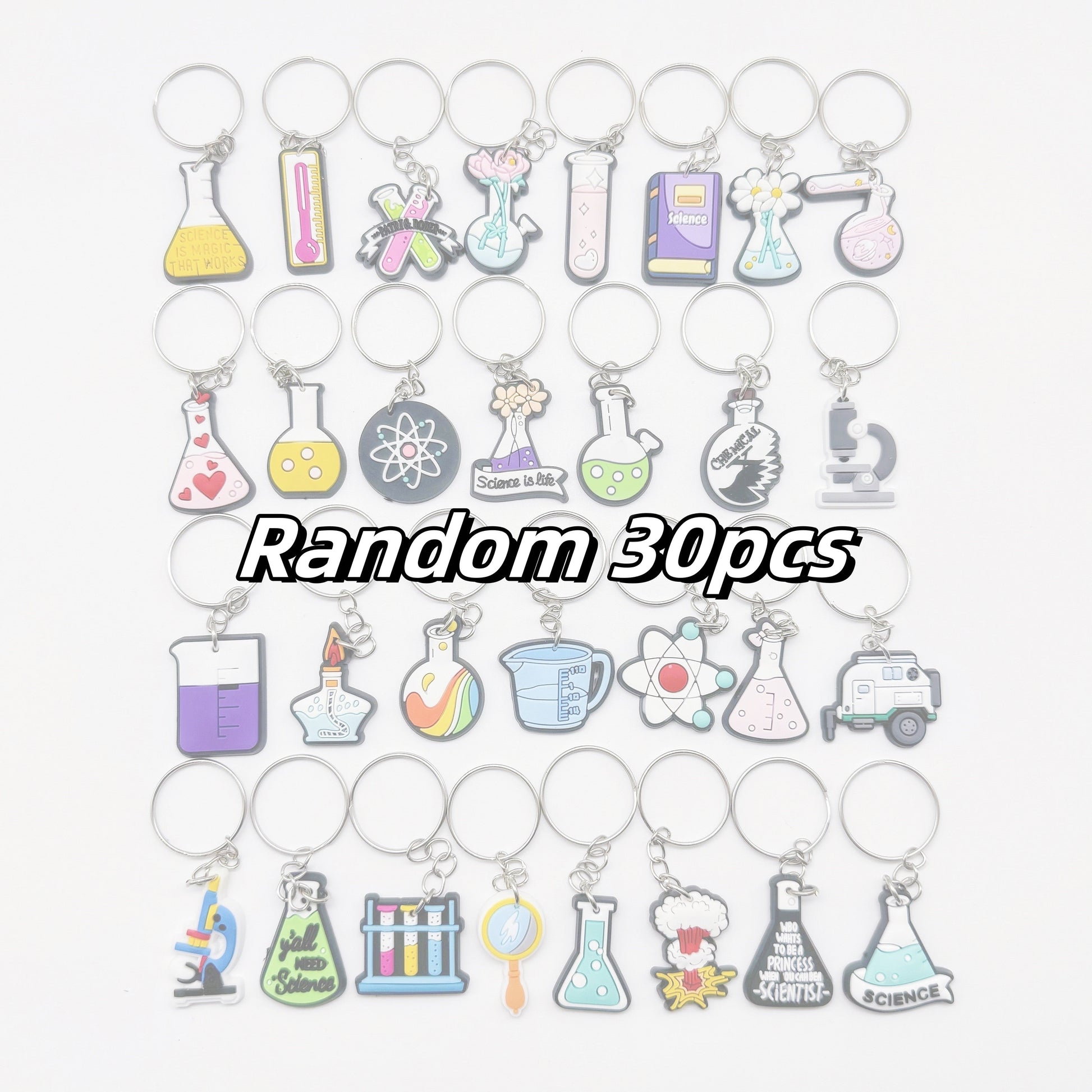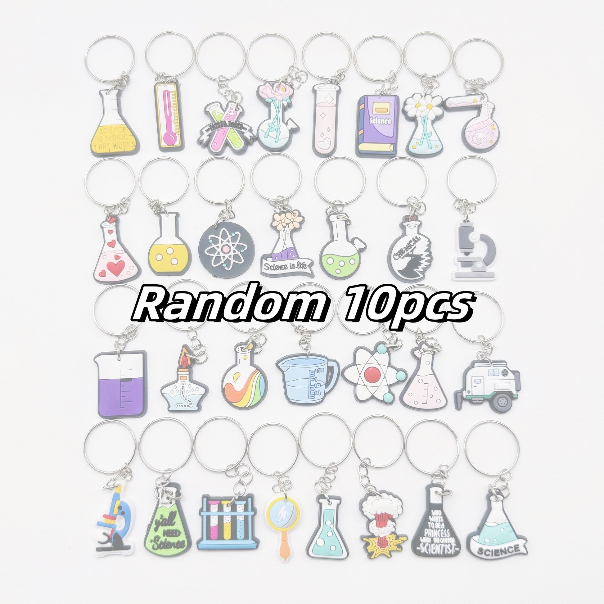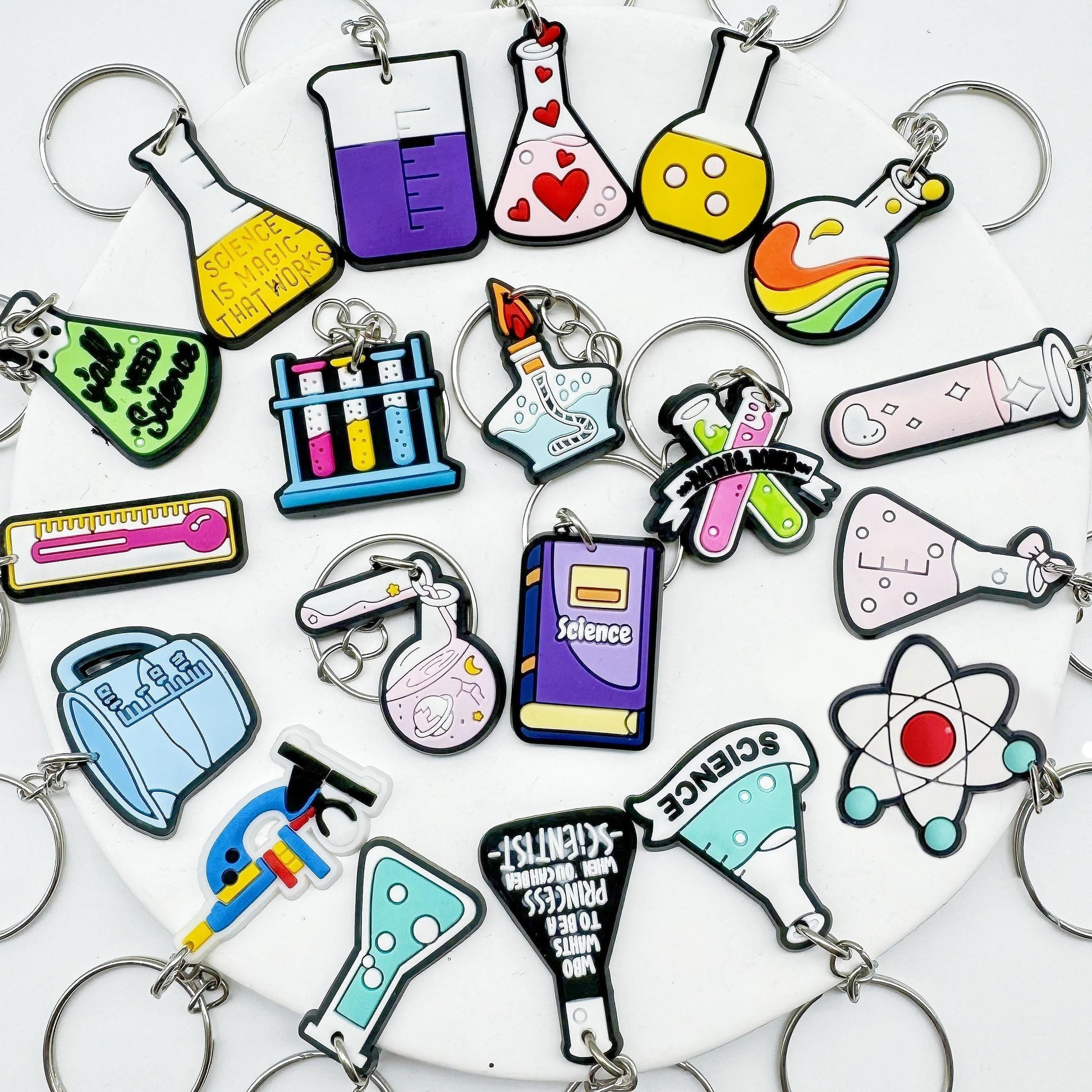 Kimyo va biologiya laboratoriyasi mavzulari bilan kalit zanjiri to'plami, test quvurlari, beakerlar, spirtli lampalar va uchburchak shishalar bilan - talabalar va maktab bezaklari uchun ideal, fan ilhomlantirgan.