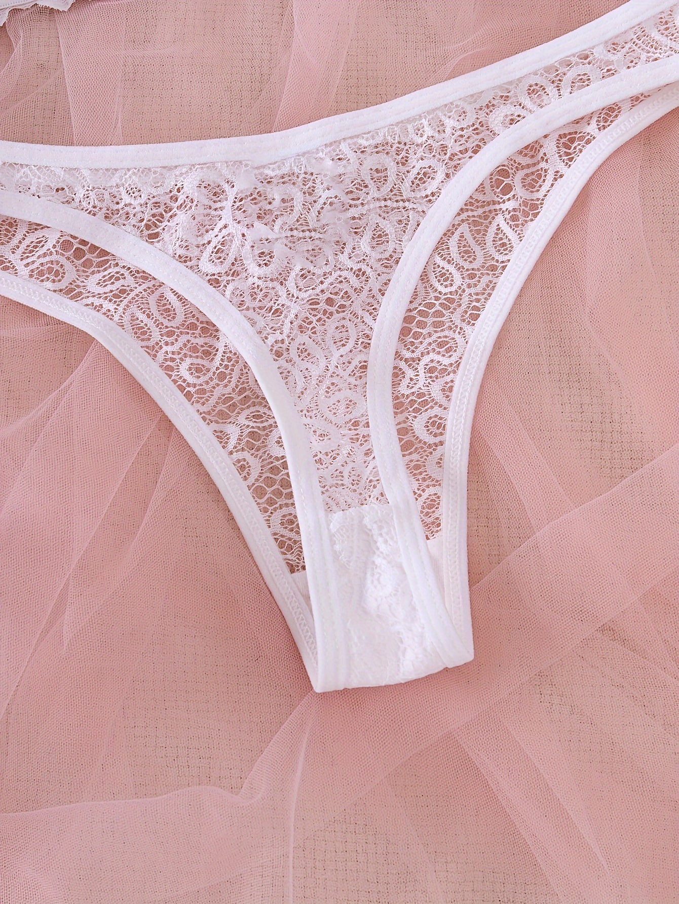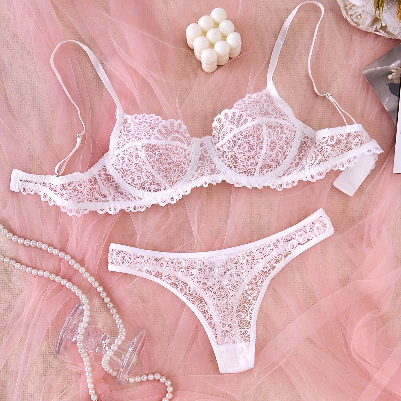 Tarmoq tafsilotlari bilan dantel brassu va ichki kiyim to'plami, ochiq, lekin qulay dizayn.