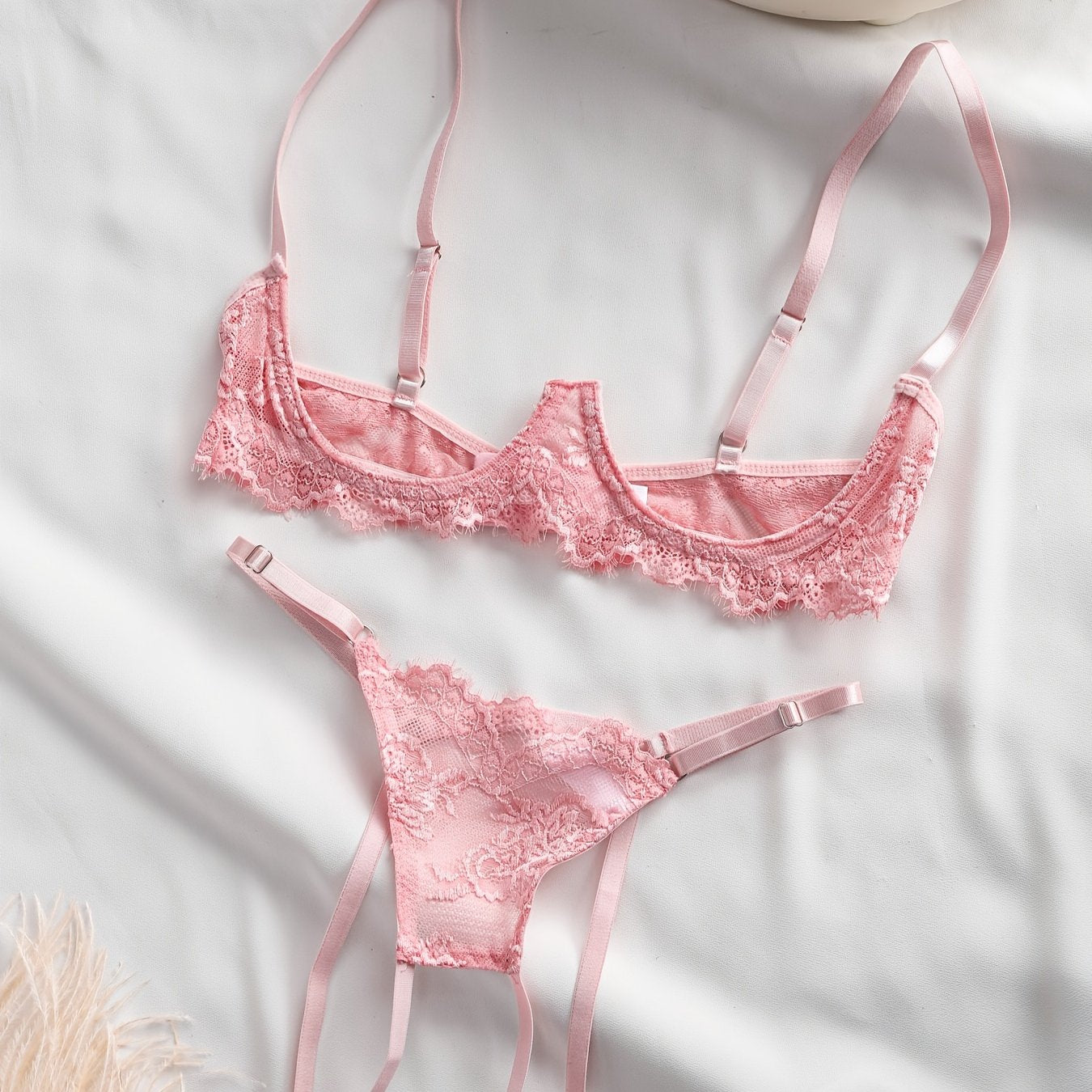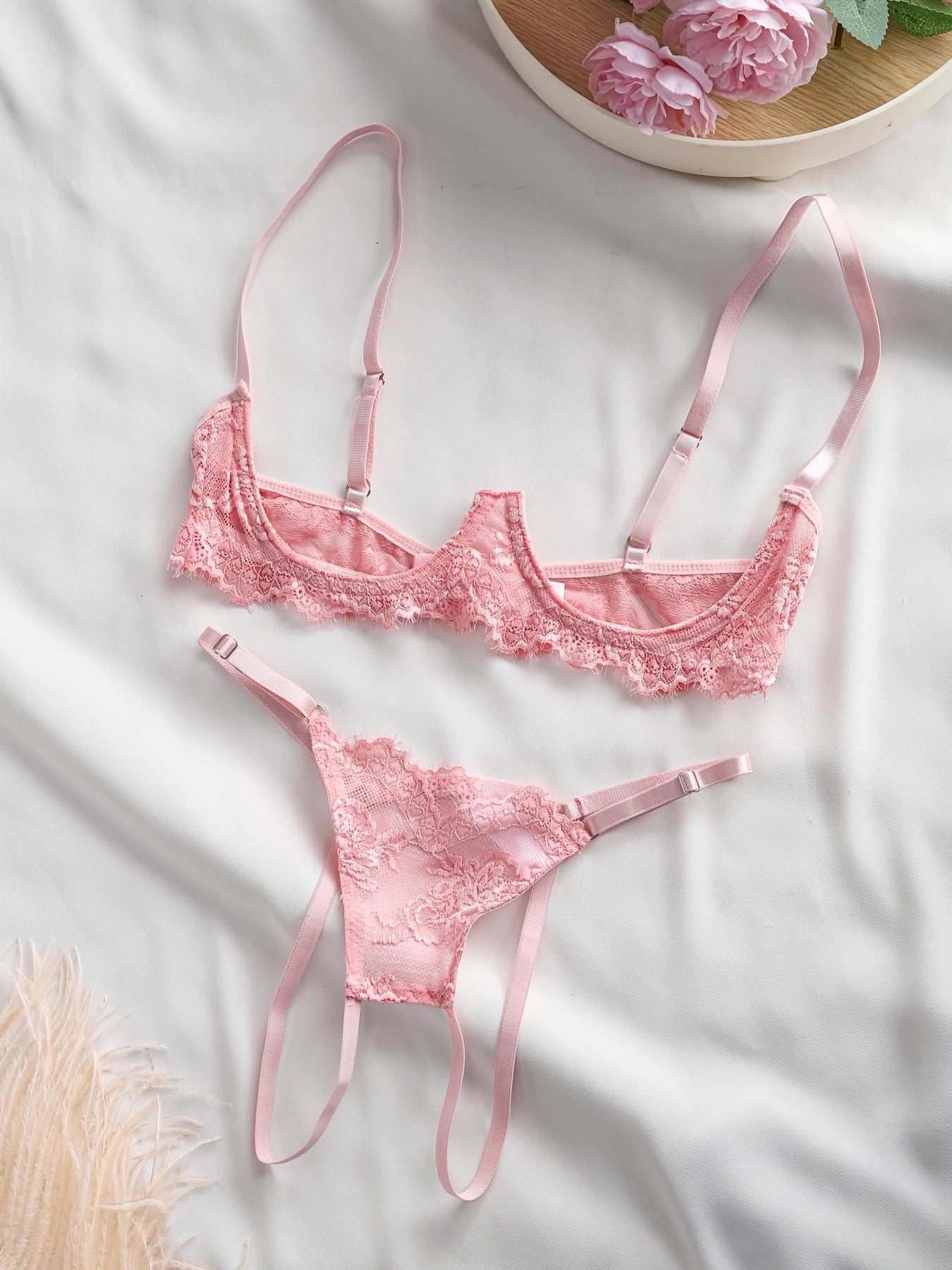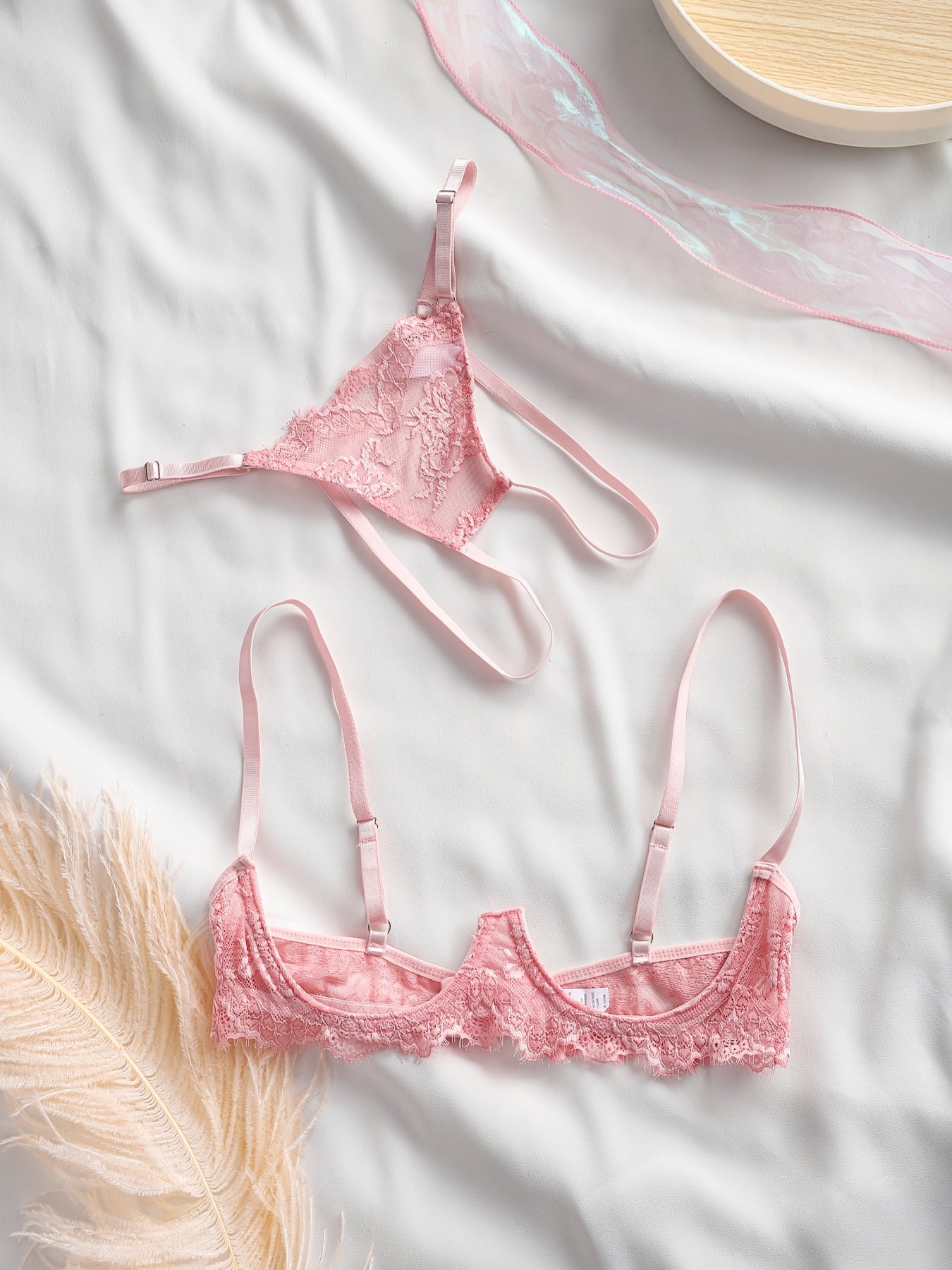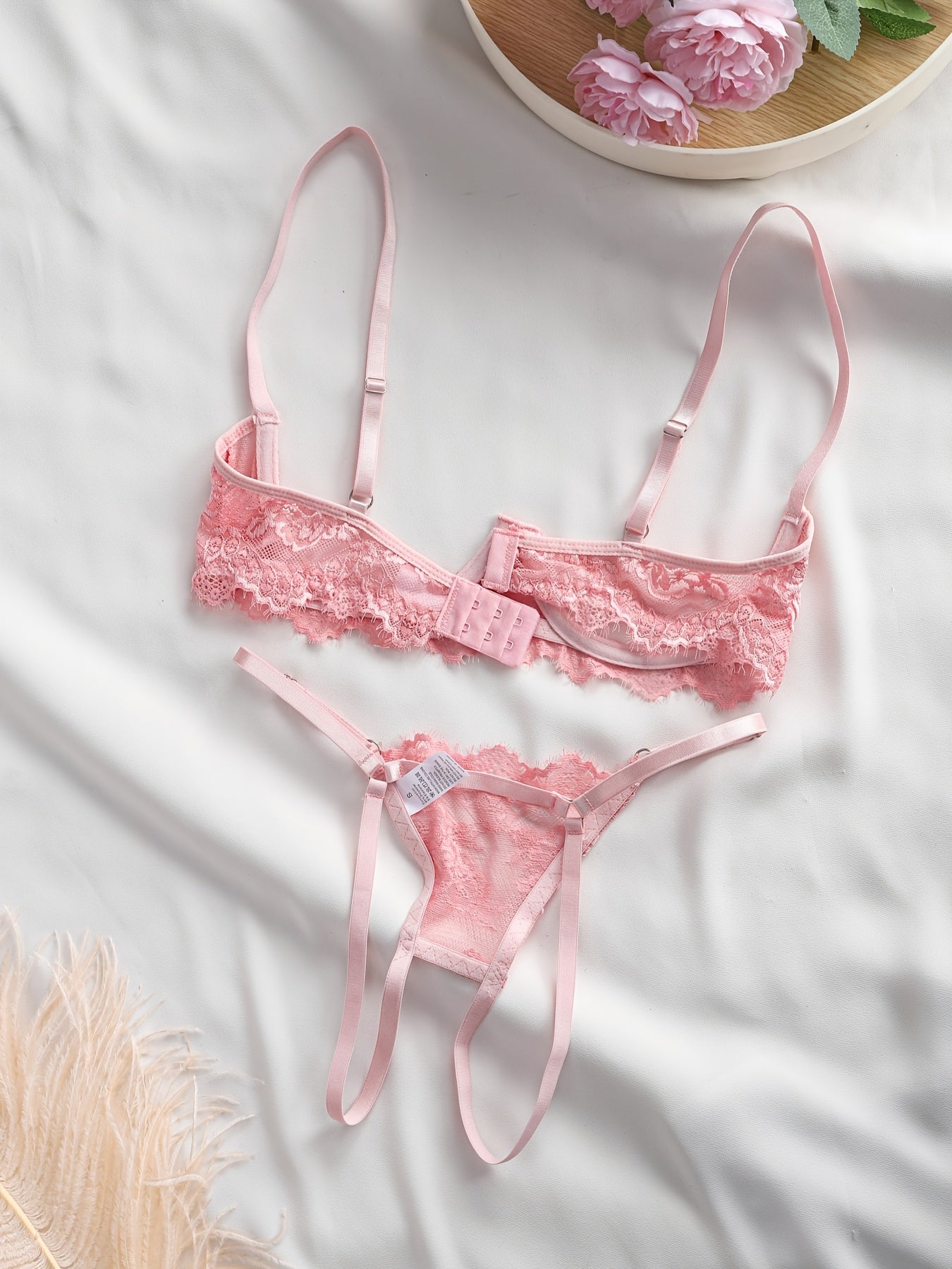 Gul dizayni, nozik kamarlar va orqa qismi ochiq kesimga ega bo'lgan ayollar uchun dantel ichki kiyim to'plami.