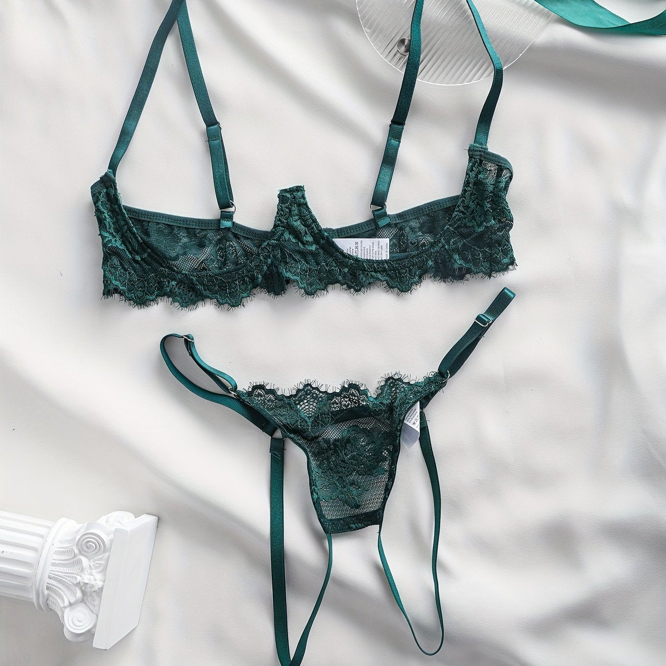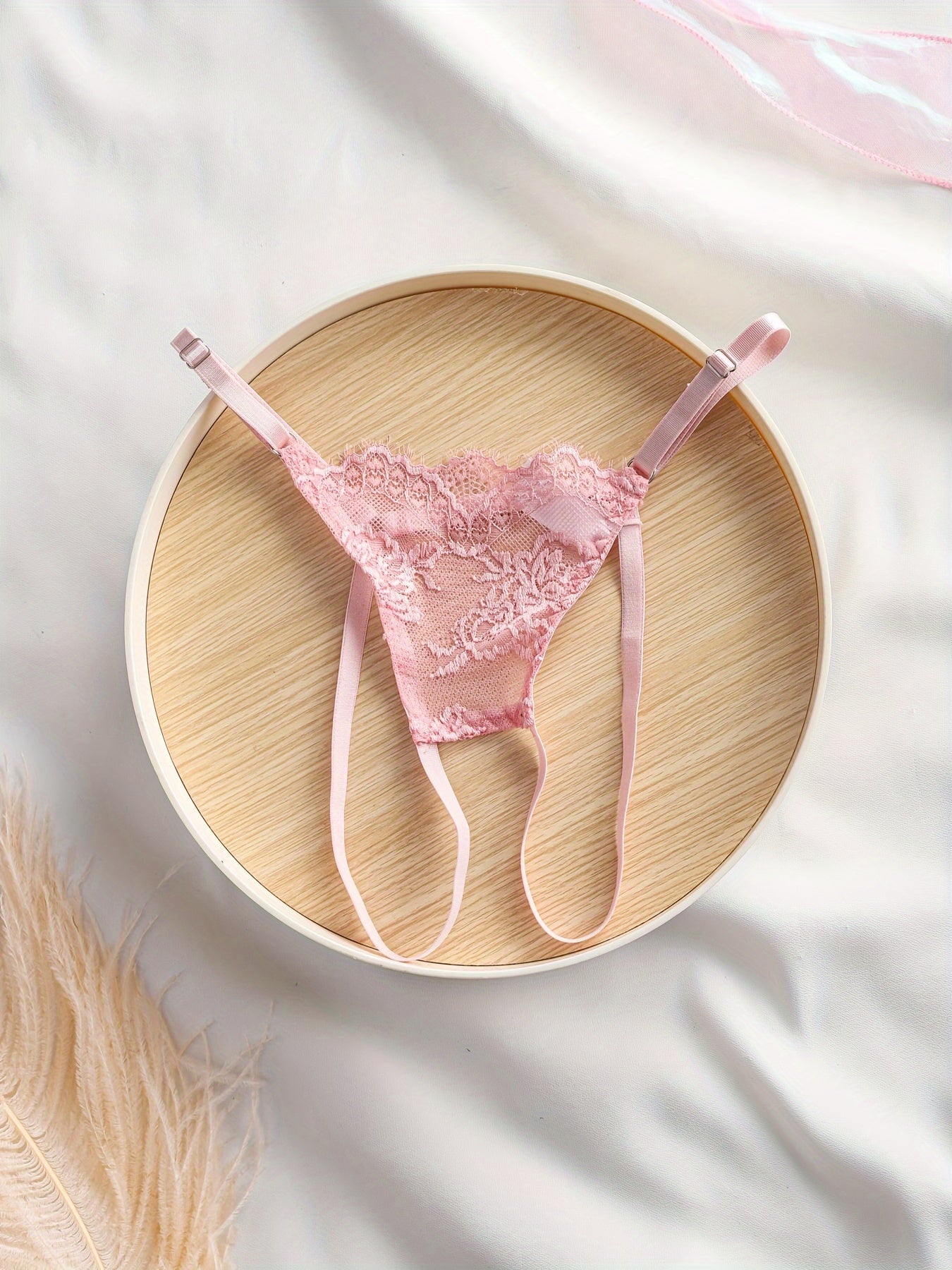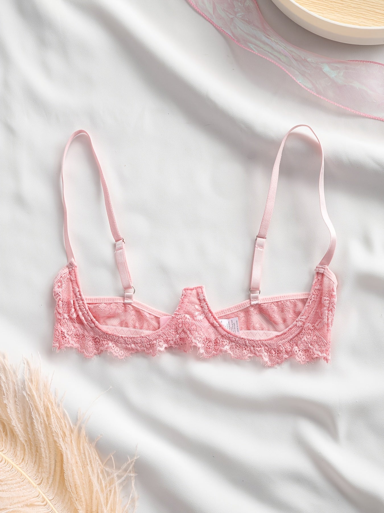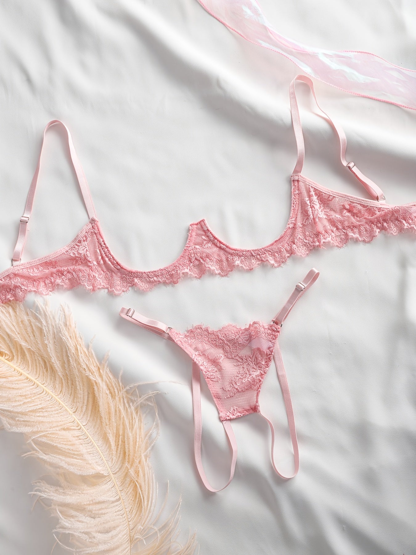 Gul dizayni, nozik kamarlar va orqa qismi ochiq kesimga ega bo'lgan ayollar uchun dantel ichki kiyim to'plami.