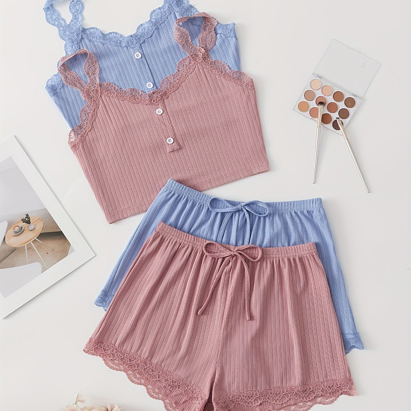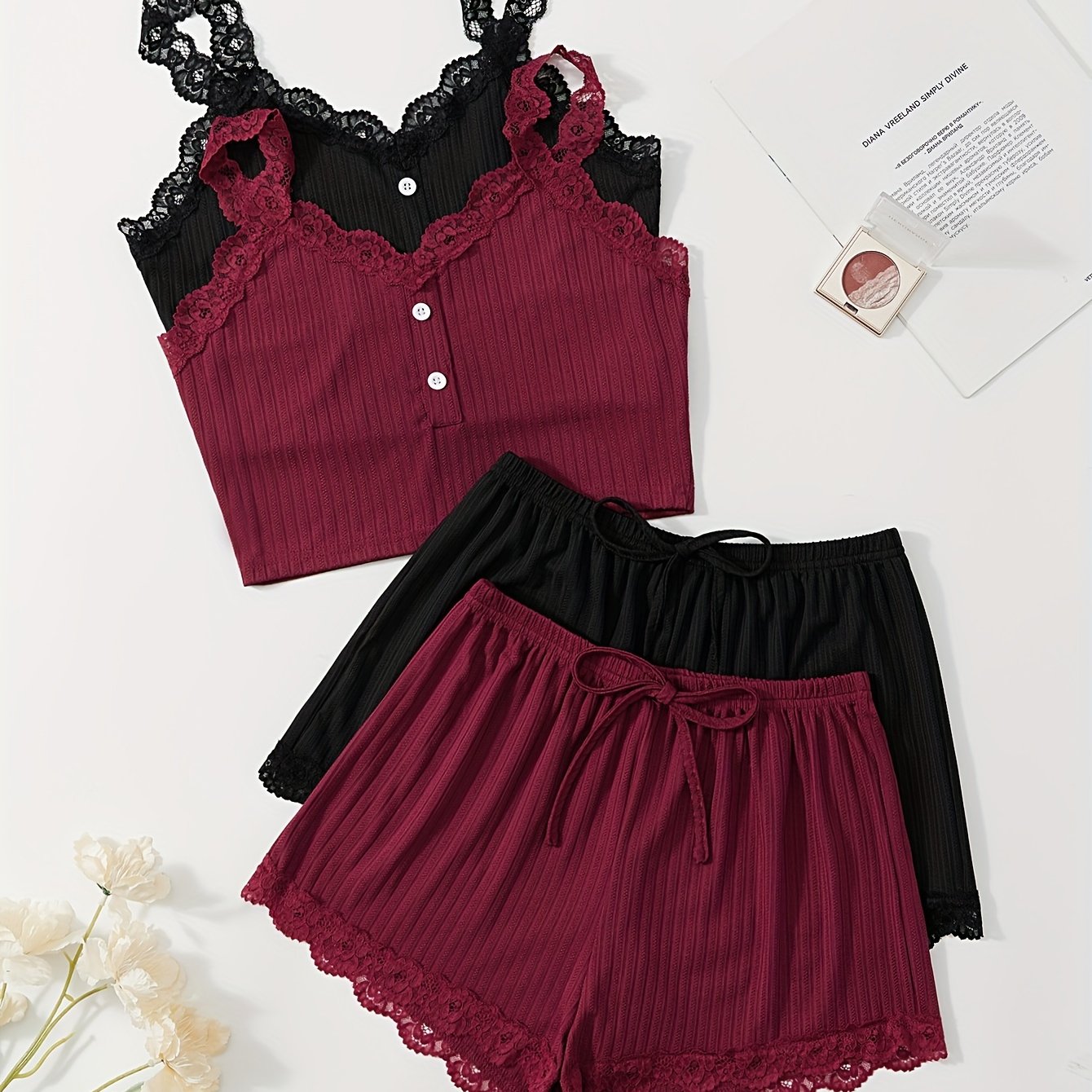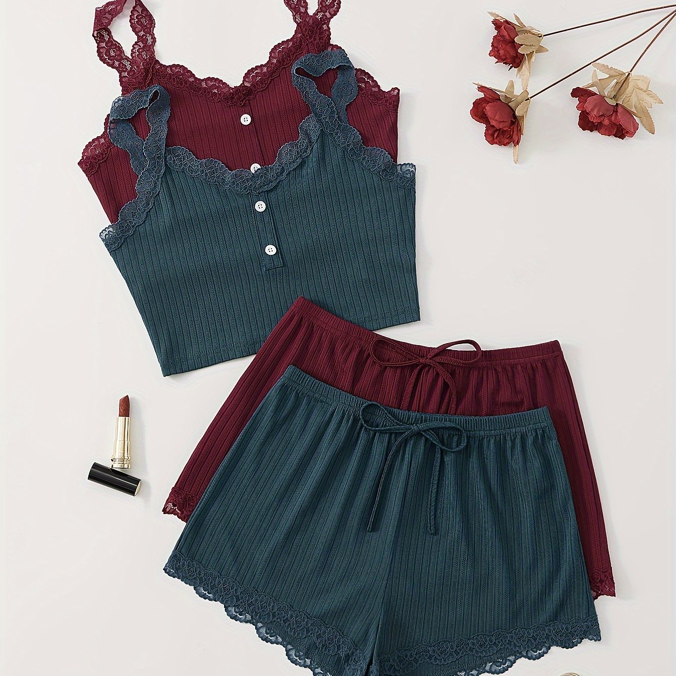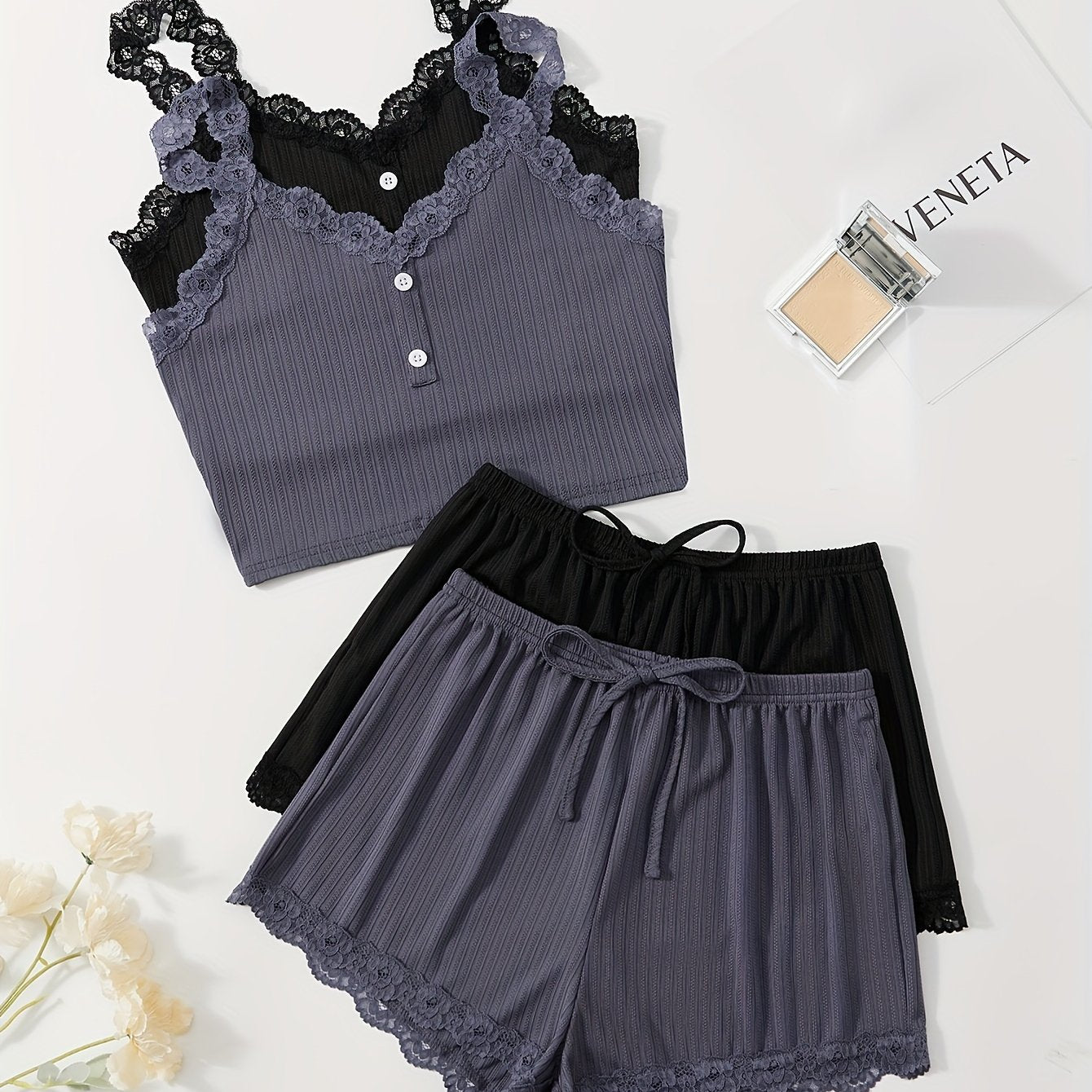 Ayollar uchun dantel bilan bezatilgan ribbed pijama to'plami, V-shaklidagi kamzuli yuqori va tortma belli shortlar bilan. Mashinada yuvish mumkin. Bir nechta ranglarda mavjud.
