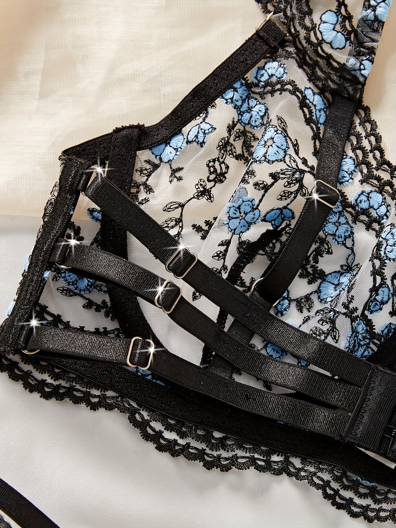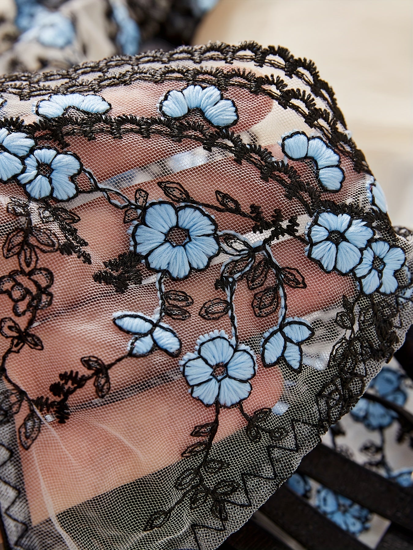 Xonimlar uchun ipdan to'qilgan va tasodifiy bosma bilan bezatilgan gullar bilan bezatilgan intim to'plami kattalar uchun mos keladi.