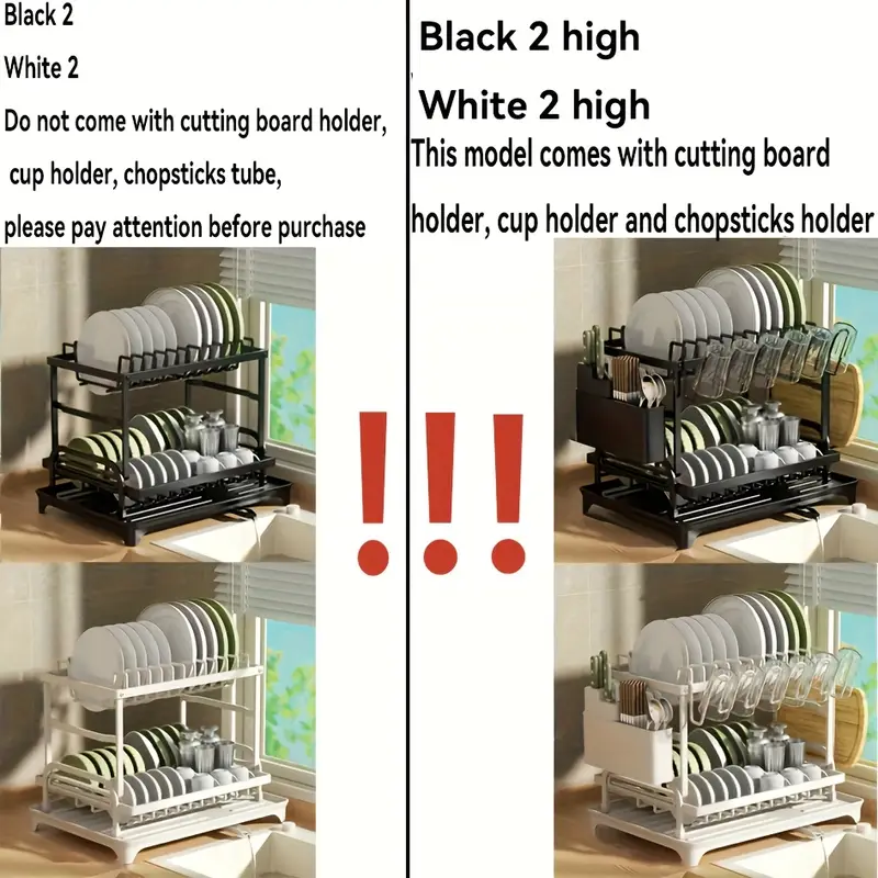 Katta 2 qatlamli idish quritish tokchasi, suyuq taxtasi bilan birga, stakan ushlagichi, idish ushlagichi va oshxonada idishlarni samarali quritish va tartibga solish uchun qo'shimcha drenaj tizimini o'z ichiga oladi.