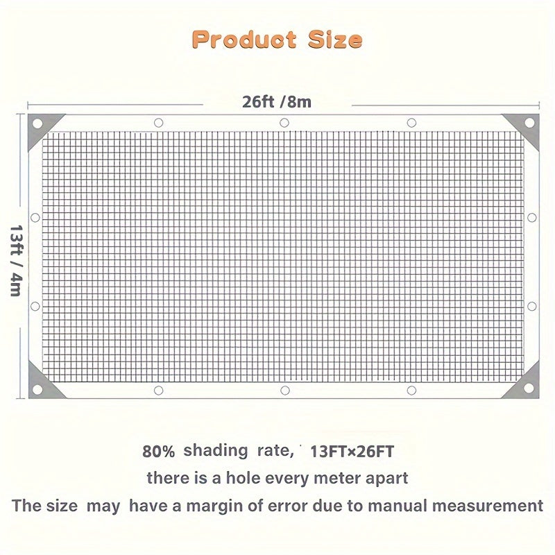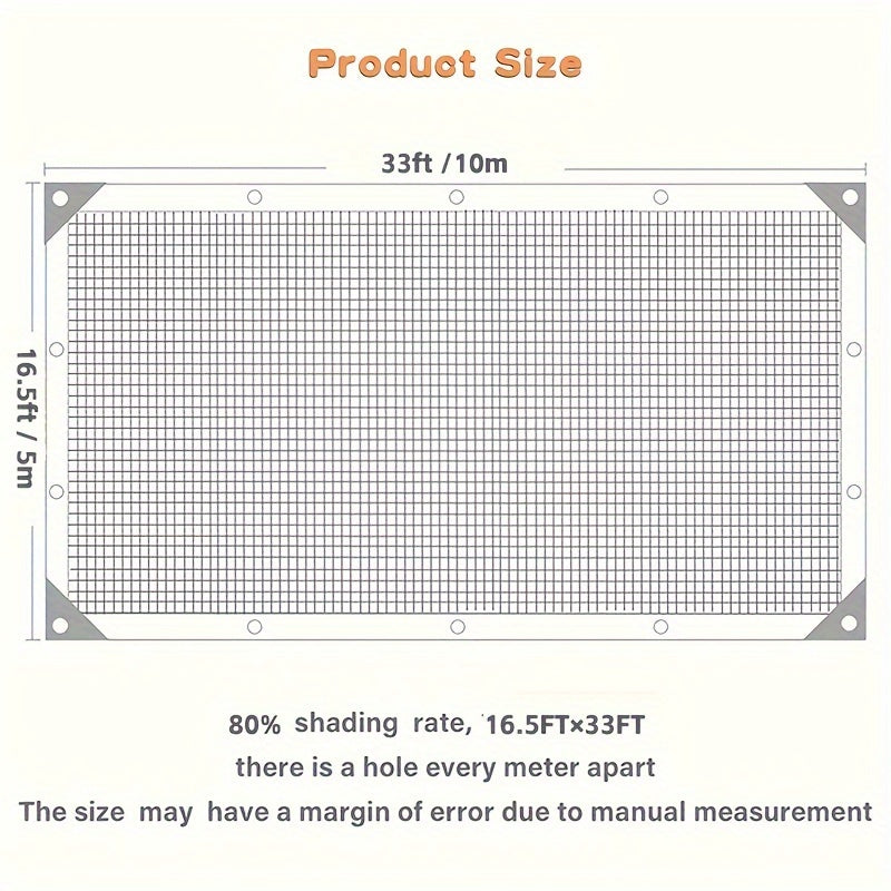 Katta qora quyoshdan himoya qiluvchi to'r, 5.03x10.06m va 3.96x7.92m o'lchamlarida mavjud bo'lib, issiqxona, patio, o'simliklar, gazebo va balkonlar uchun mo'ljallangan.