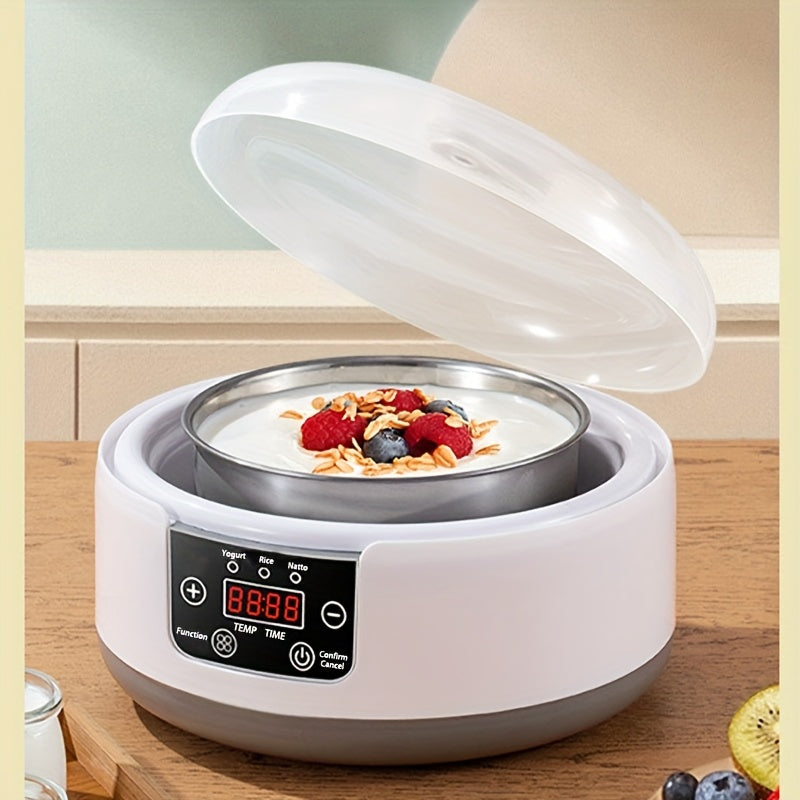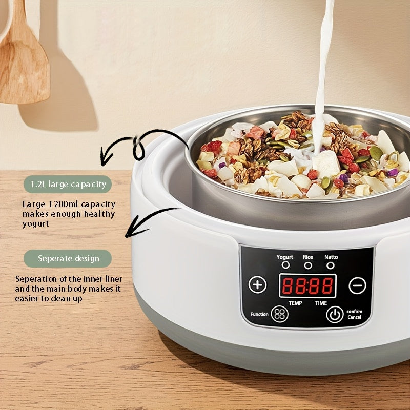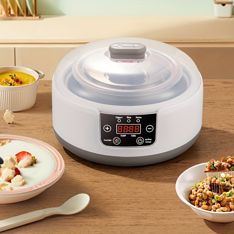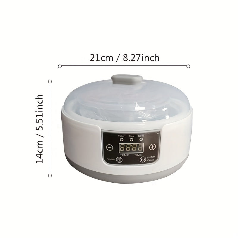 Raqamli displey bilan katta hajmli avtomatik yogurt tayyorlovchi, yogurt va fermentlangan oziq-ovqatlar uchun ideal. Kuzatuv talab qilinmaydi. Yevropa standarti rozetkasi. Shisha idish dizayni.