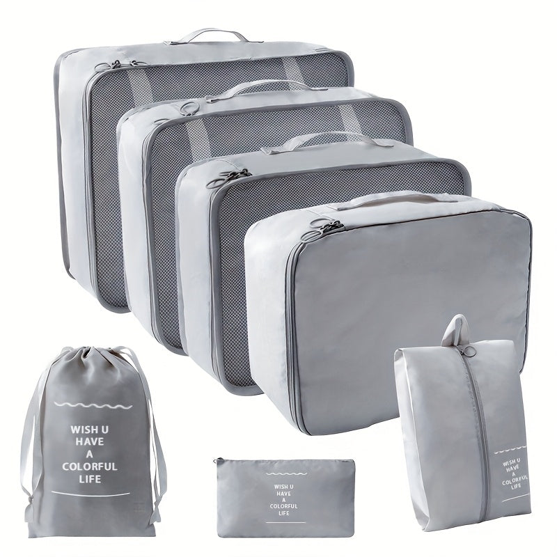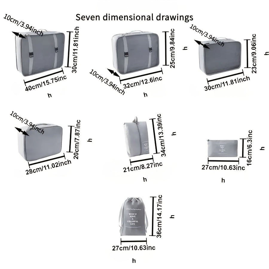 Katta sig'imli nylon sayohat tashkilotchisi to'plami bej va qora rangda, kiyim, poyabzal va paypoqlarni saqlash uchun 7 dona o'z ichiga oladi. Zipper yopilishi, tutqichlar va ko'chma xususiyatlariga ega.