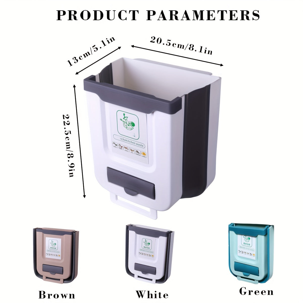 Oq va kulrang rangdagi oshxona shkaflari uchun katta egiluvchan osma axlat qutisi, ijodiy saralash xususiyati bilan. Joyni tejaydigan, devorga o'rnatiladigan dizayn elektr energiyasini talab qilmaydi. Toza dizaynga ega zamonaviy oshxona aksessuari.