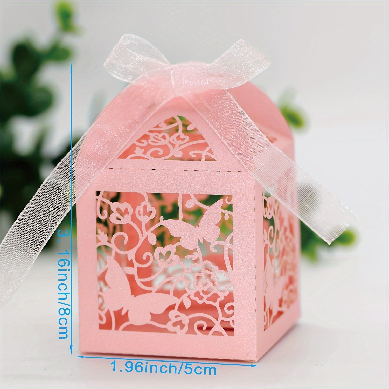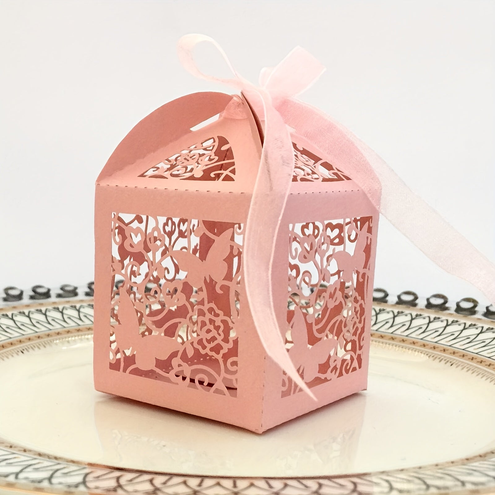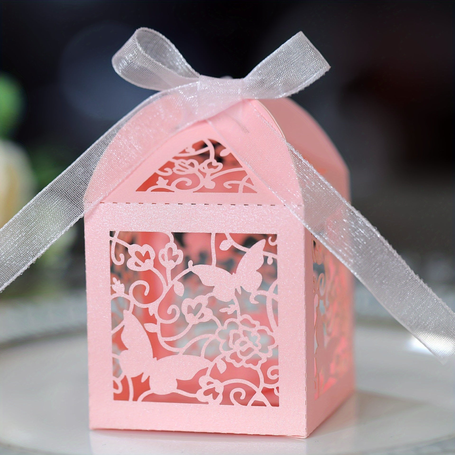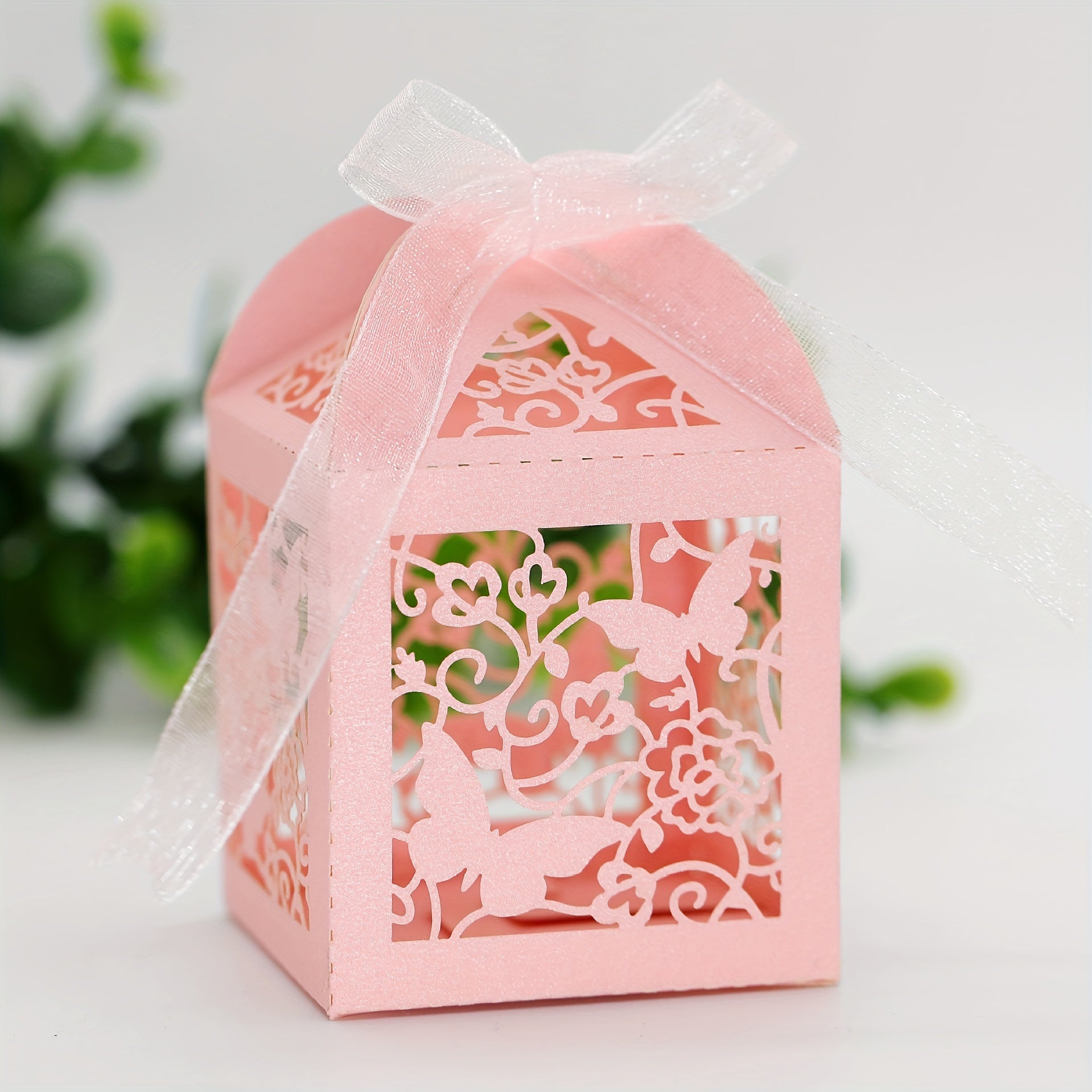 Pushti gullar va kapalak dizayni bilan lazer kesilgan shirinlik qutilari - 50 ta to'plam, lenta bilan, to'ylar, tug'ilgan kunlar va kelin to'ylariga ideal