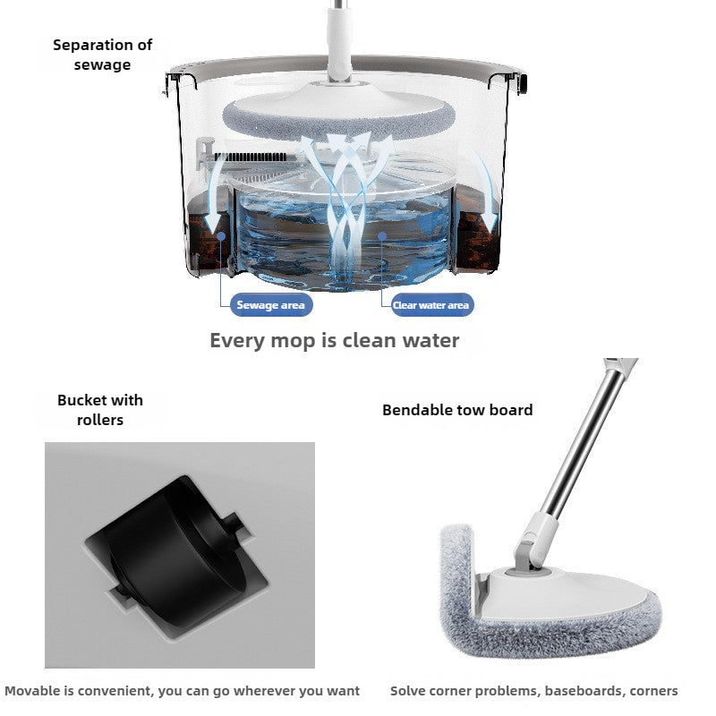 Uy tozalash uchun dangasa aylanuvchi mopu, chelak bilan, qo'l bilan yuvish uchun bepul va ifloslanishni ajratish texnologiyasi. Bir marta tortish bilan tekis polni tozalash uchun 4 dona o'z ichiga oladi.