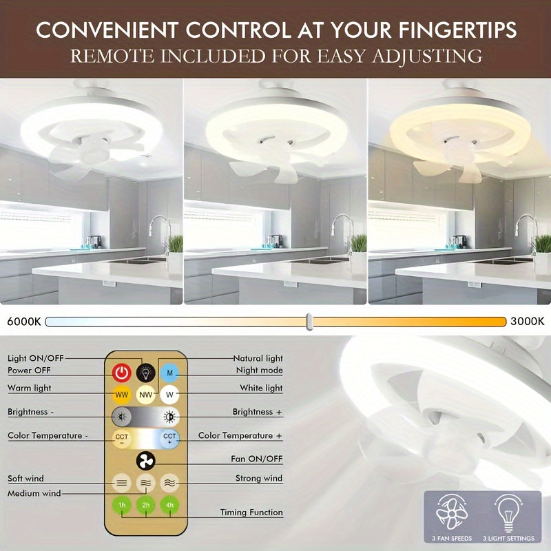 LED aylanuvchi fan yorug'ligi, rang, shamol tezligi va vaqtni sozlash funksiyasi bilan, masofadan boshqarish pulti orqali boshqariladi. Yotoqxona, o'qish xonalari va ofislar uchun ideal.